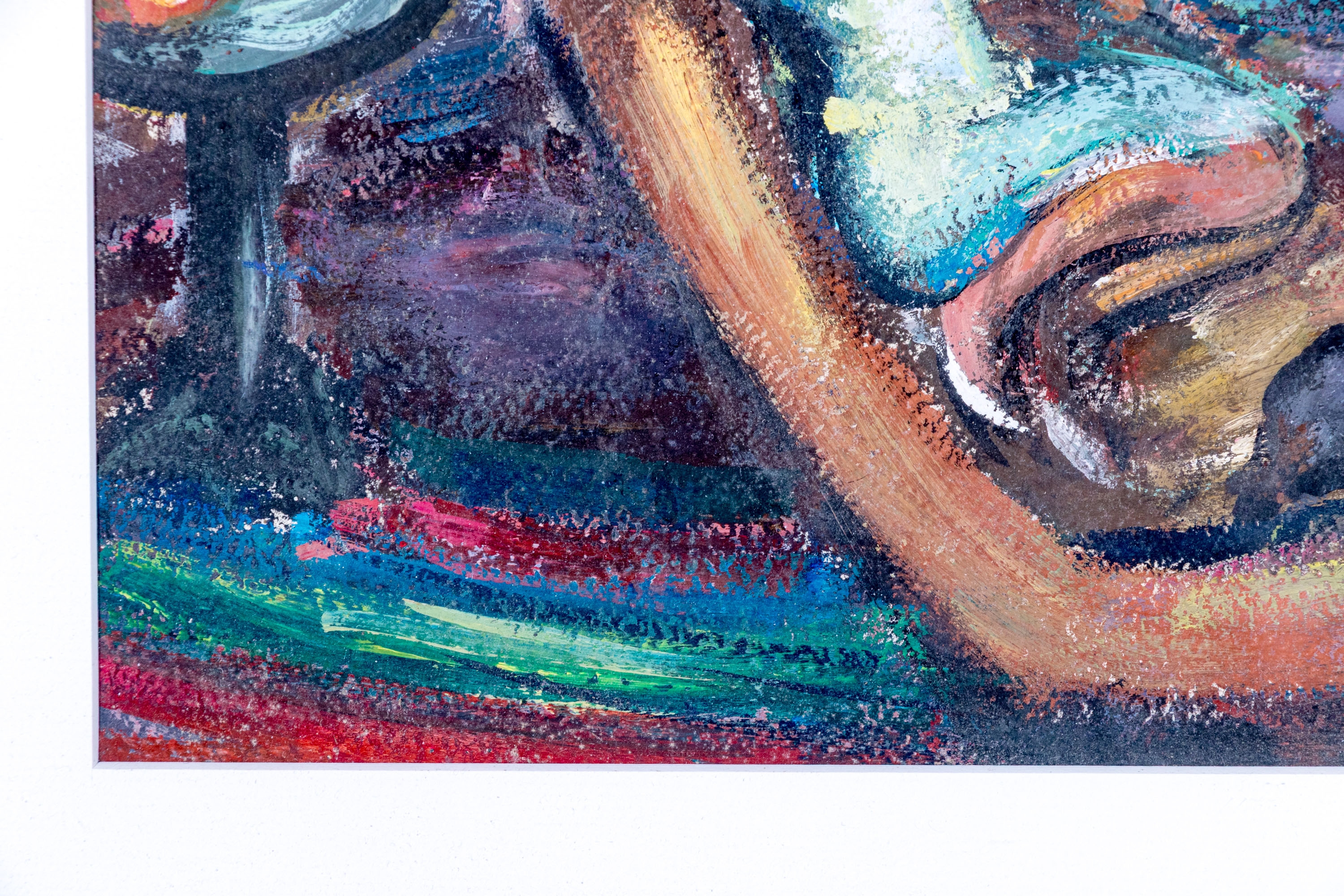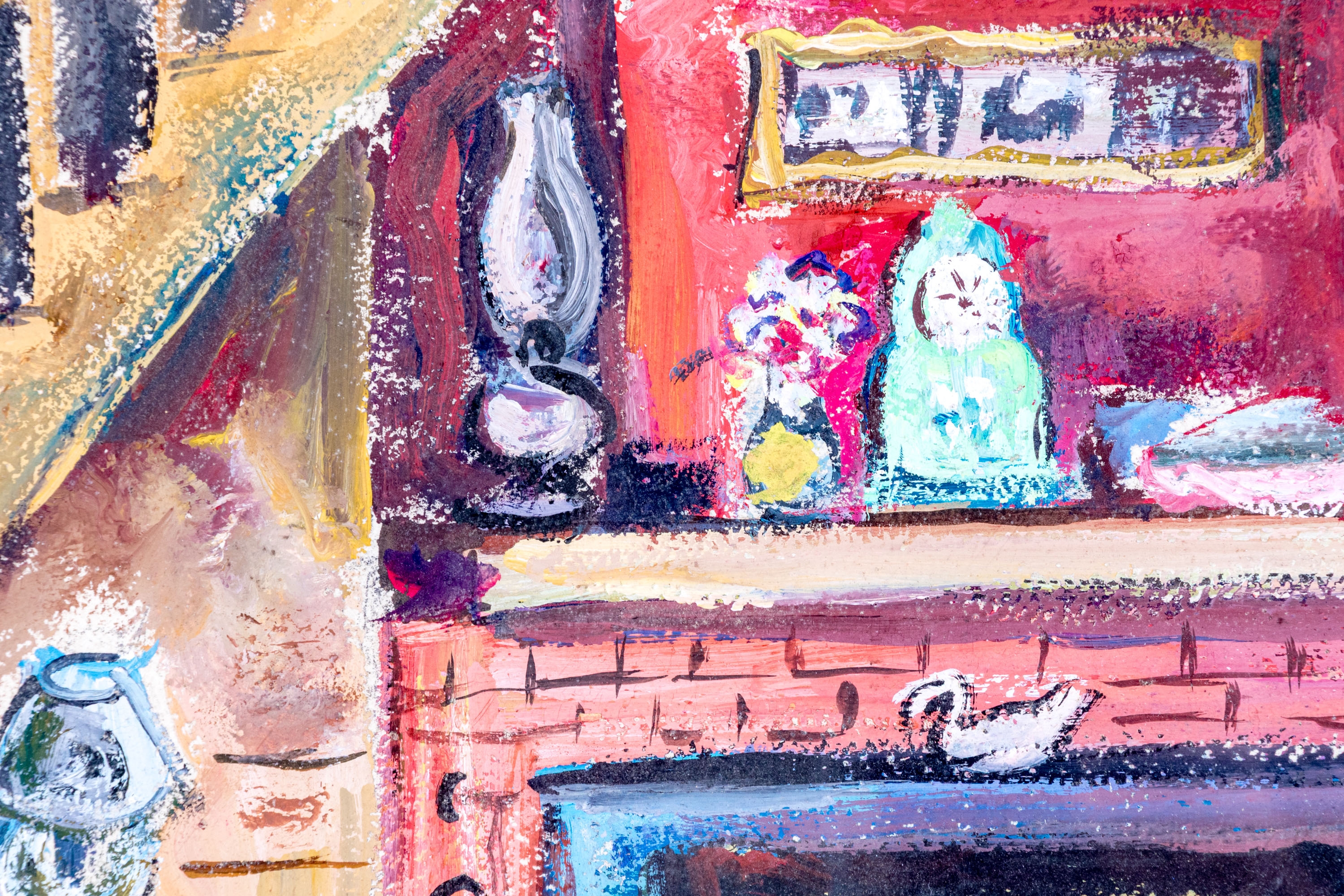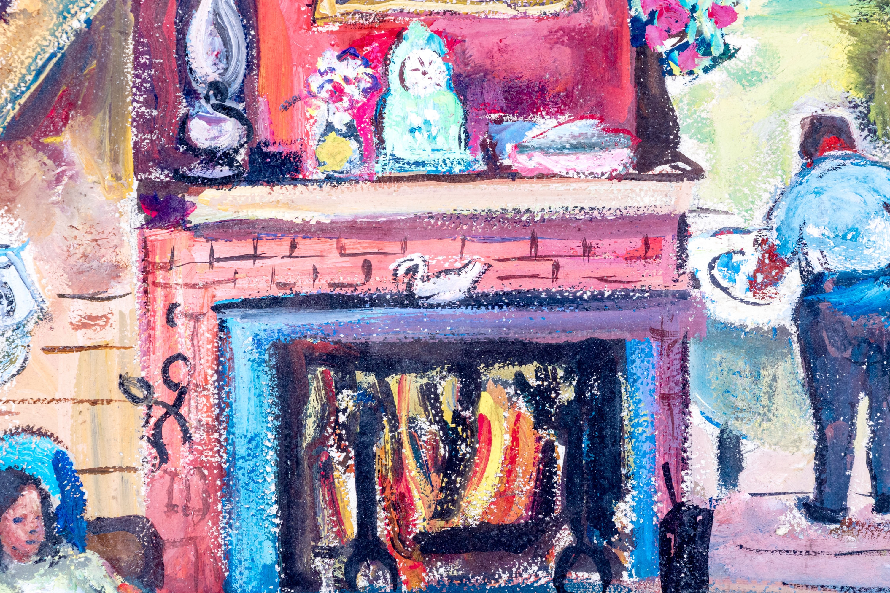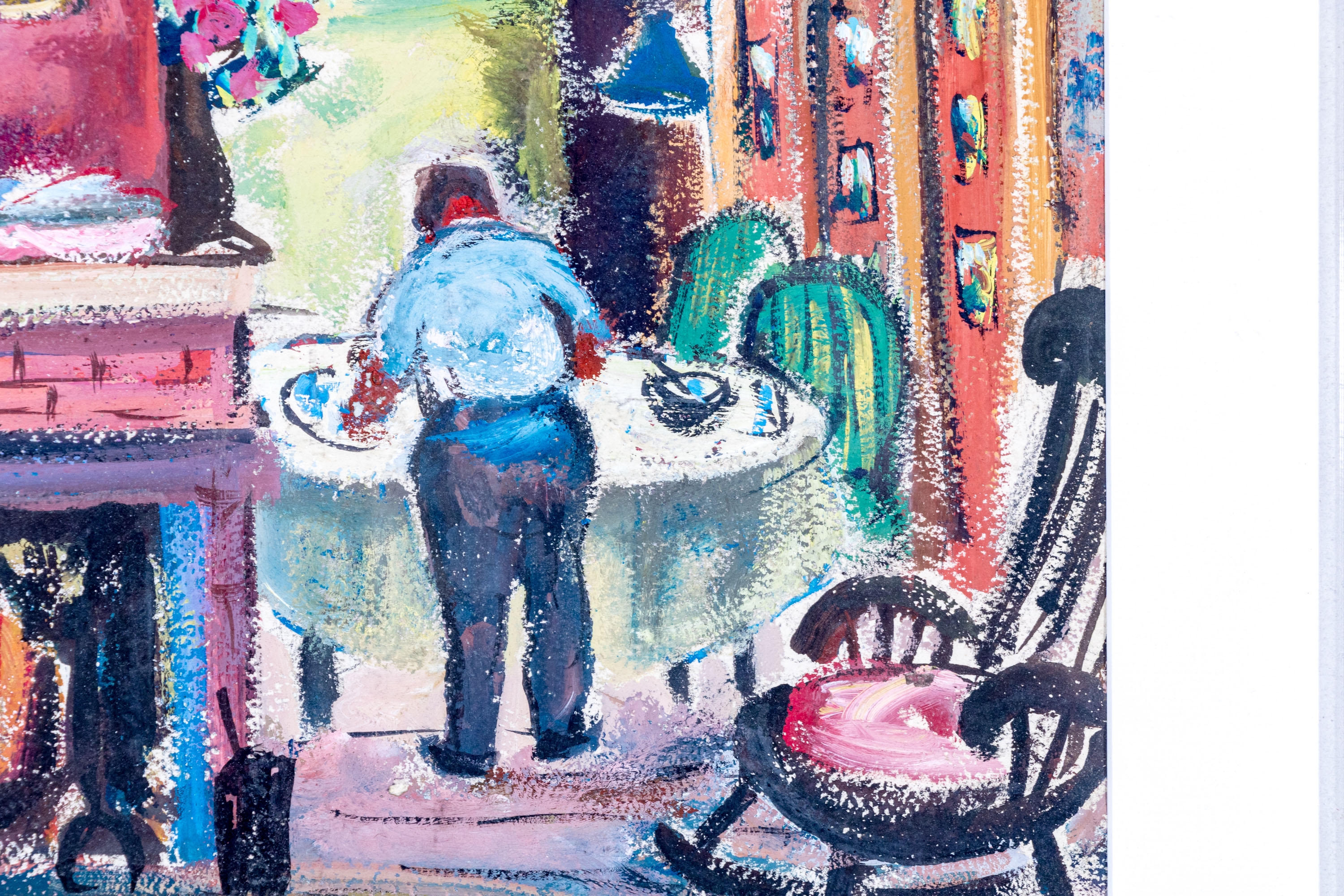 A wonderful pastel or crayon on paper illustration of an interior scene with a woman reclining on a brown couch with a black dog over a colorful striped round carpet in front of a fireplace, leading to a view of a man setting a white dining table with green chairs. Beautifully rendered with excellent character and expression. Pencil signed lower right.