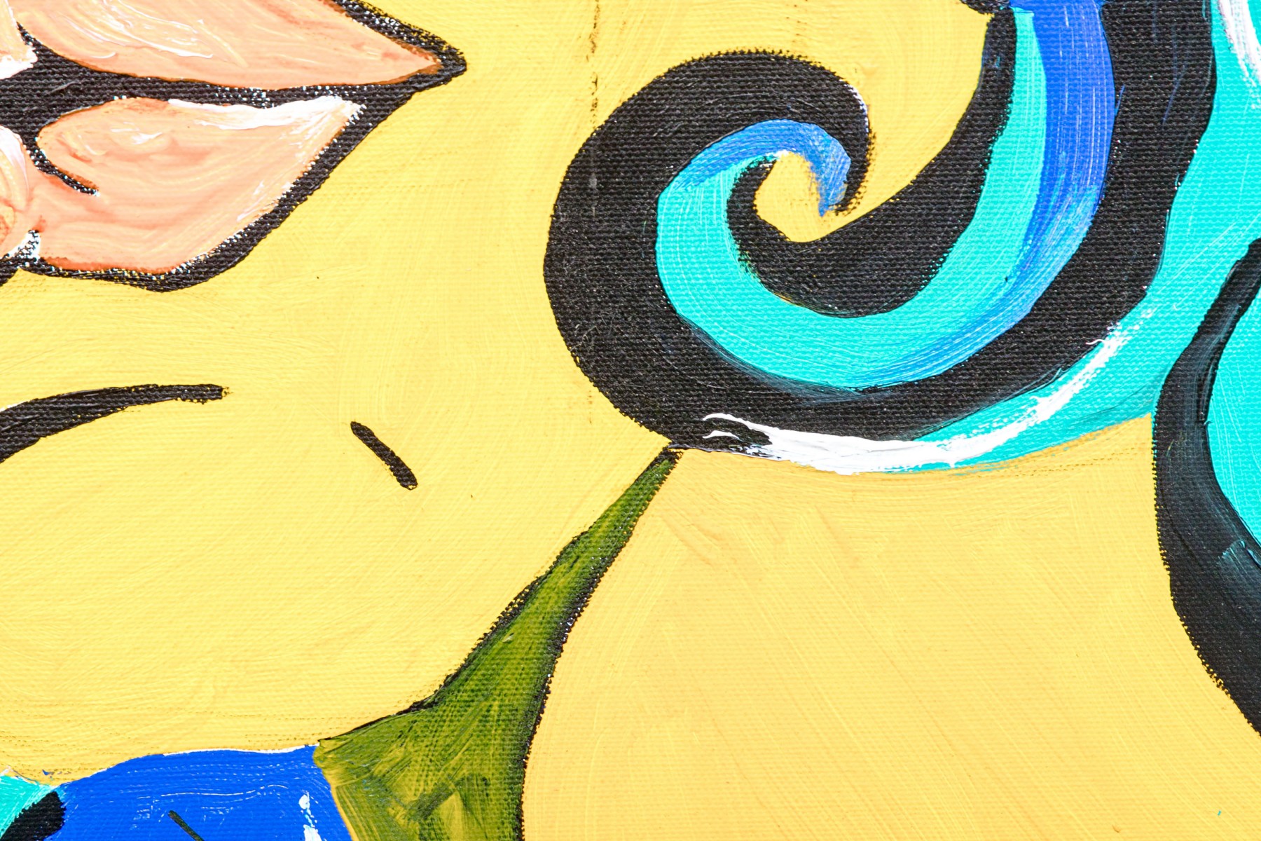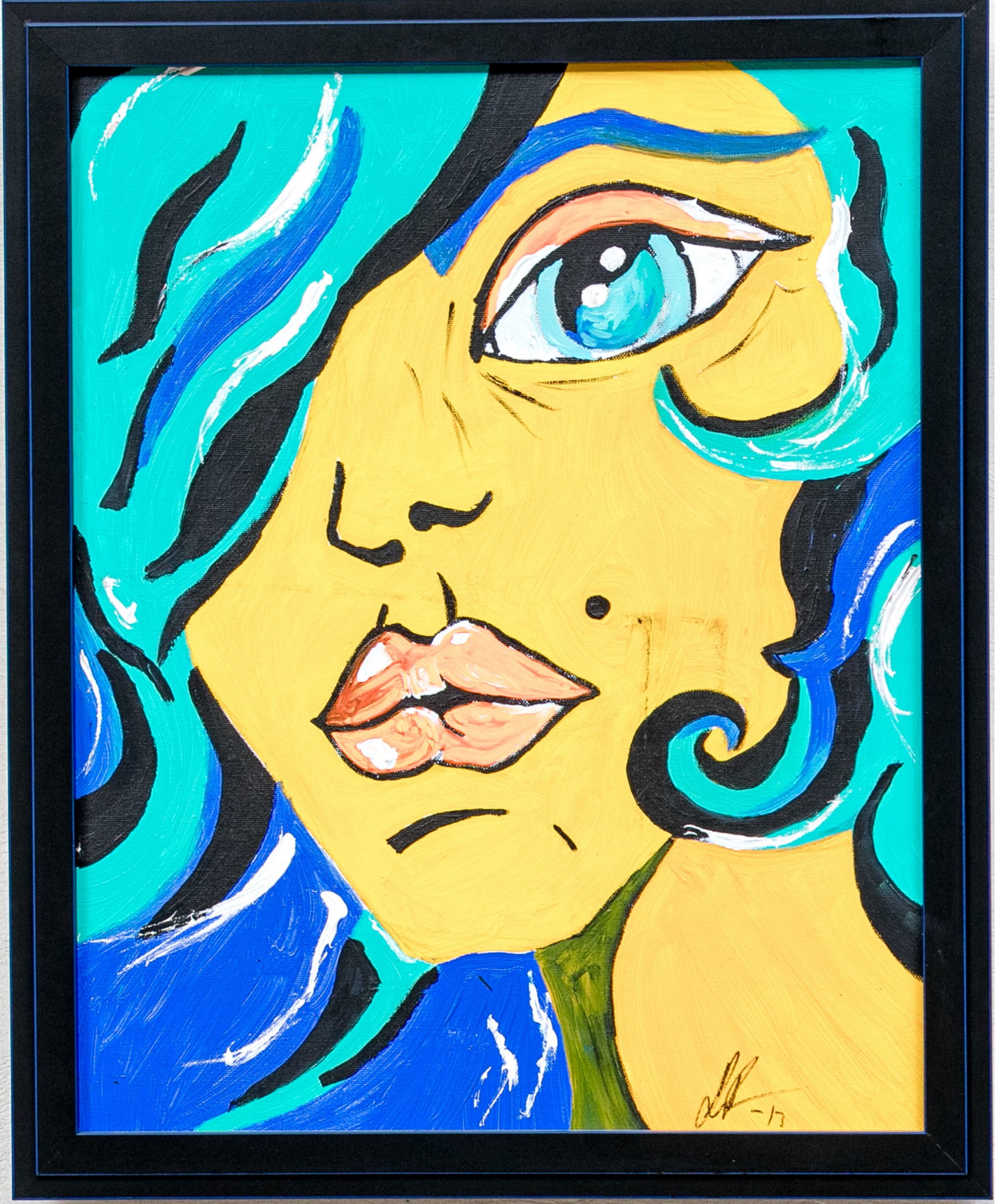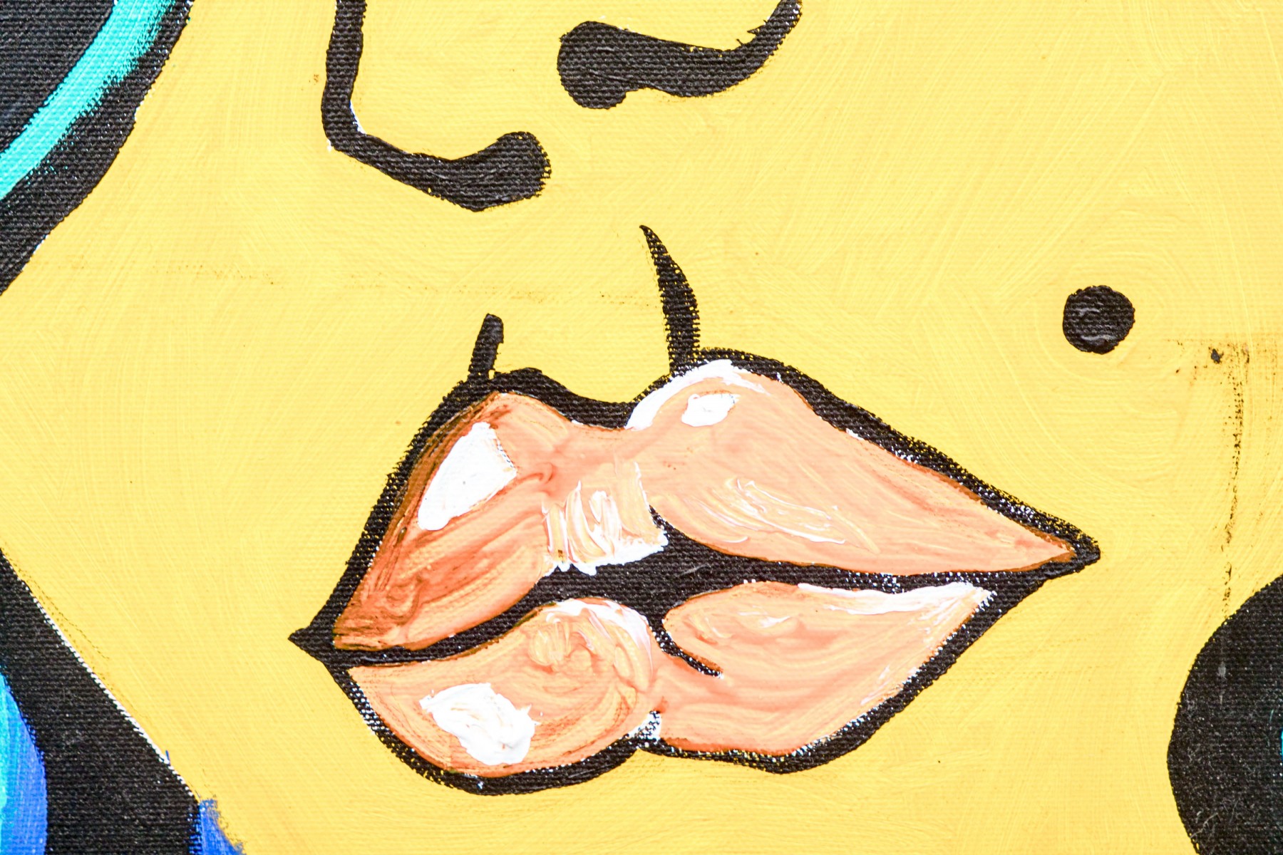 Signed and dated 13 lower right. A fun Pop Art style full face of a red lipped gal. Presented in a black frame.