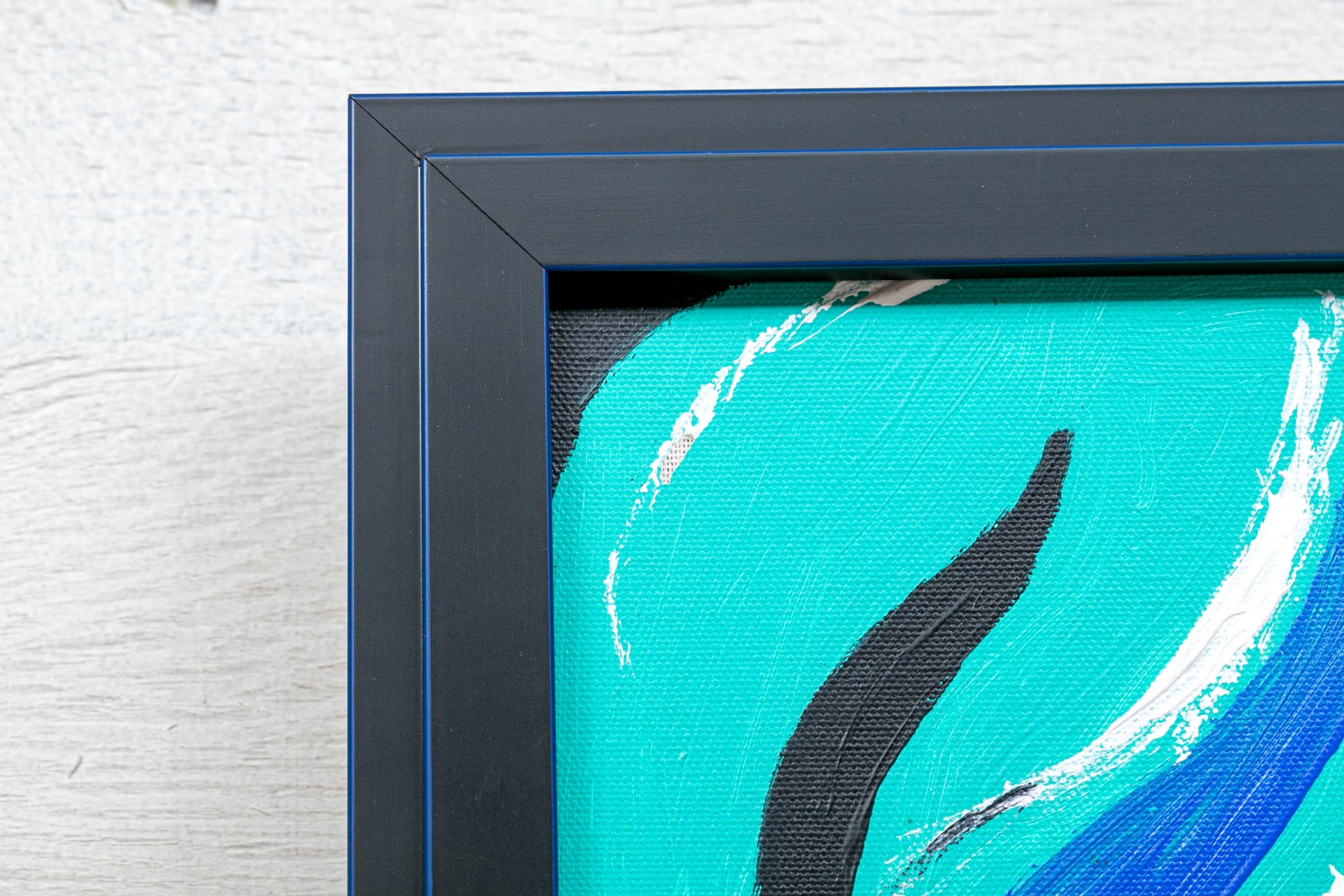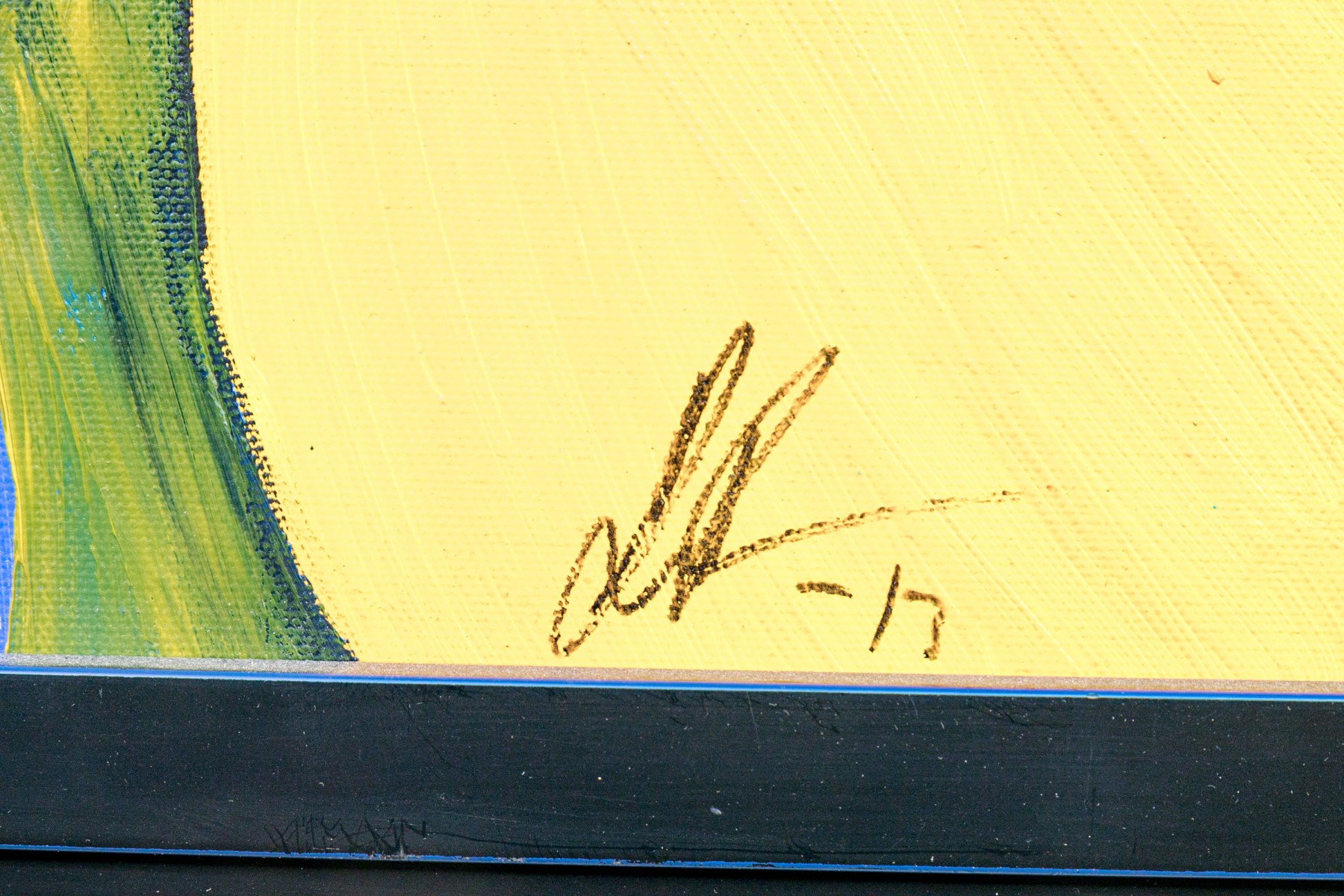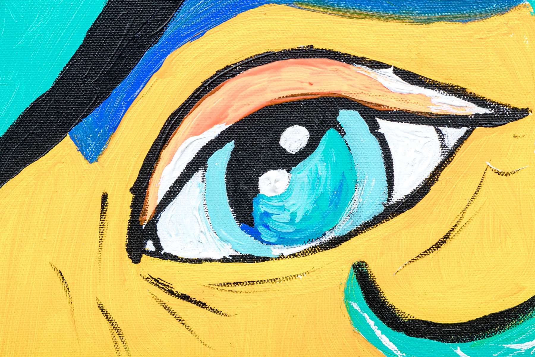 Signed and dated 13 lower right. A fun Pop Art style full face of a red lipped gal. Presented in a black frame.