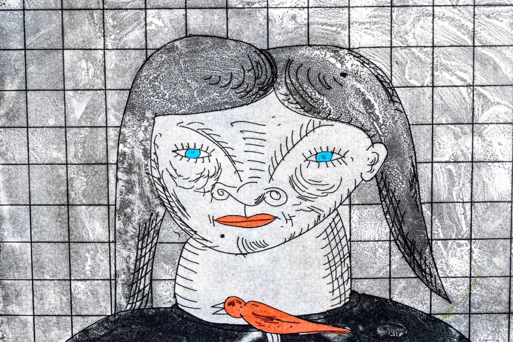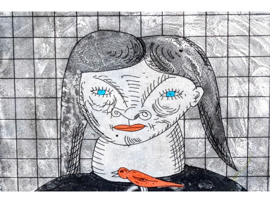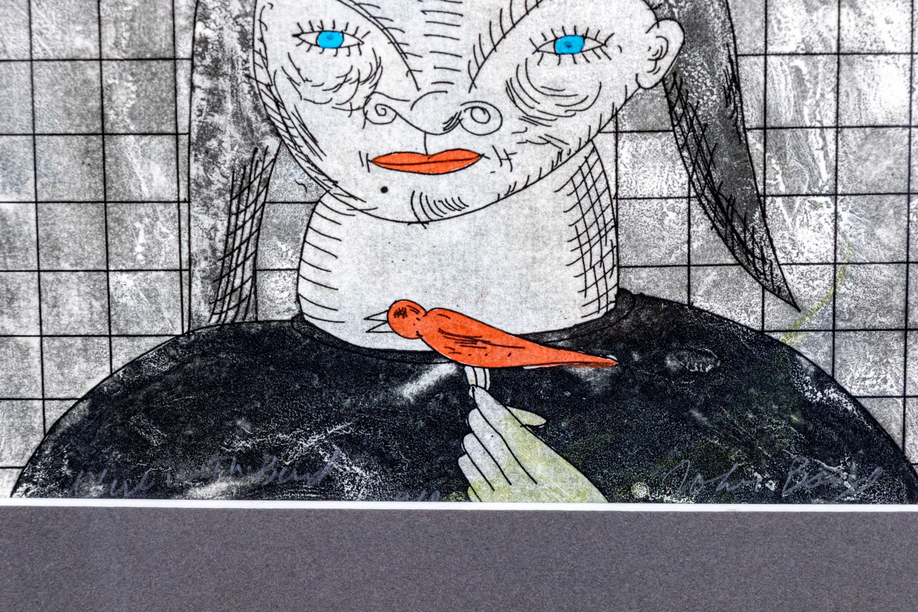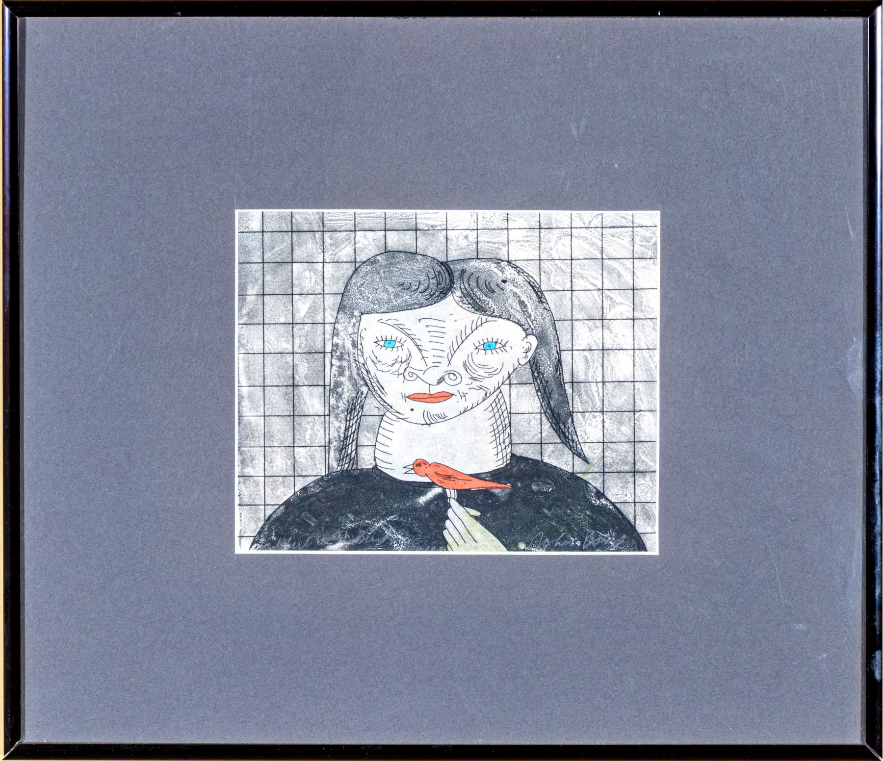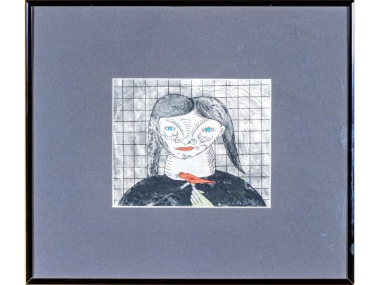 Signed indistinctly lower right (perhaps John Boyd). Titled lower left (....with Bird). An eye-catching print depicting a stylized girl with black pigtails wearing black while holding a small red bird perched on her fingertips, matching bright red lips and contrasting vibrant blue eyes as she poses against a gray grid background.