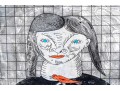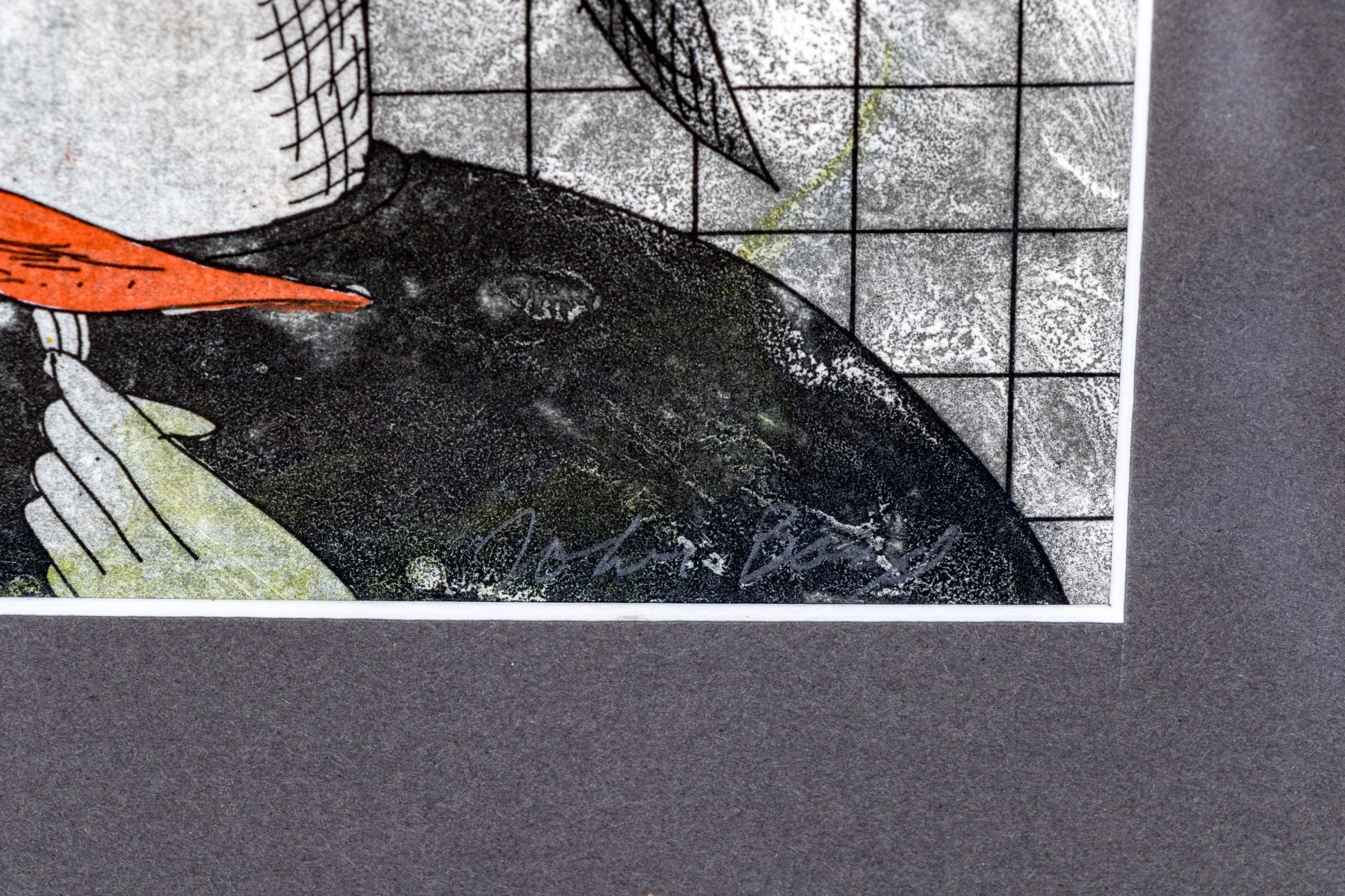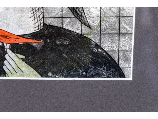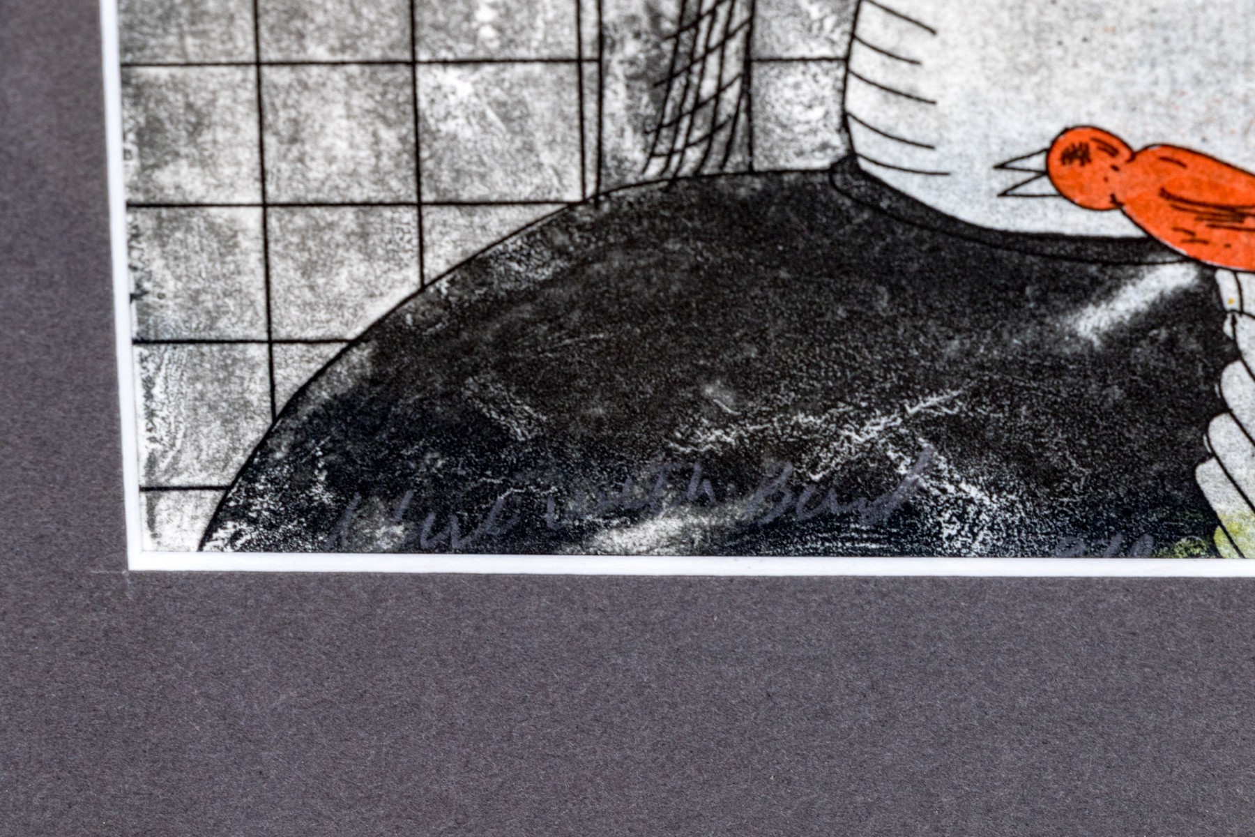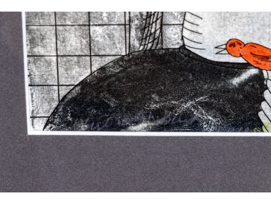 Signed indistinctly lower right (perhaps John Boyd). Titled lower left (....with Bird). An eye-catching print depicting a stylized girl with black pigtails wearing black while holding a small red bird perched on her fingertips, matching bright red lips and contrasting vibrant blue eyes as she poses against a gray grid background.