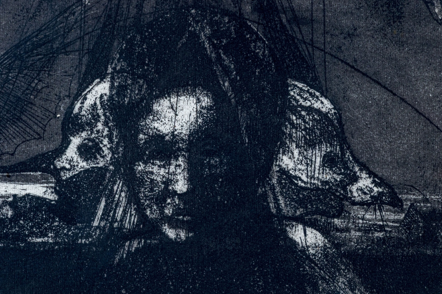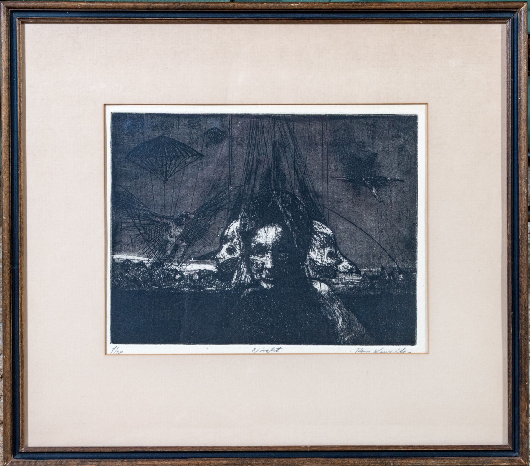 An eye-catching print entitled "Night" depicting a surrealist scene of a figure facing forward and two figures in profile at the sides standing against a dark natural landscape with figures and parachutes in the sky. Pencil signed lower right partially appearing "Ron K.," titled lower center, and numbered 4/20 lower left.