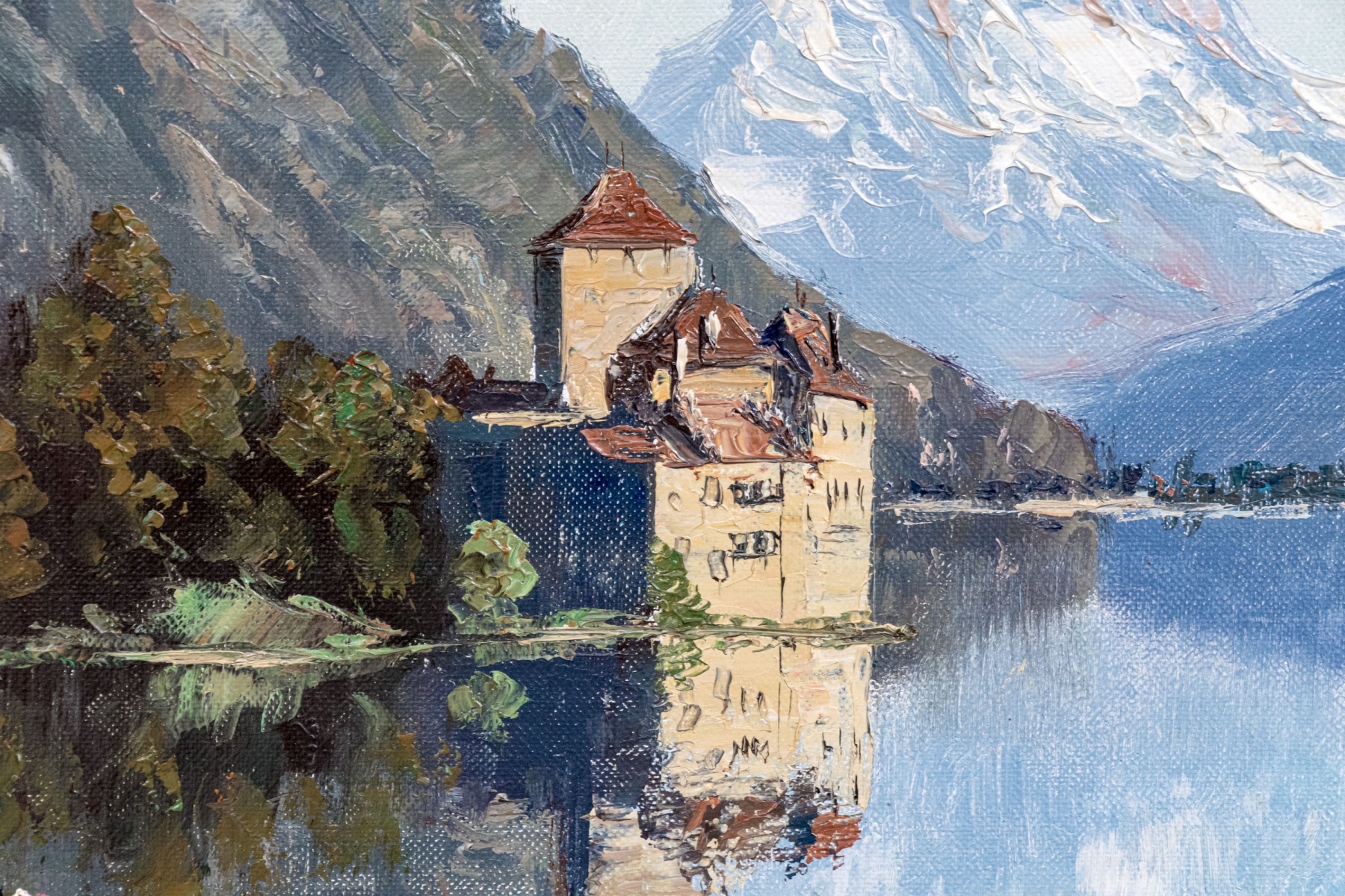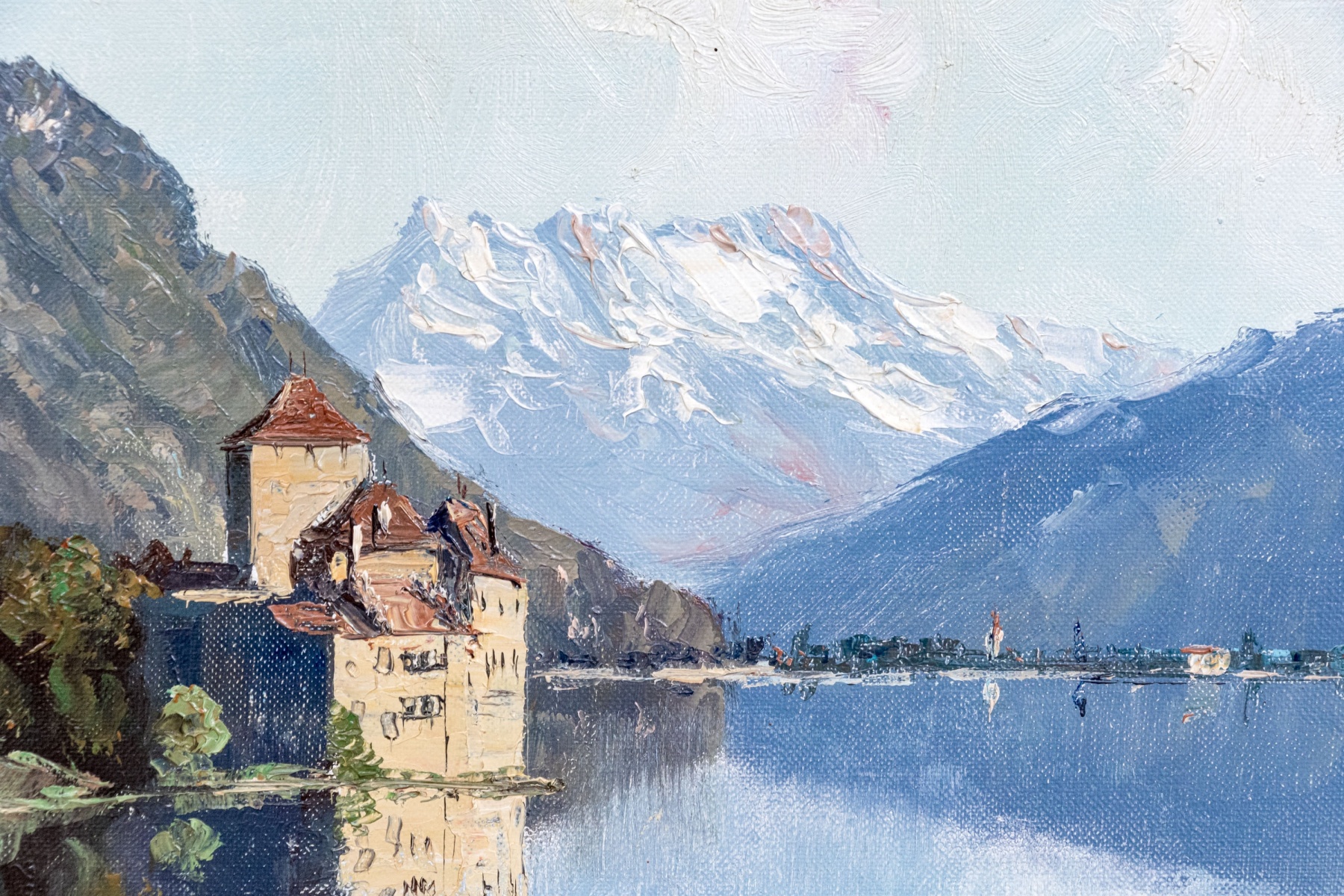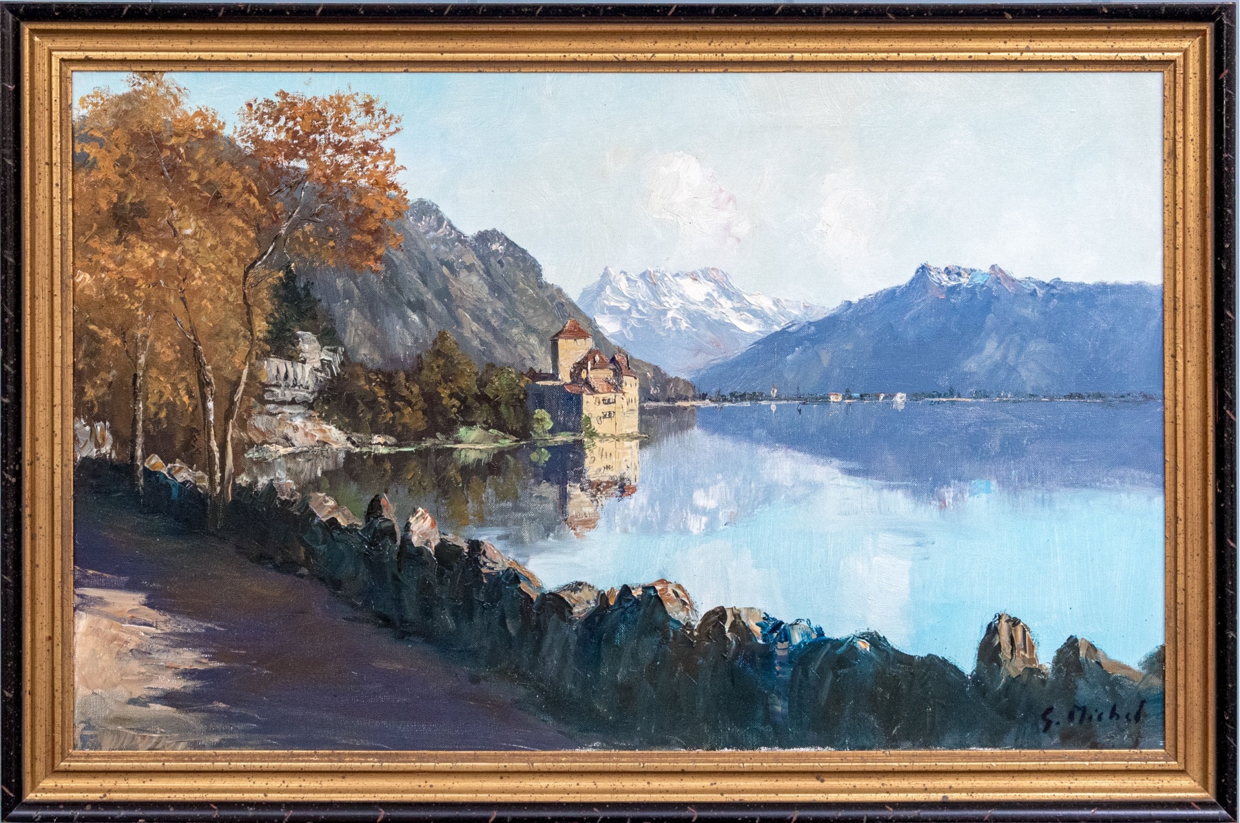 A beautifully rendered impressionist oil painting on canvas depicting a majestic view of Chillon Castle in Switzerland with seen in the distance from a dirt path with a stone fence overlooking a vast, calm light blue lake flanked by autumnal trees leading the eye up to icy mountains on the horizon beneath a pale sky. Signed S. Michel lower right.