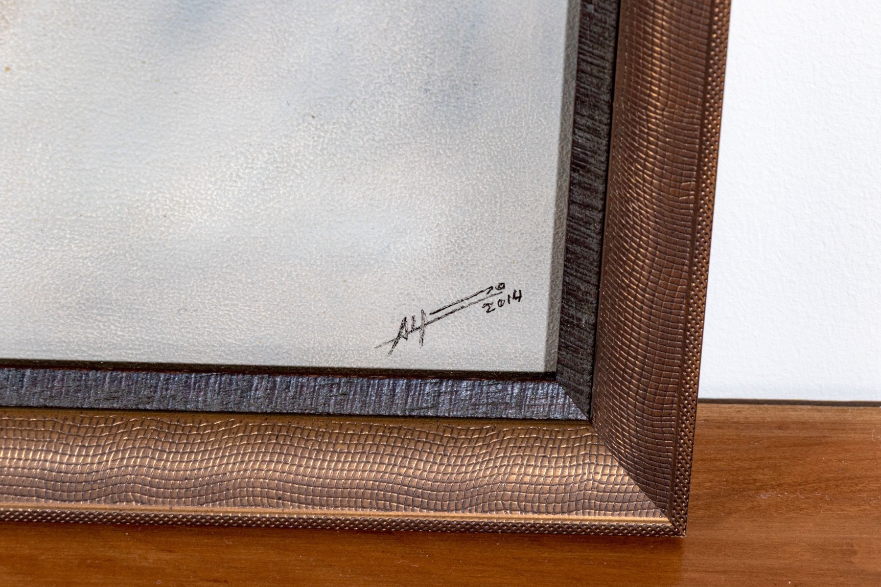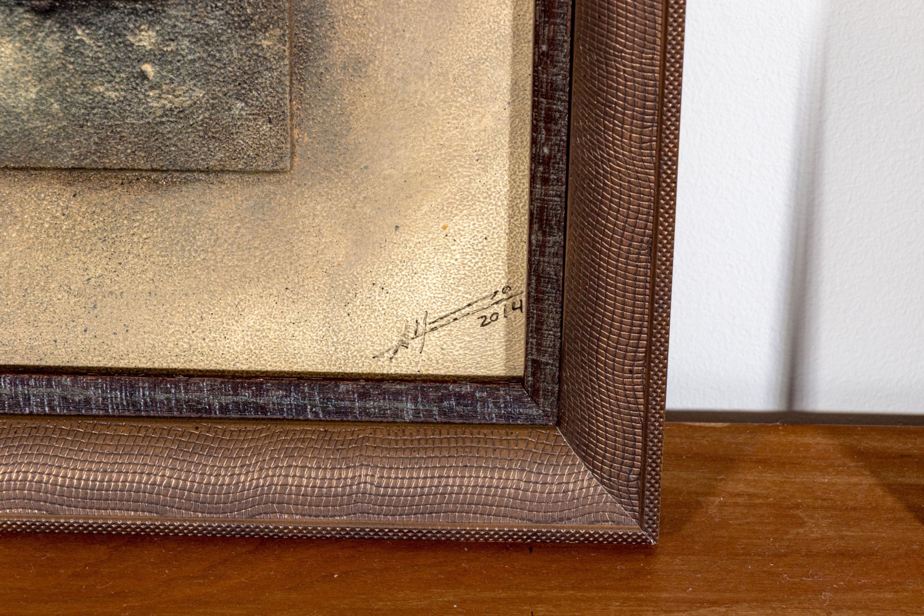 Displayed displayed in lizard skin textured frames with bronze finishes.