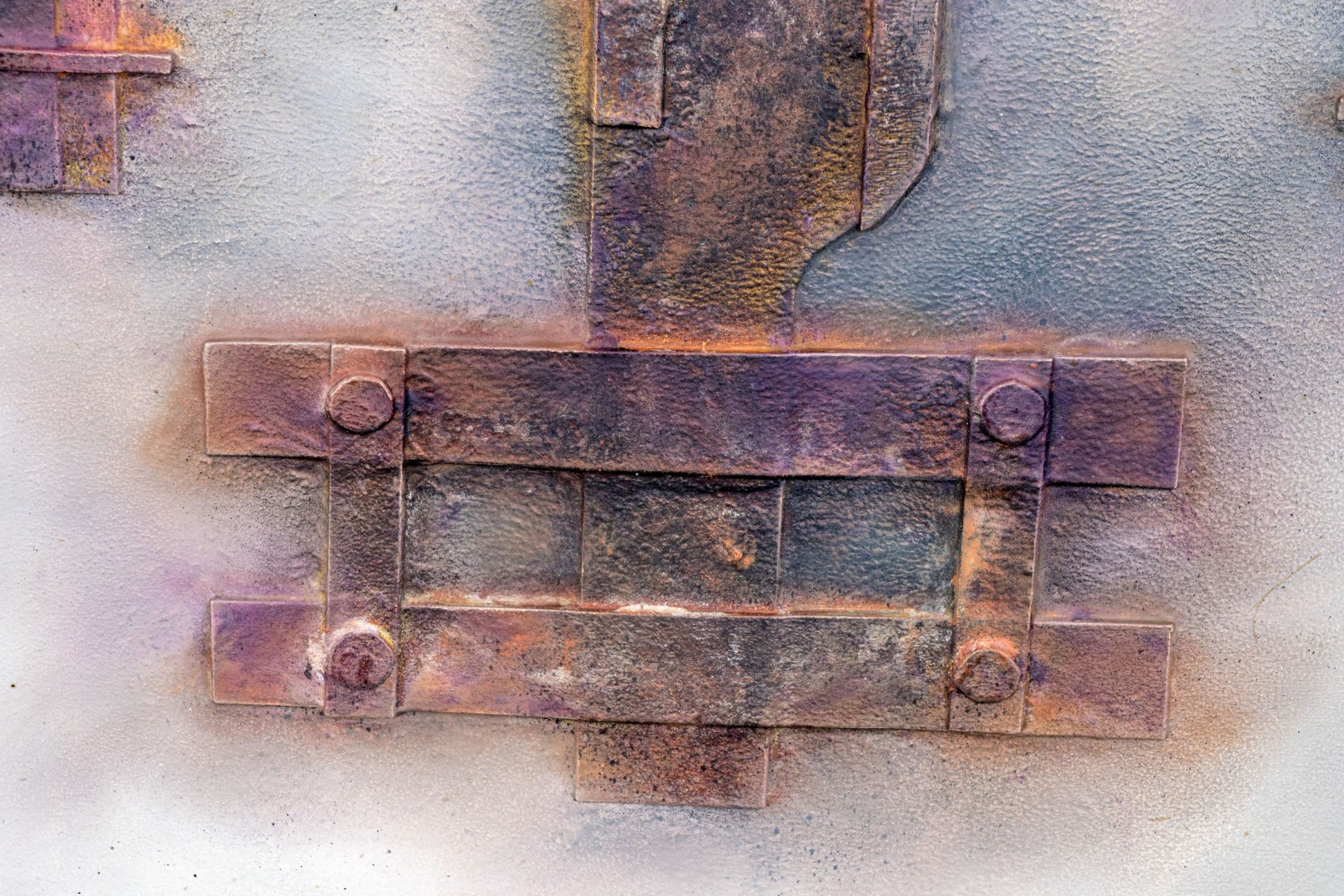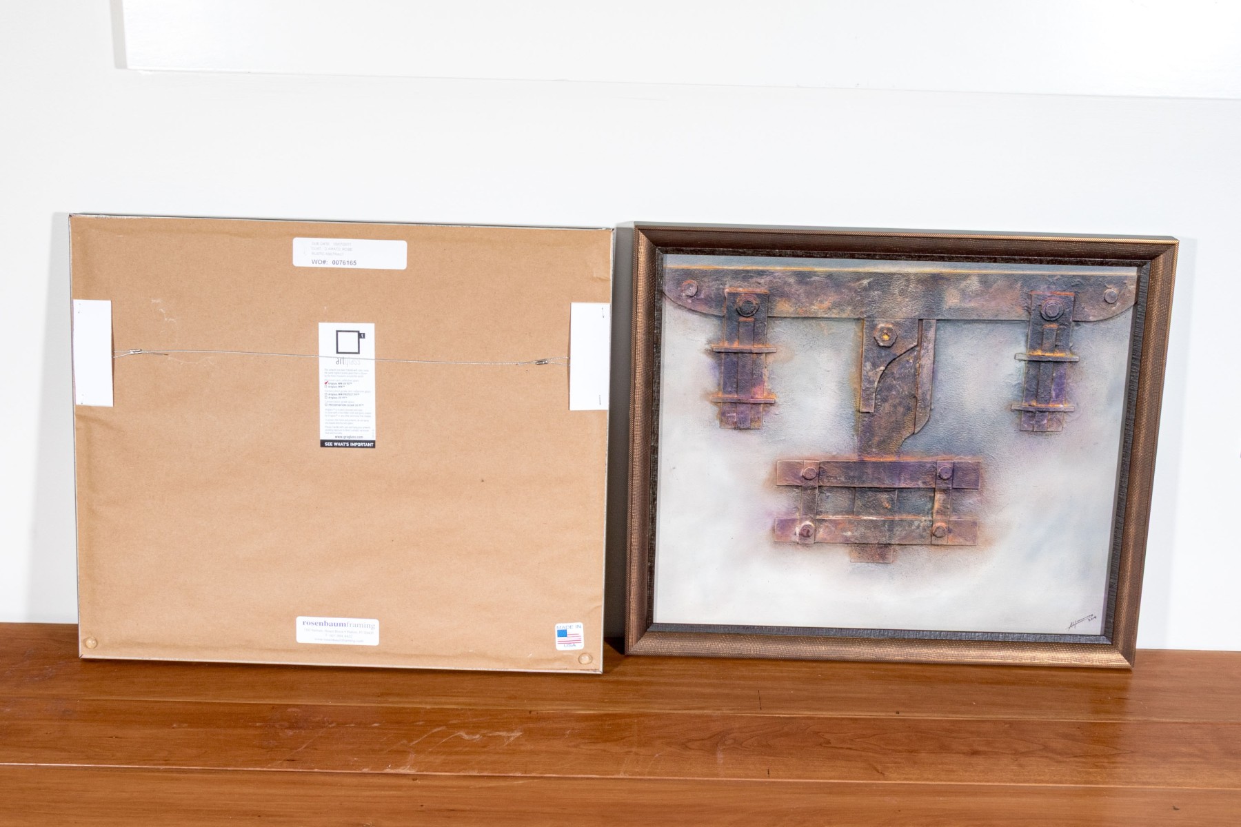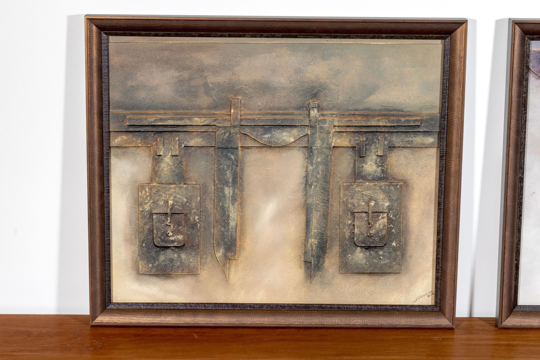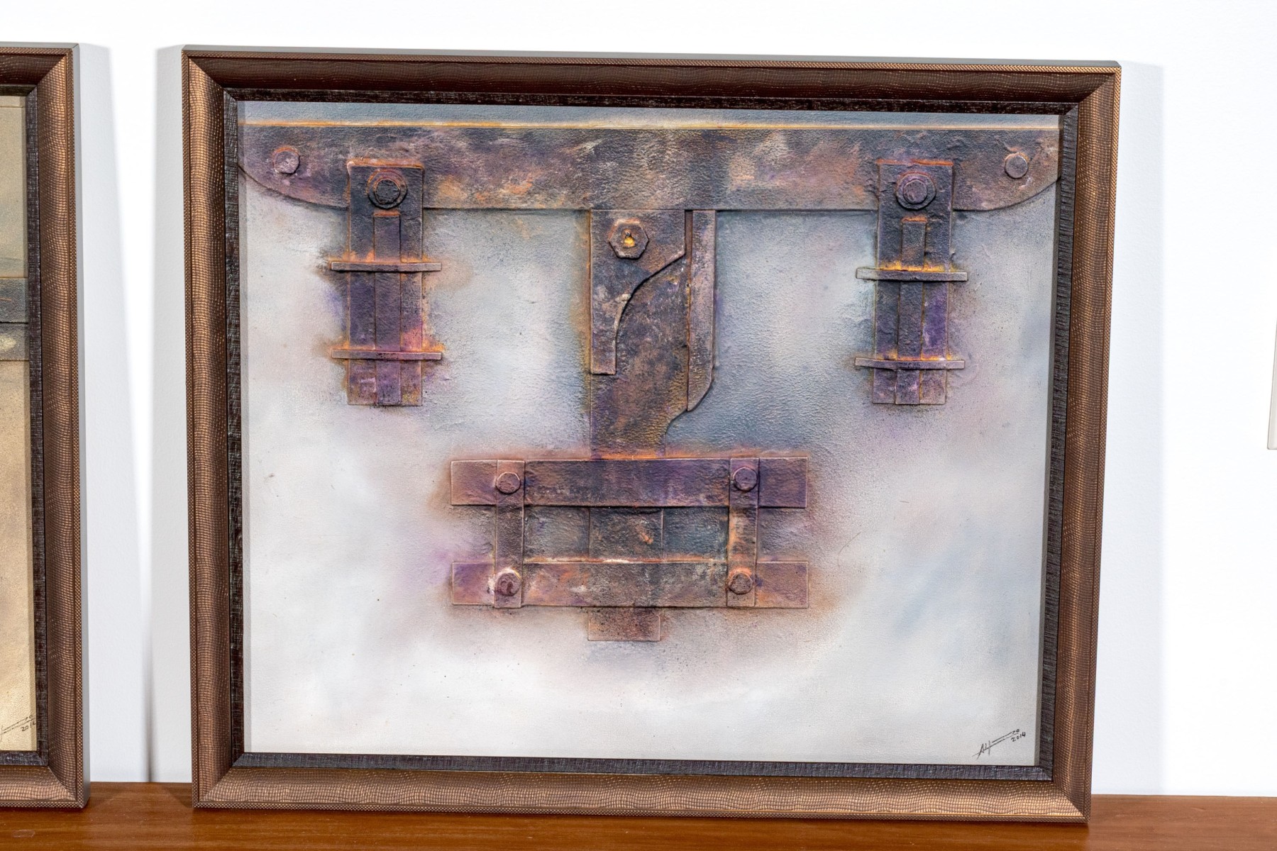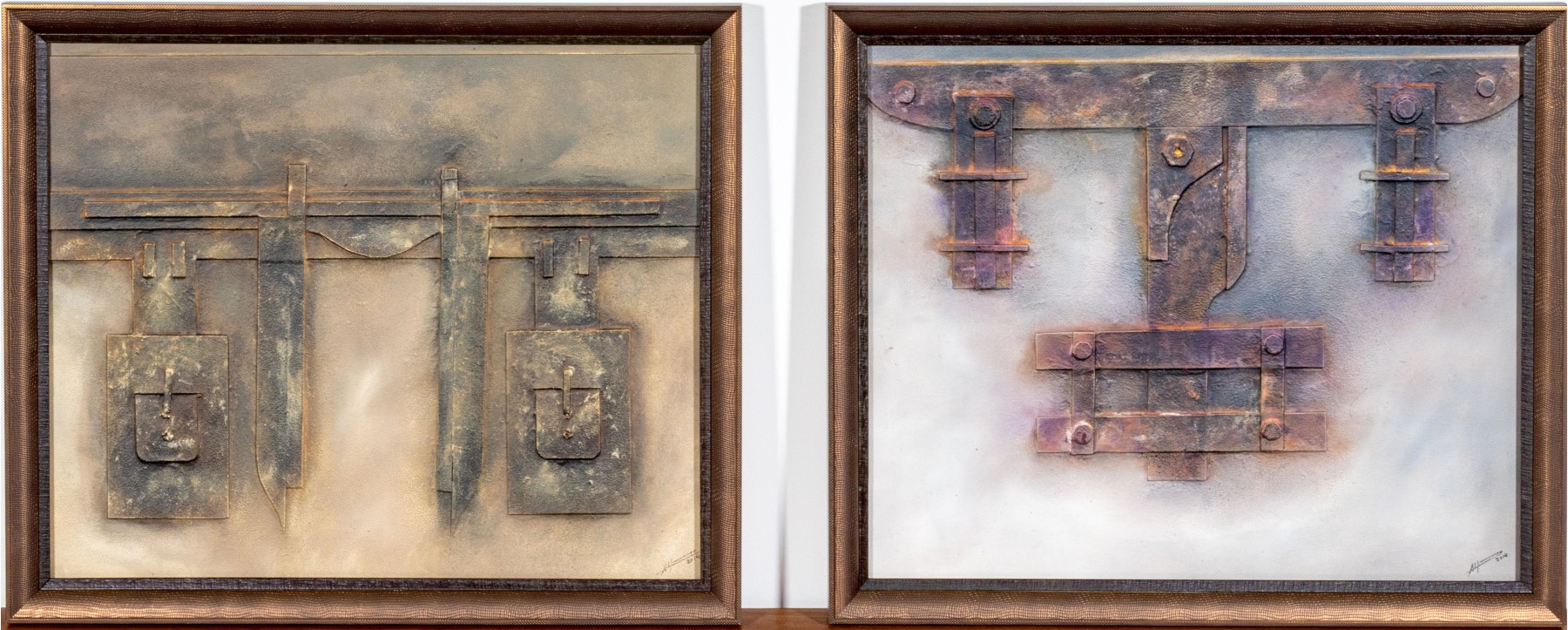 An eye-catching duo of mixed media works depicting industrial mechanisms in relief with great textural hues in gray, yellow, and pink. Both signed and dated 2014.