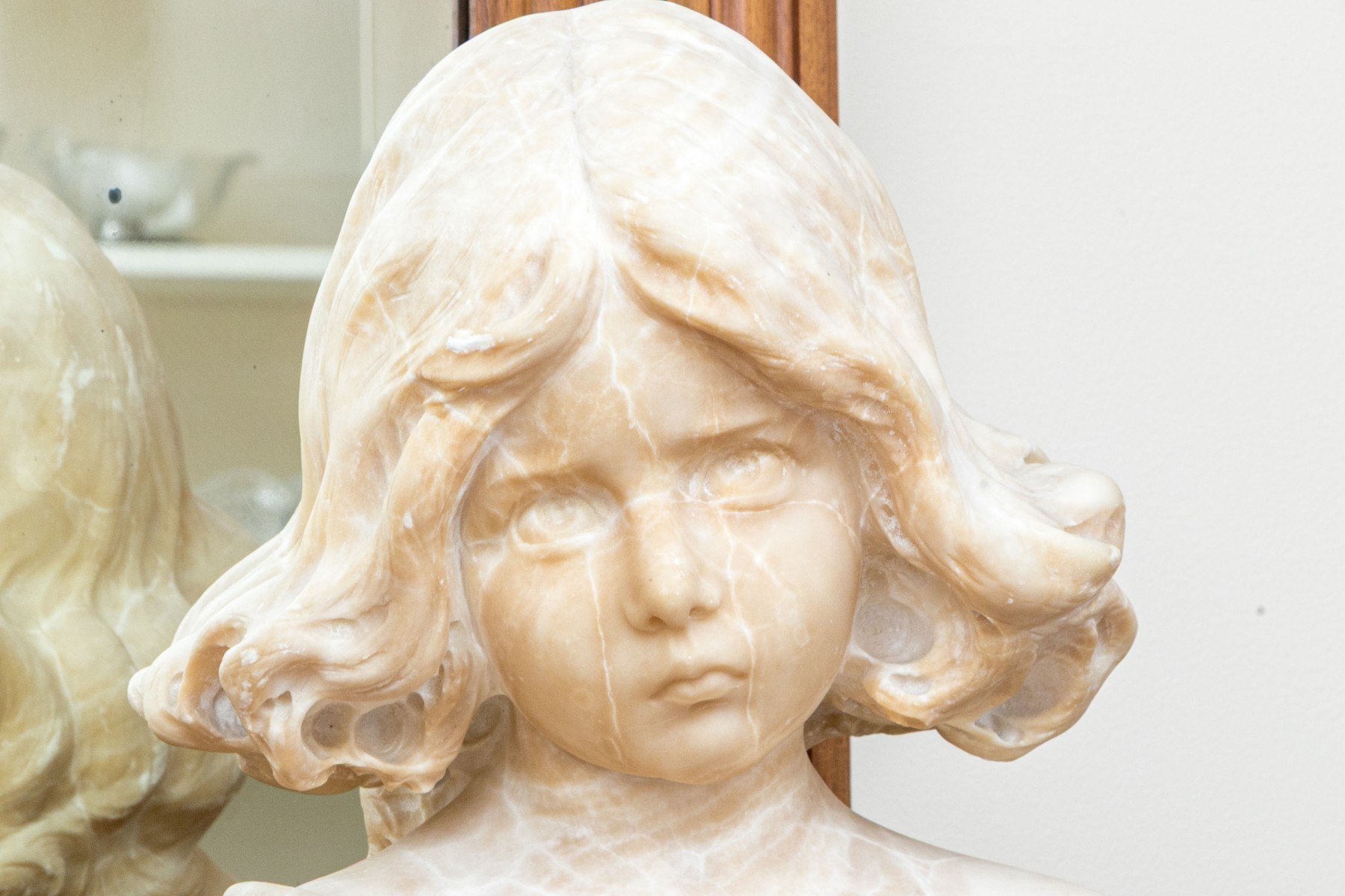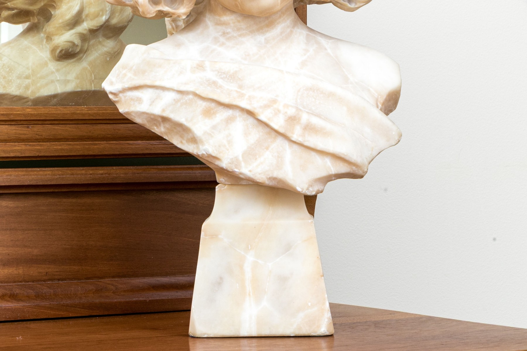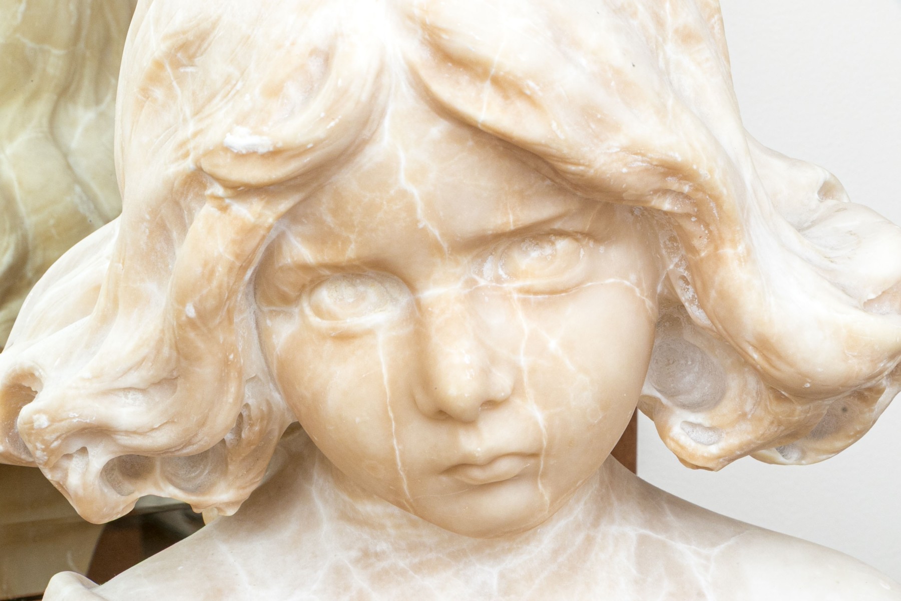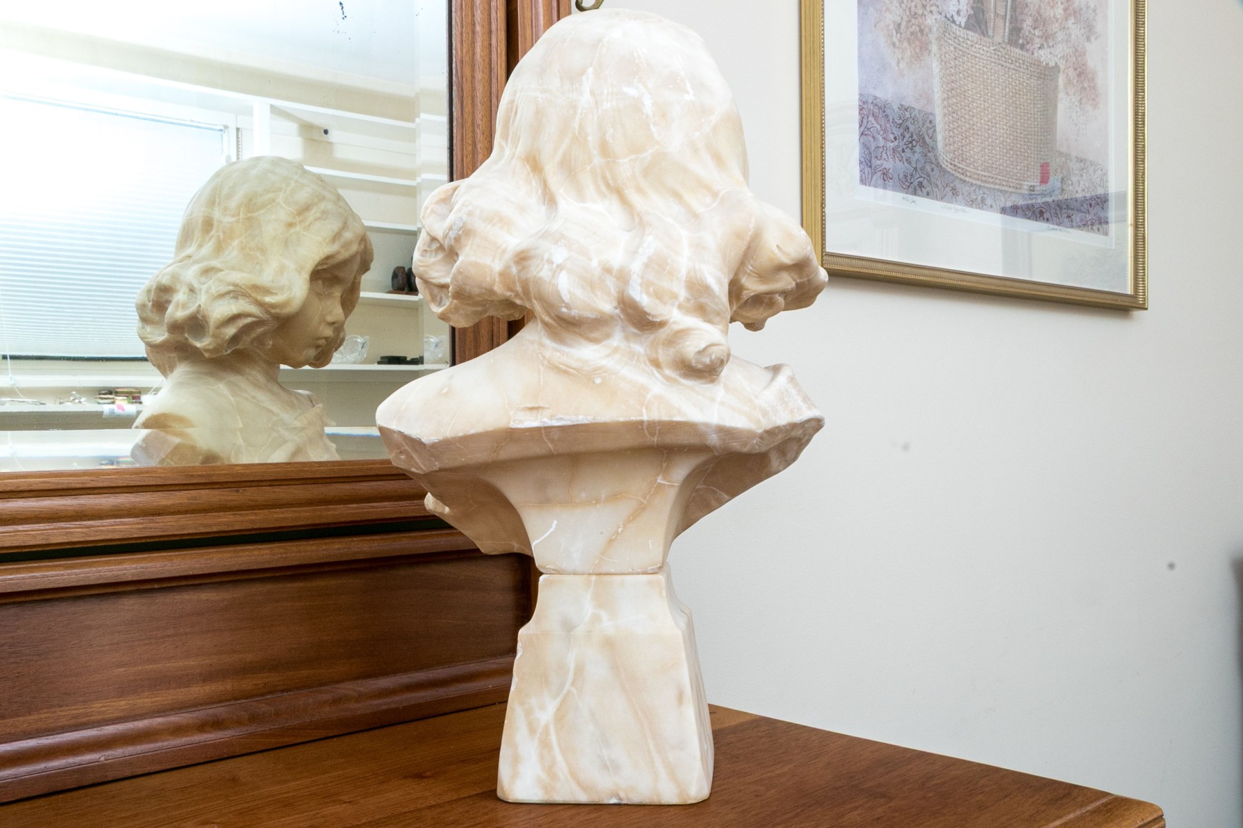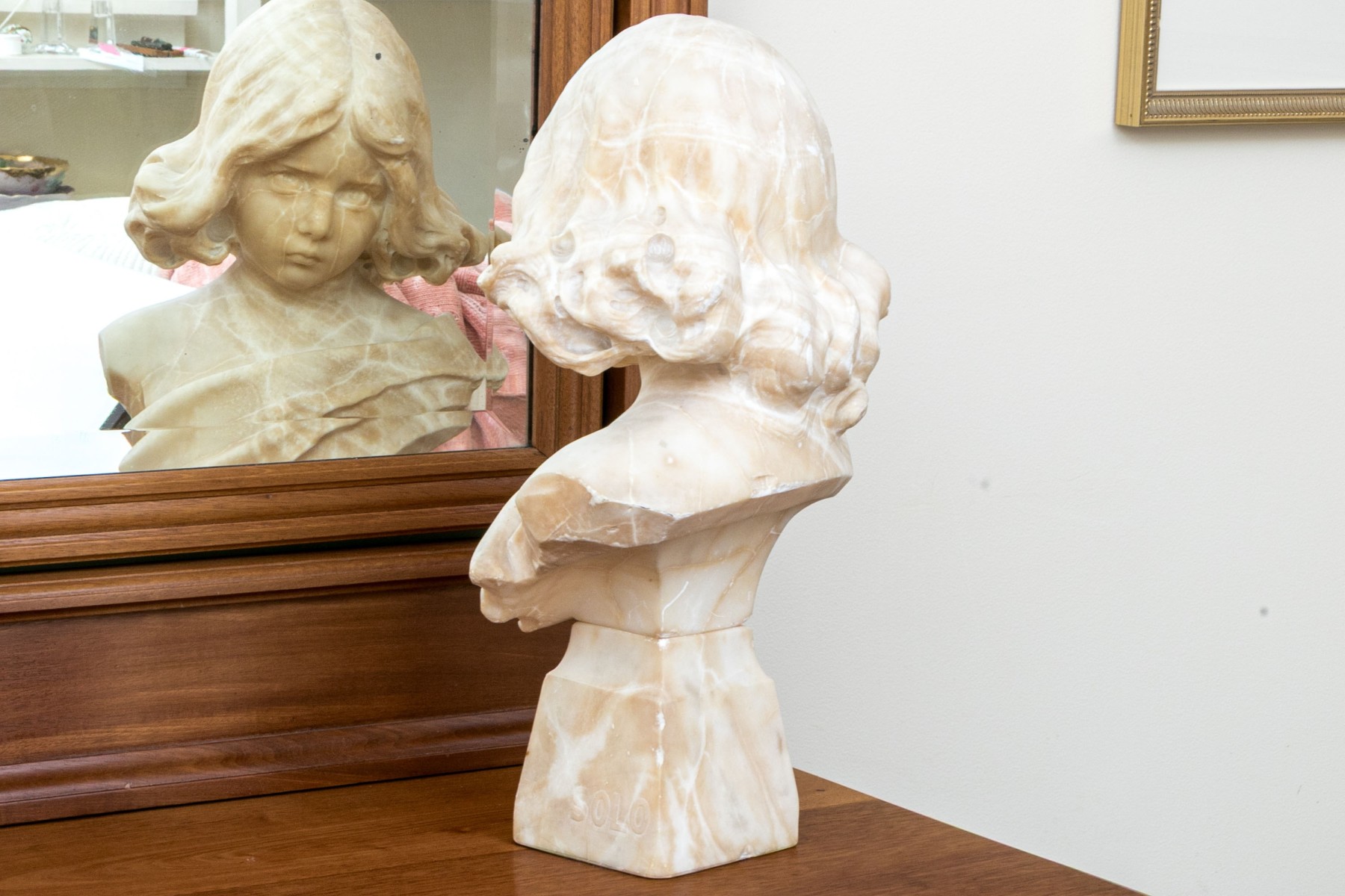 A gorgeous Italian alabaster sculpted bust of a young girl with curled chin-length hair and a pouting expression, wearing a draped gown off the shoulder over a sleek trapezoidal base. Signed "SOLO" to the base.