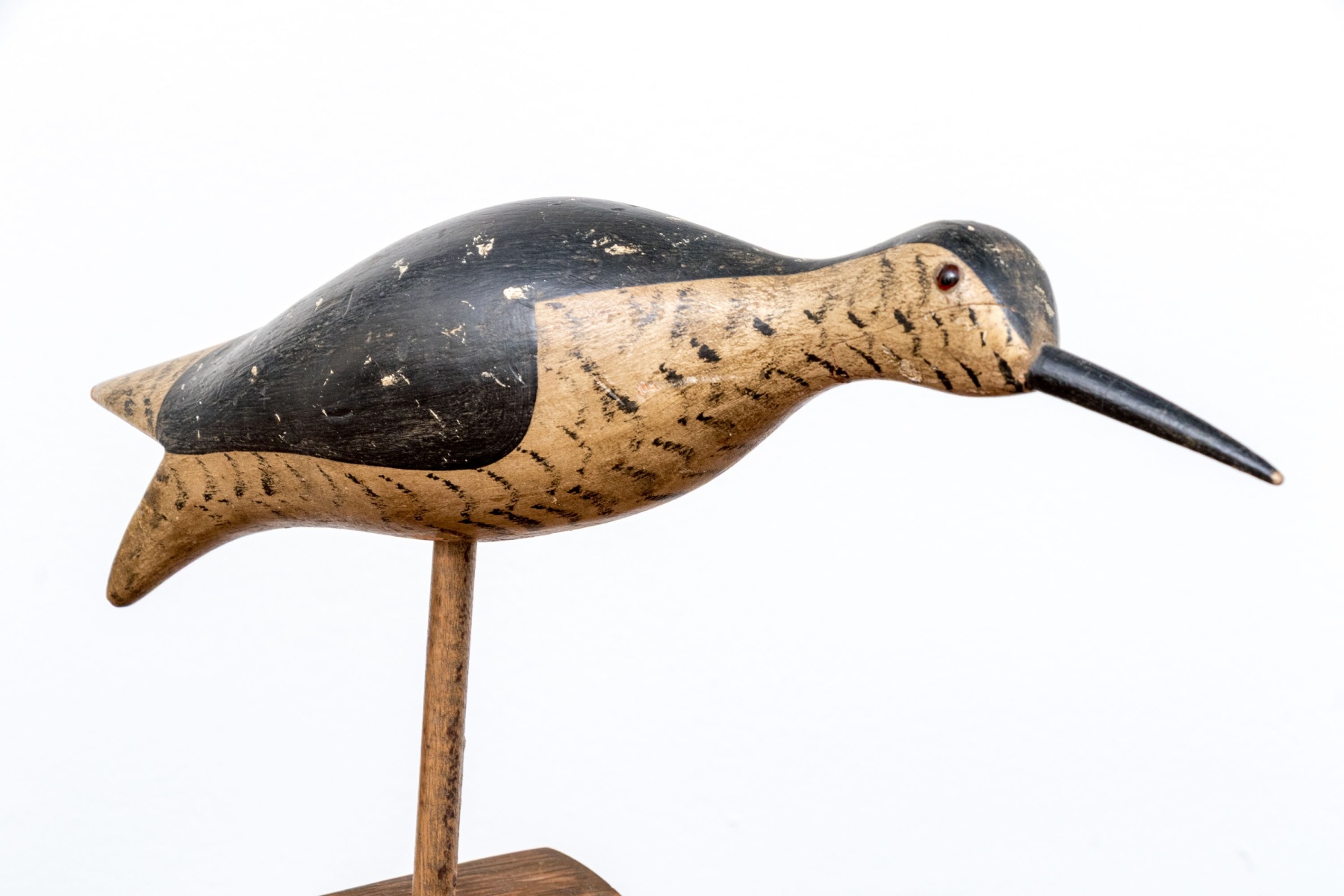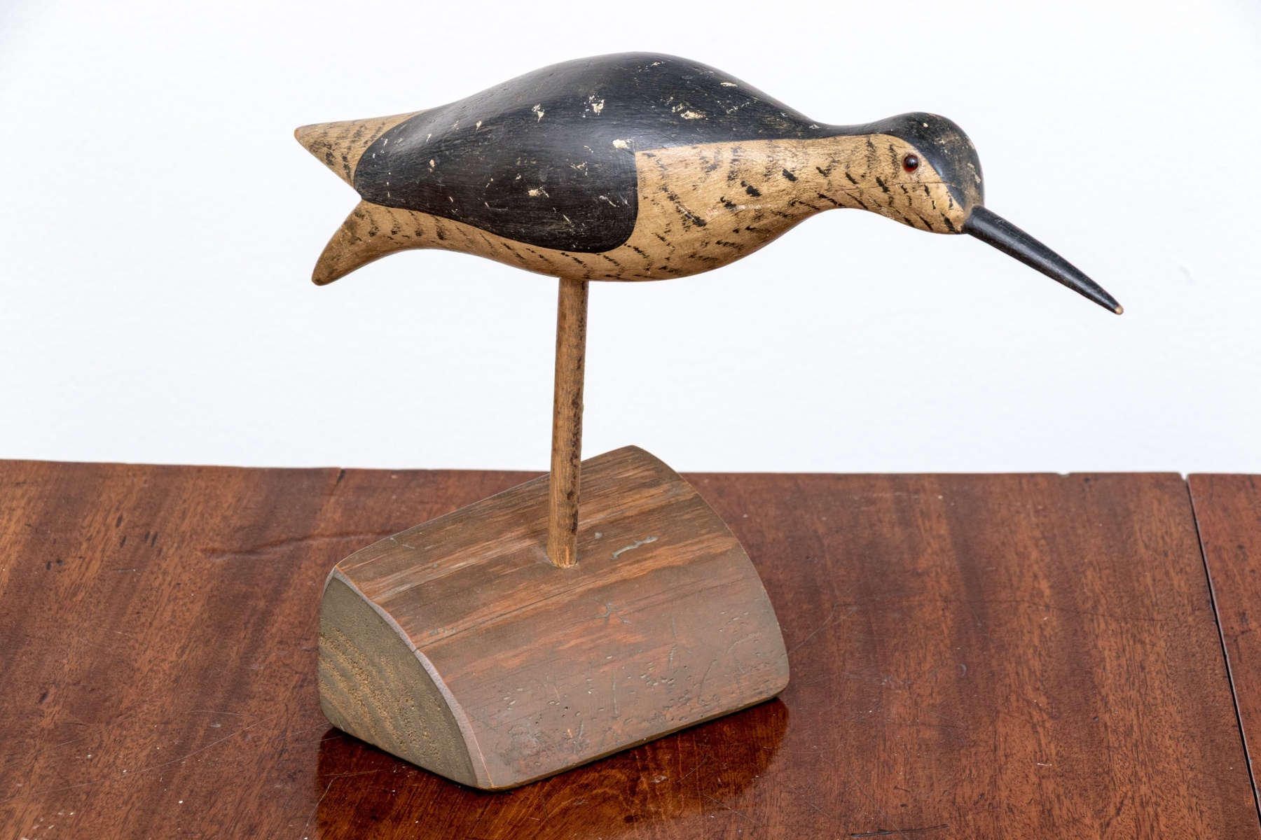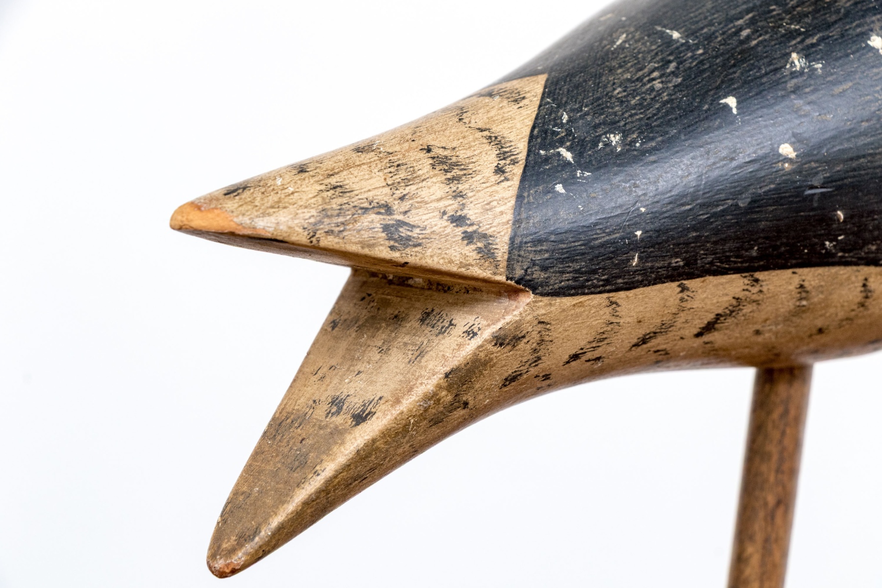 A fabulous artisanal carved wood figure of a seabird hand-painted with a black back and detailed throughout the feathers. The bird poses as though in mid-dive, wings tucked and form slender with a long beak and glass inlaid eye. Mounted to a wood wedge base. Signed Stevens beneath the tail.