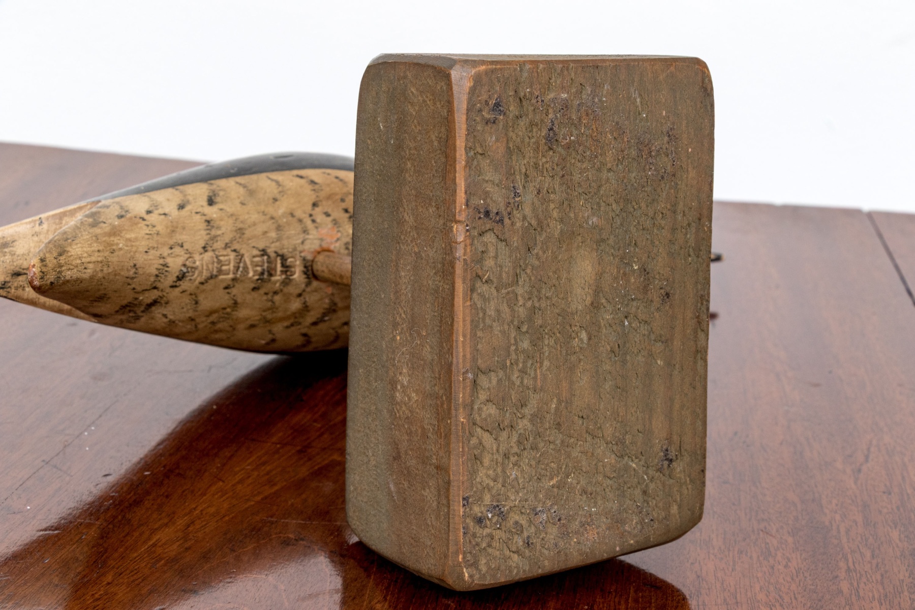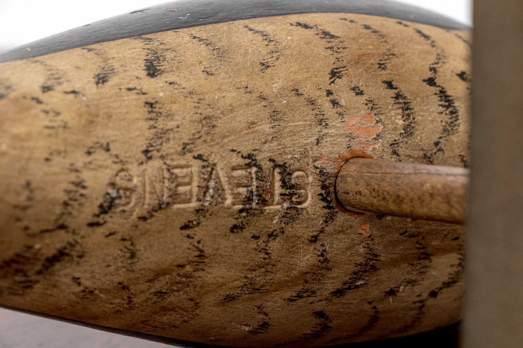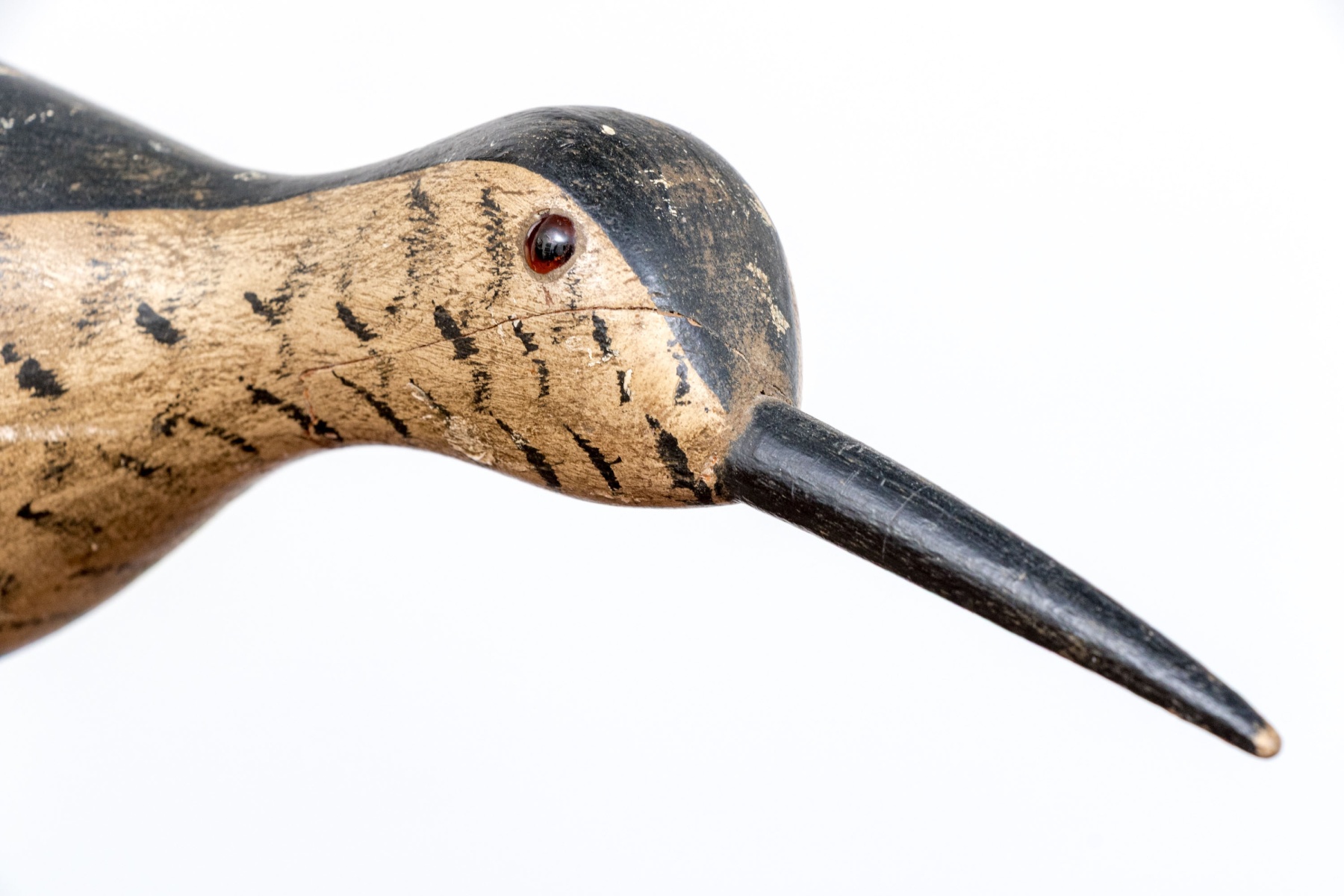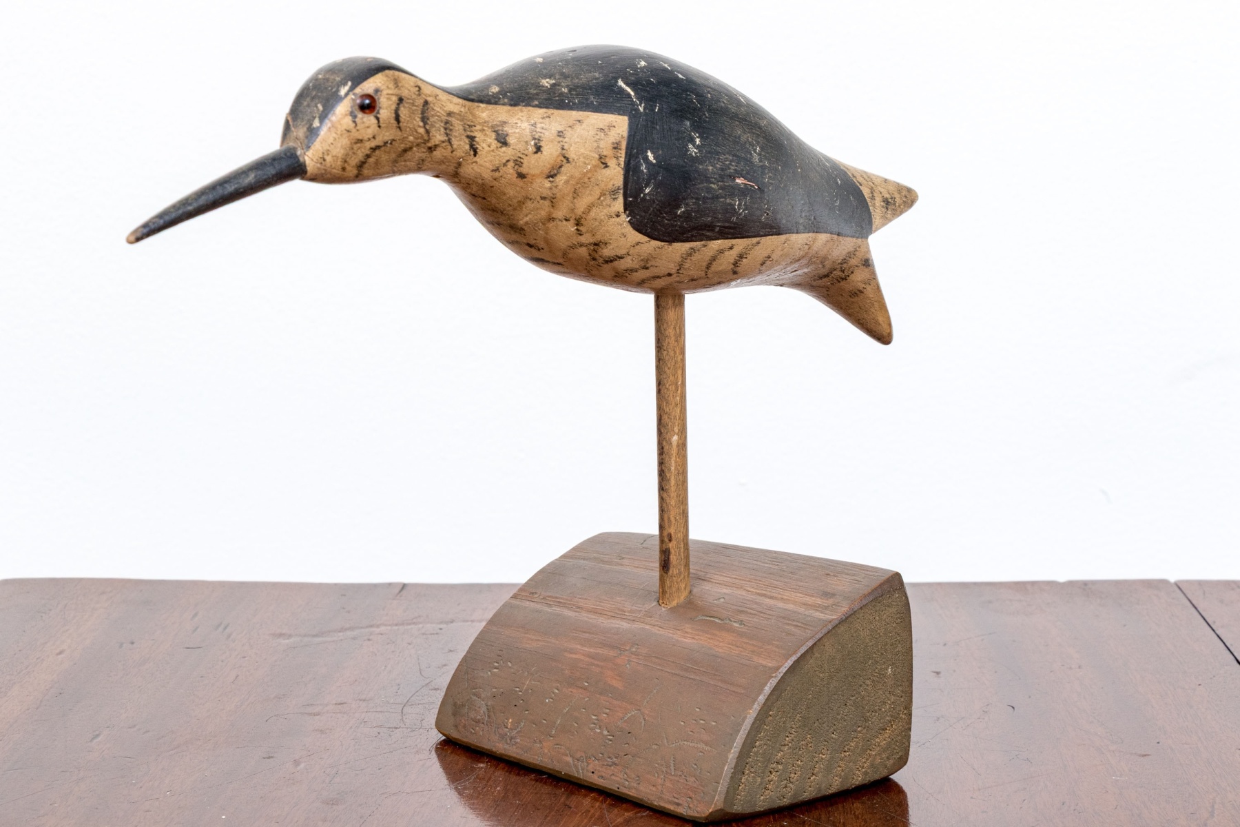 A fabulous artisanal carved wood figure of a seabird hand-painted with a black back and detailed throughout the feathers. The bird poses as though in mid-dive, wings tucked and form slender with a long beak and glass inlaid eye. Mounted to a wood wedge base. Signed Stevens beneath the tail.