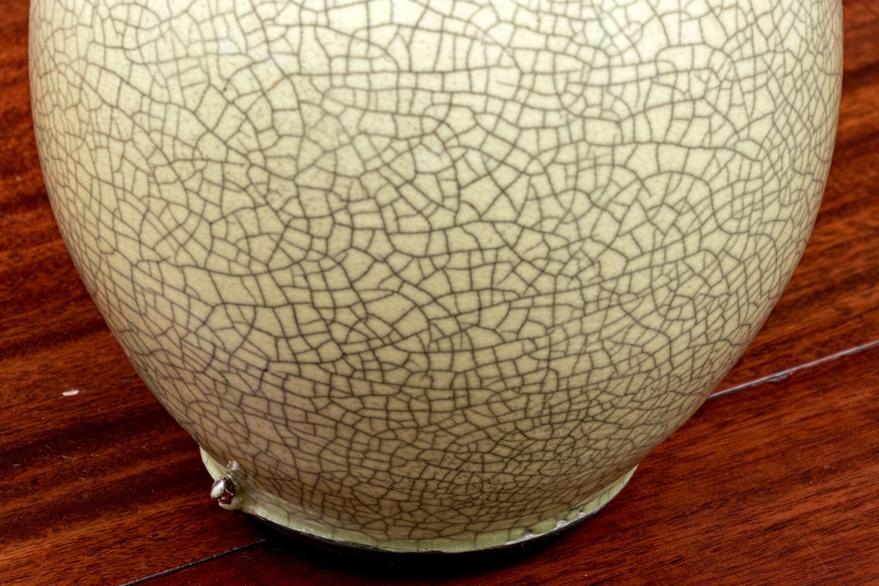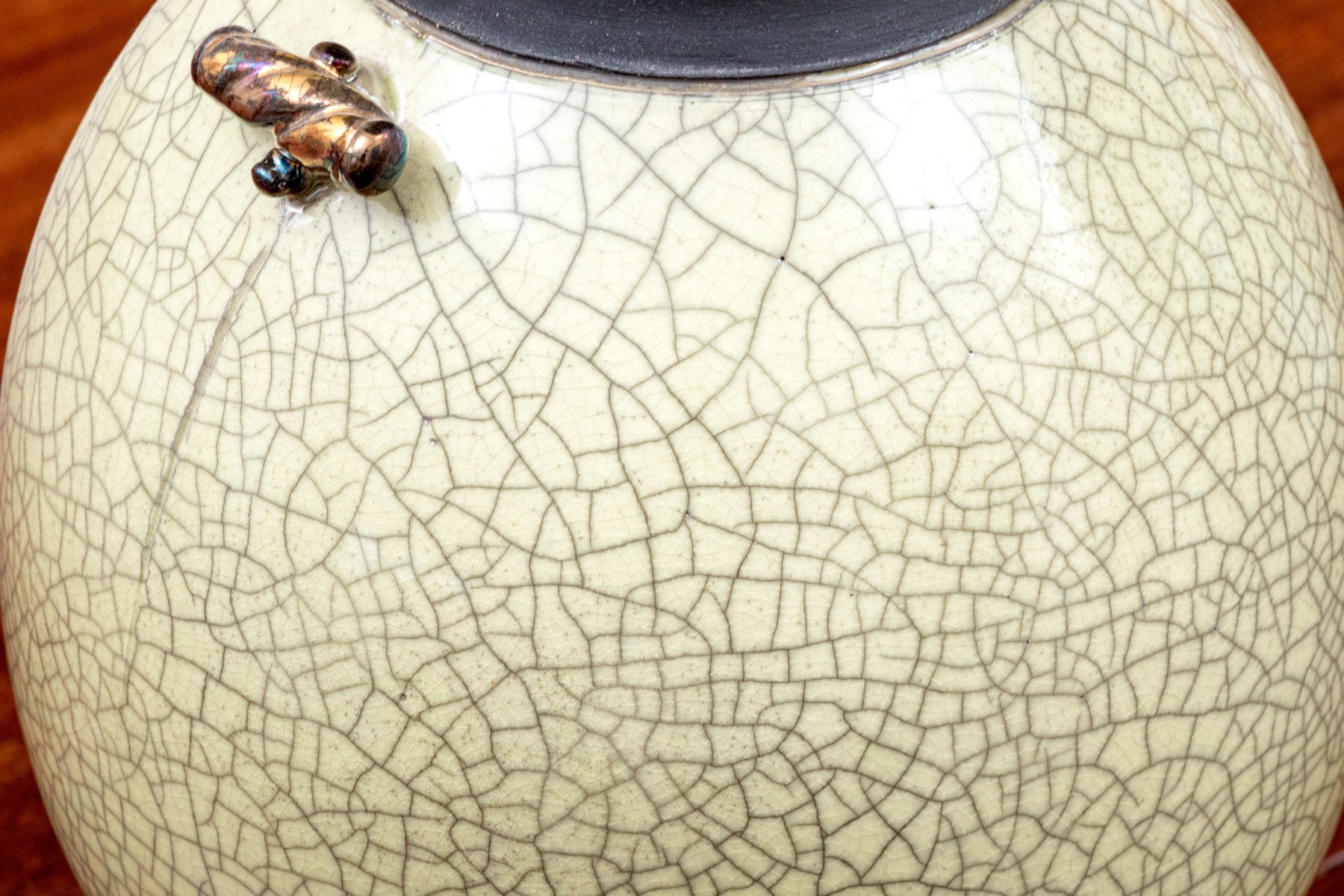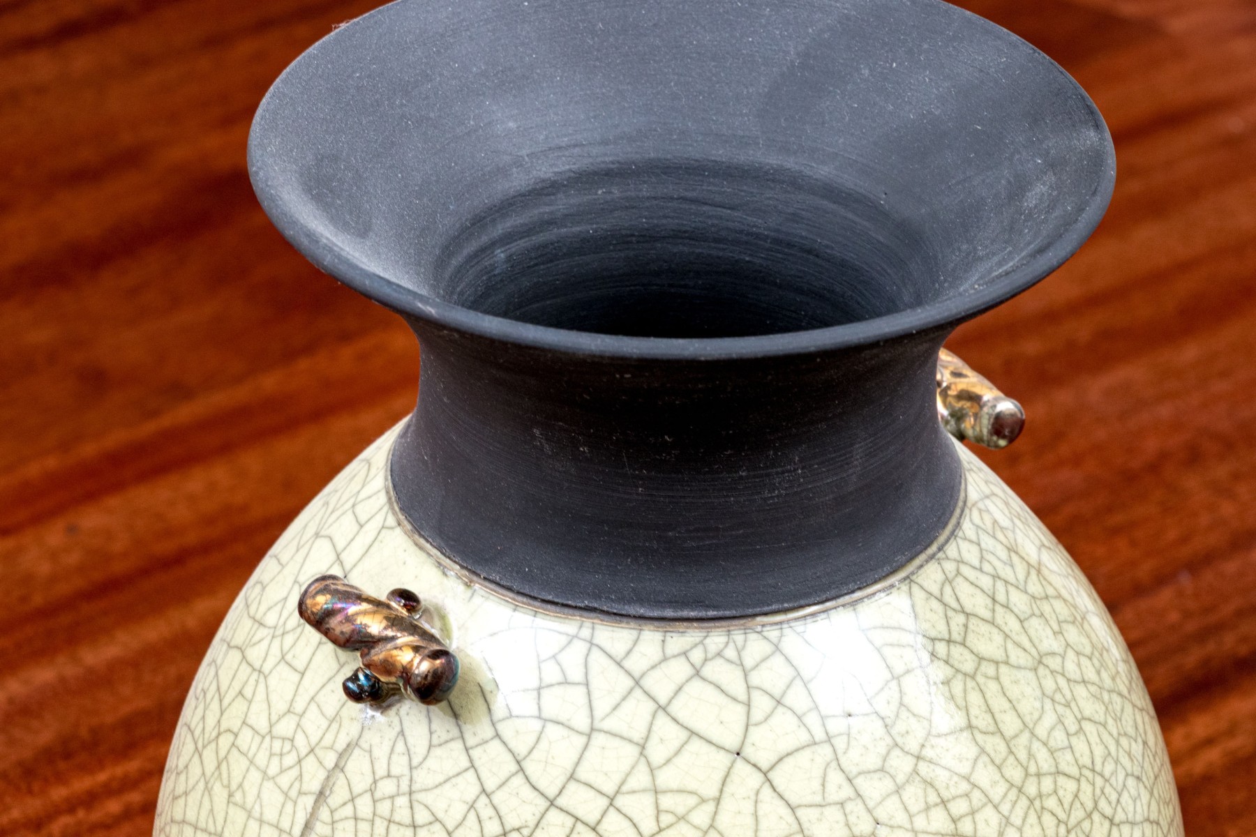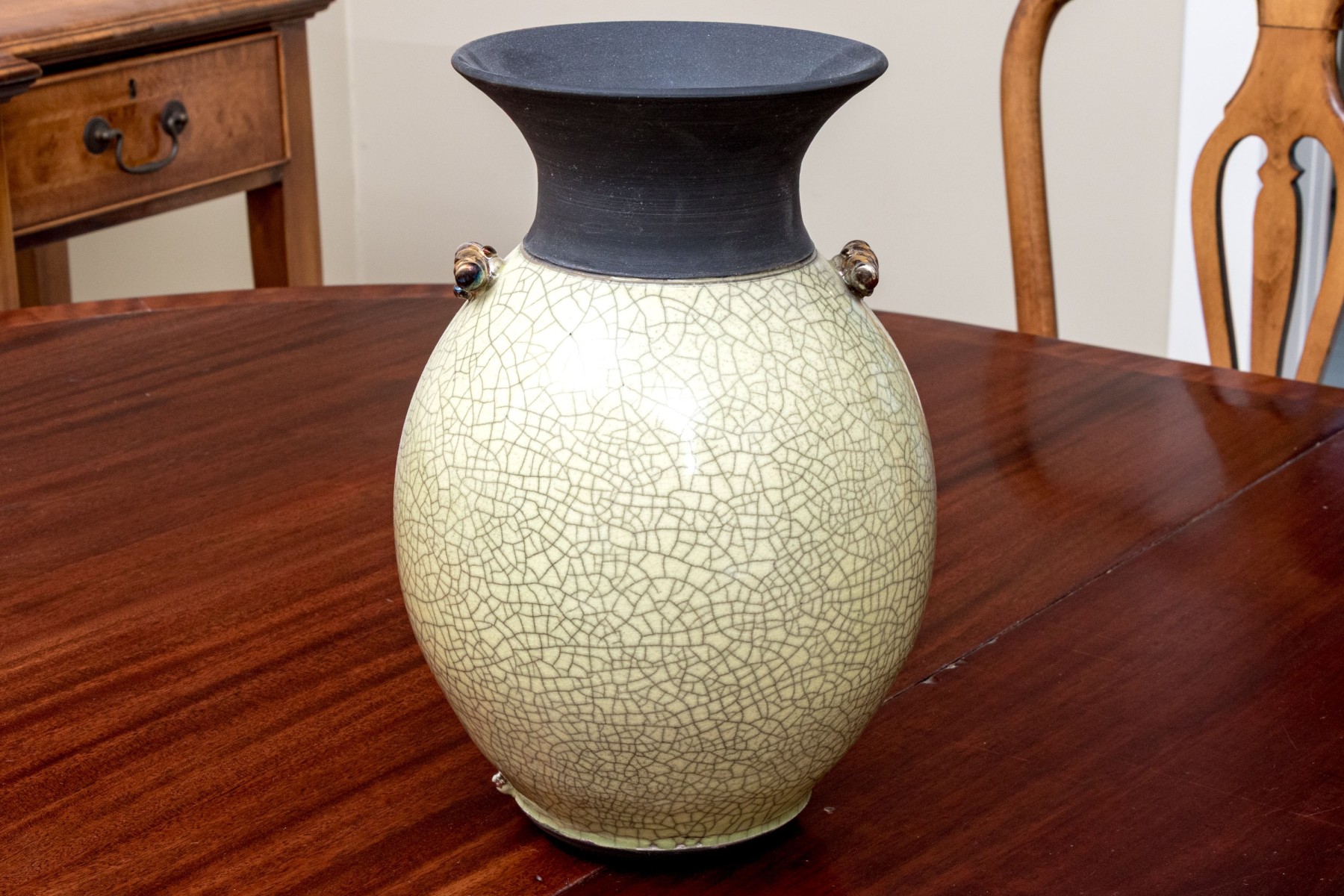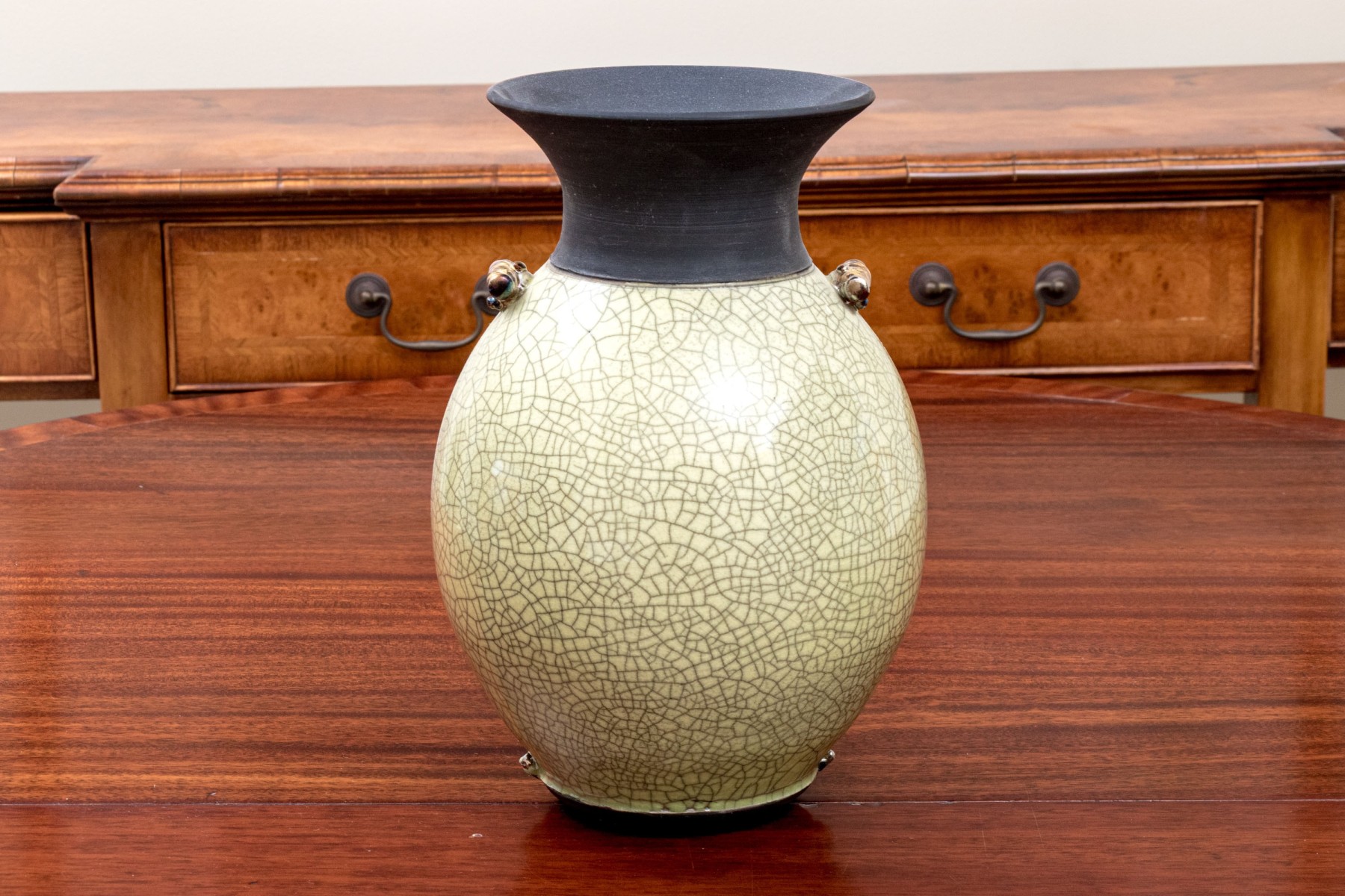 A gorgeous studio pottery raku ceramic vase designed with a black flared rim tapering down to an ovoid light green crackle glazed body with stout metallic finished cylindrical handles sporting a spiraled texture. Small metallic accents over the stout black foot balance the design at the top and bottom. Signed underfoot.
