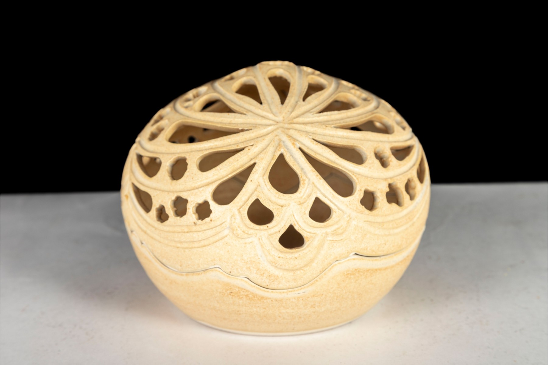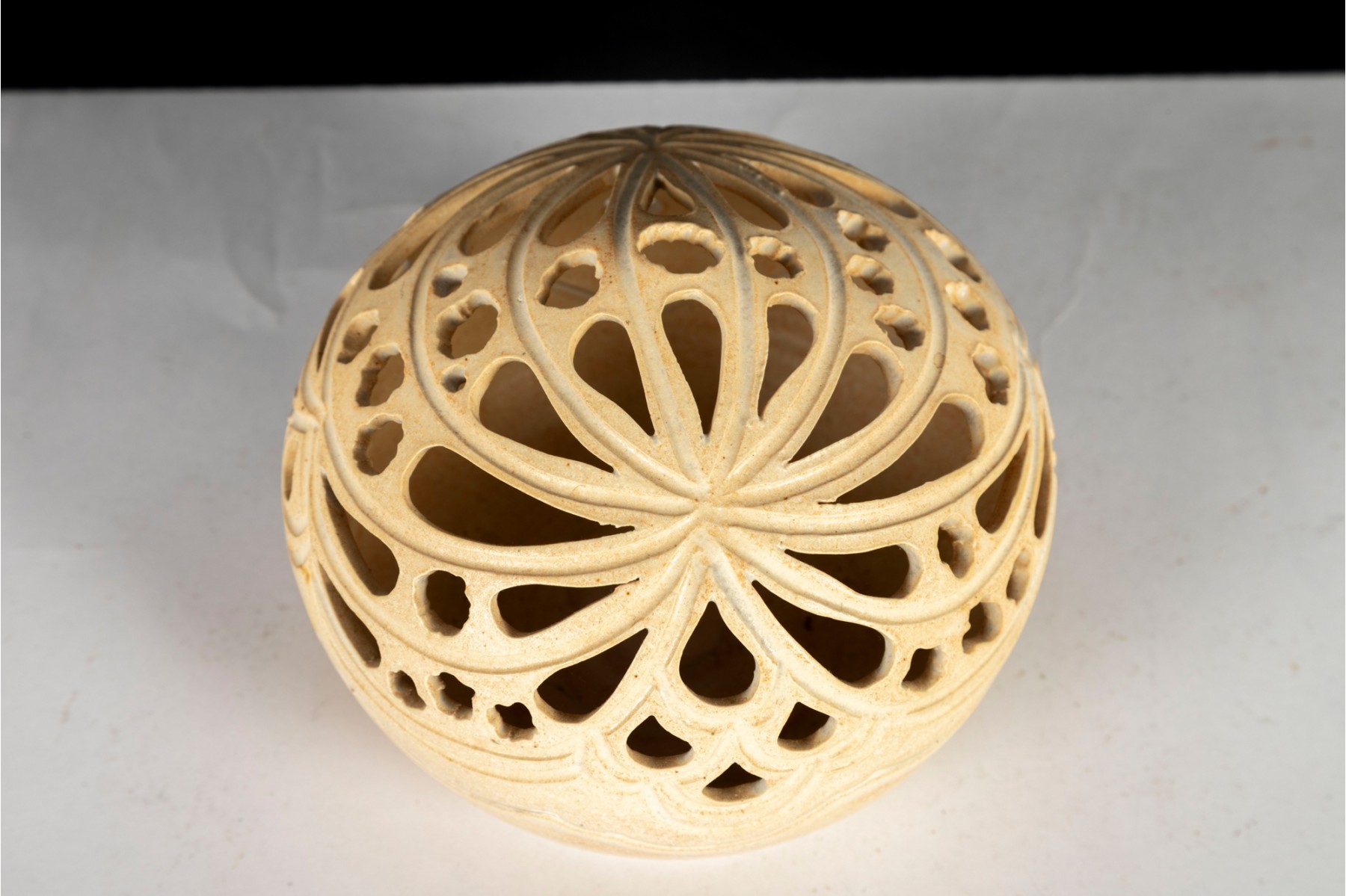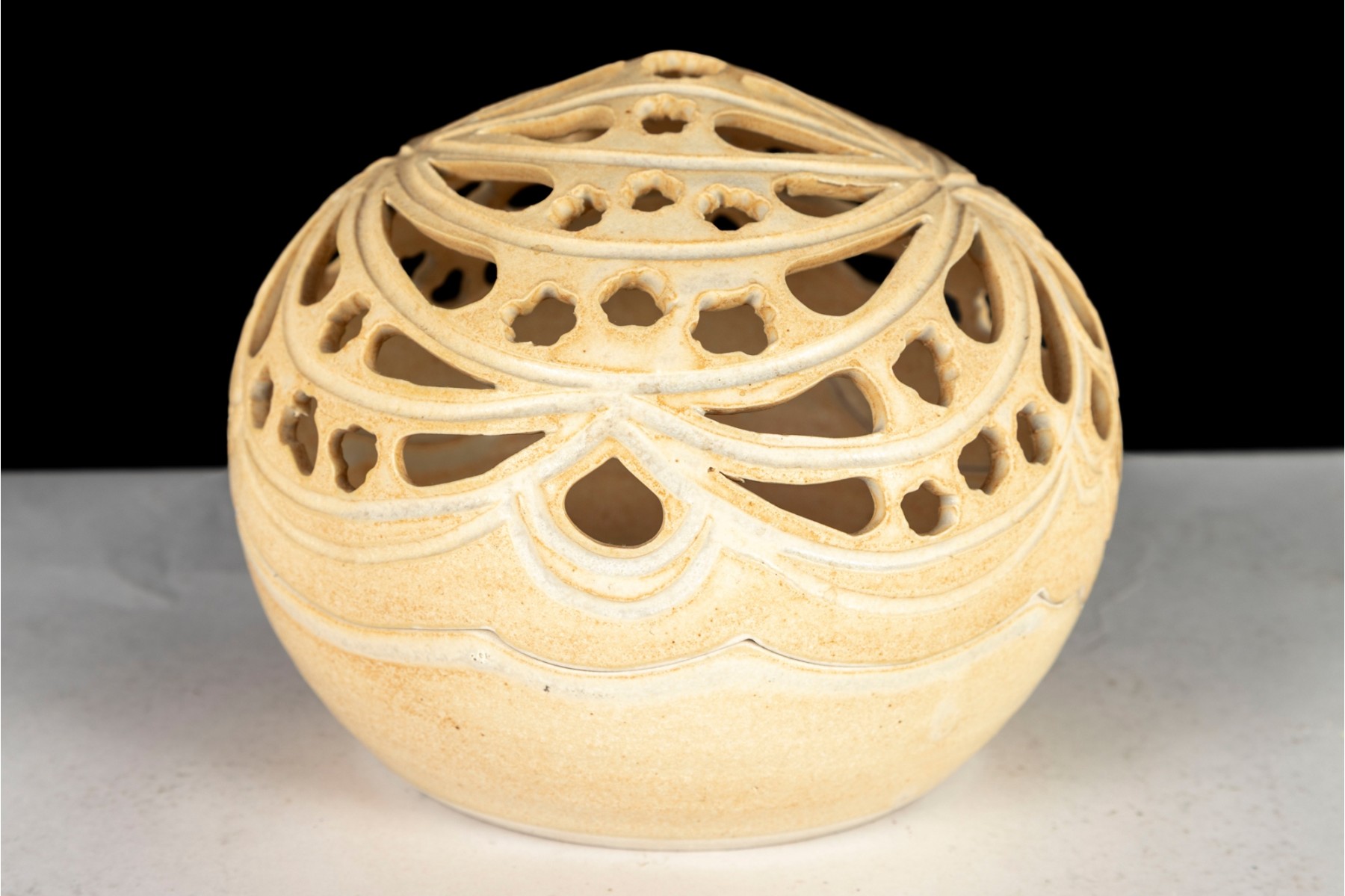 A ceramic pierced capsule composed of two parts. The bottom is signed — see photos for details.