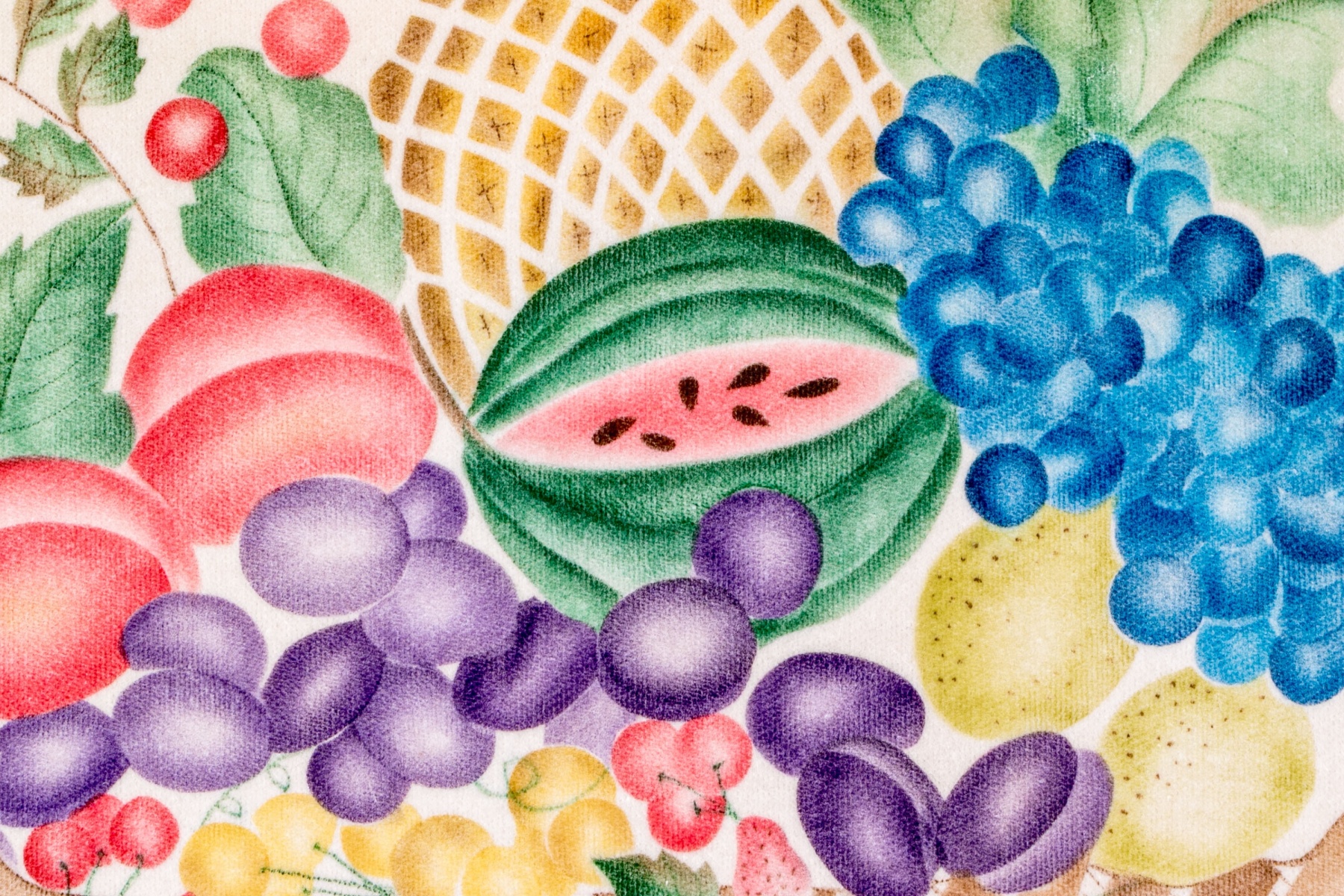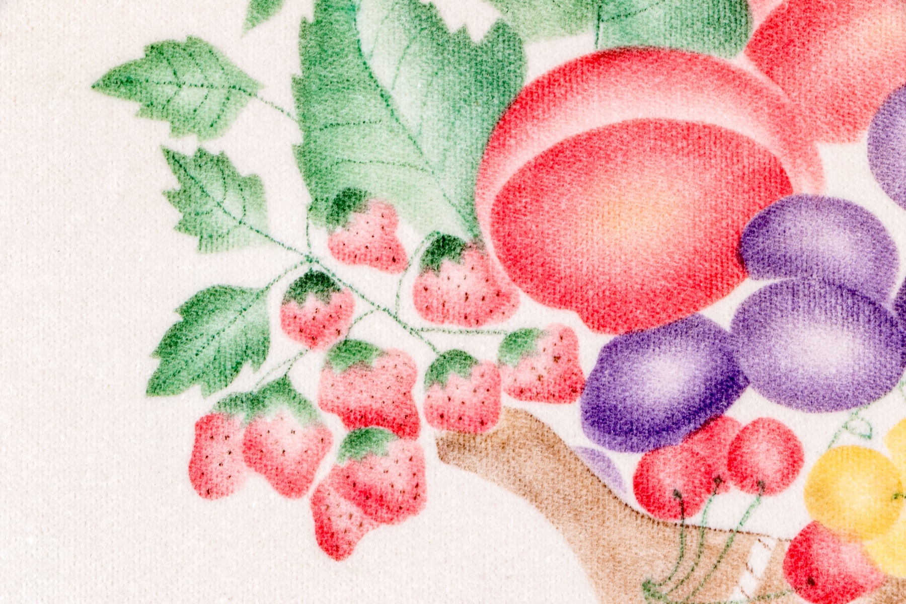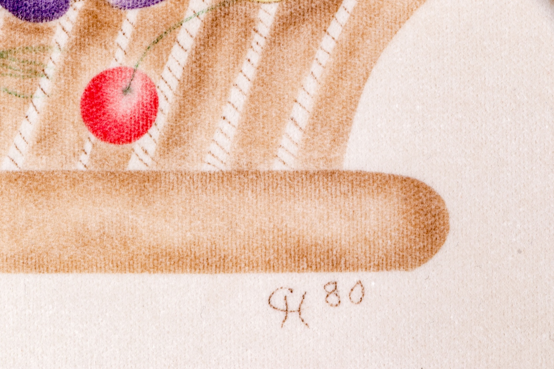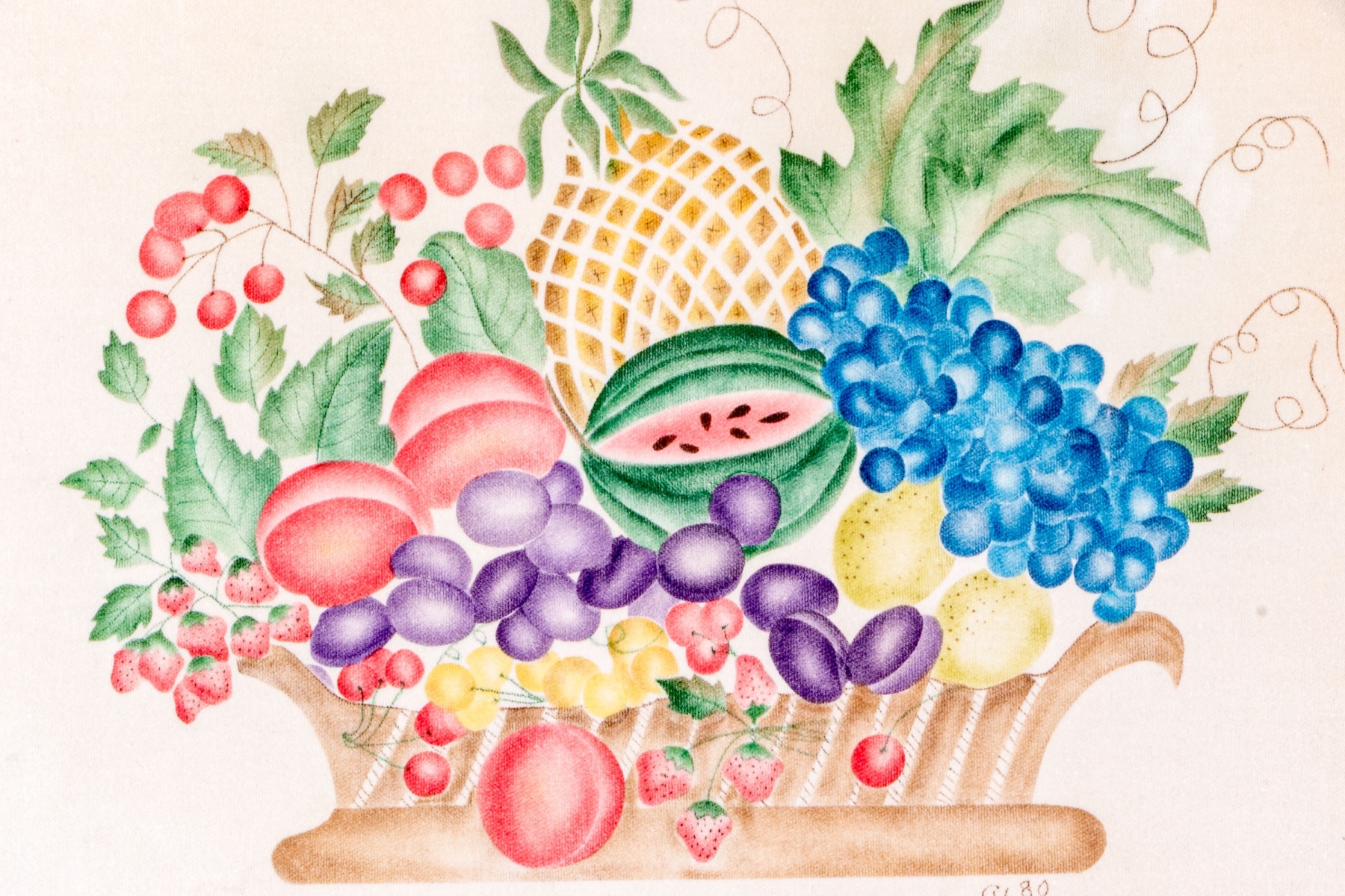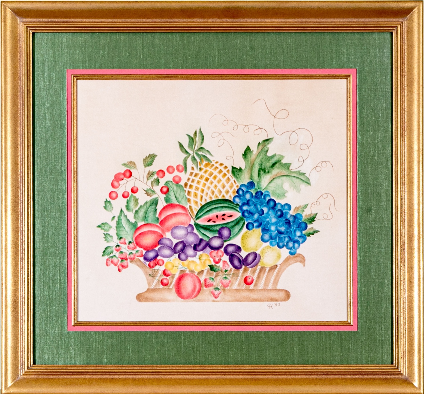 A charming vintage theorem painting depicting a classic still life of a brown basket overflowing with colorful fruit including cherries, strawberries, grapes, peaches, lemons, a watermelon, and a pineapple. Initialed CH and dated '80 lower right.