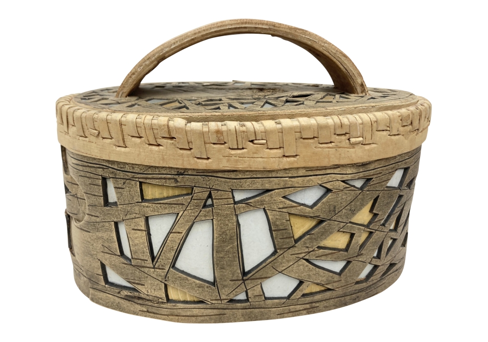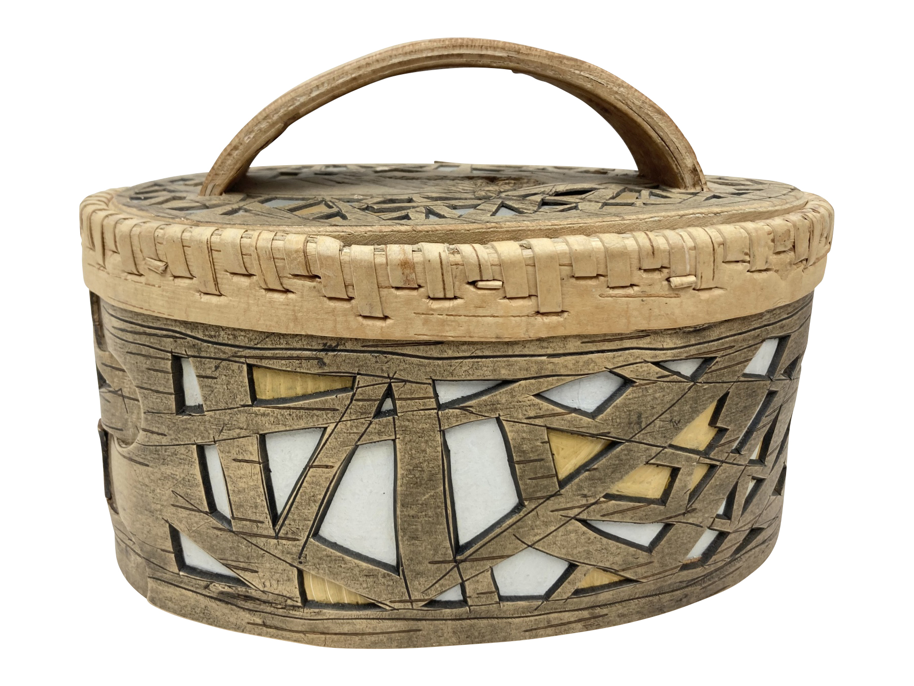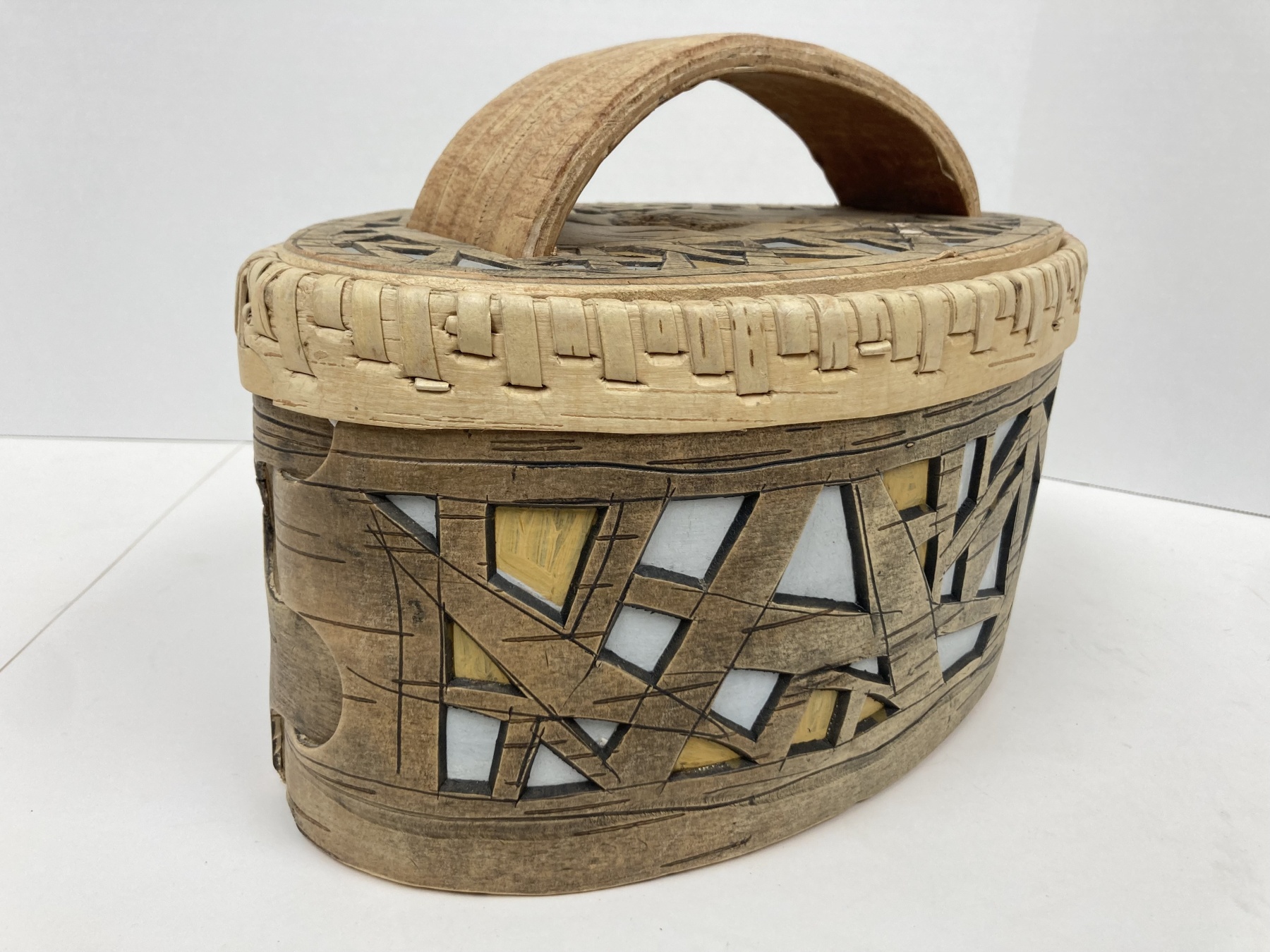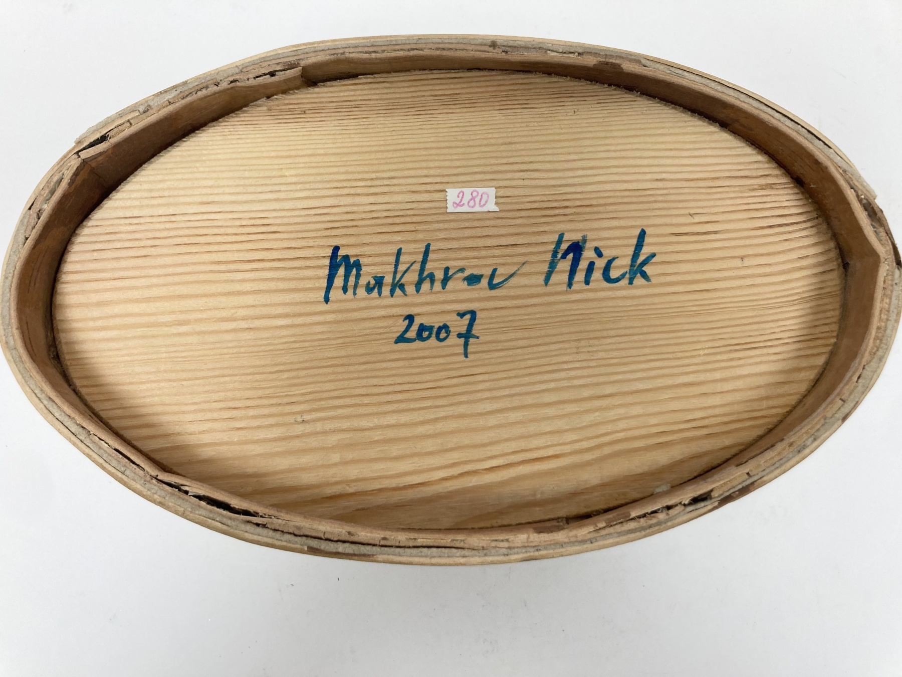 A very well crafted Oval Birch Box with an interesting and stylish pierced and colored surface treatment, thick bent wood handle and woven top edge. At one end, the bent panel has three thick joins which add interest, and a fine and well placed knot is located under the handle, and the bottom oval panel is Pine. Signed on the base, Nick Makhrov 2007”.