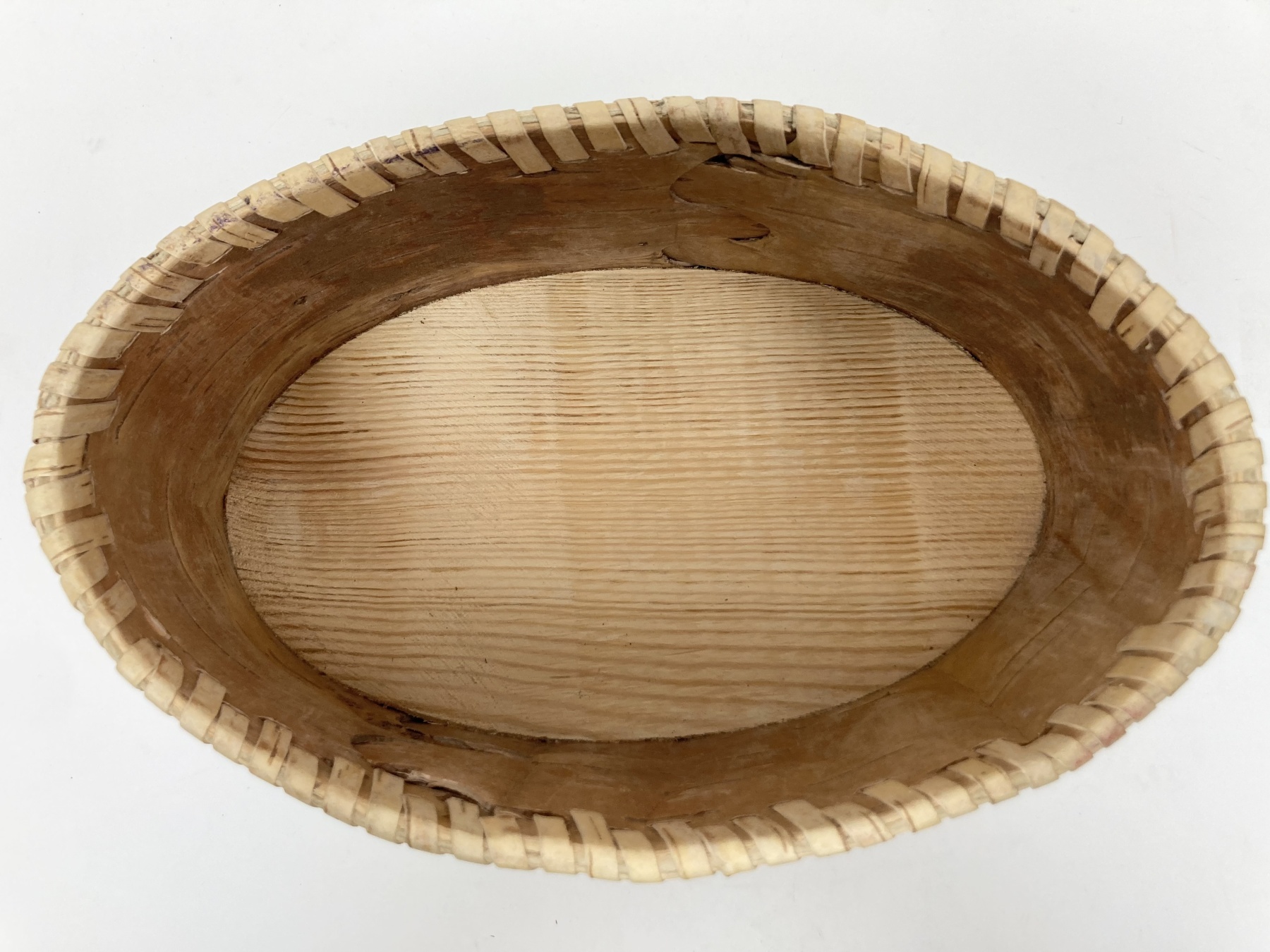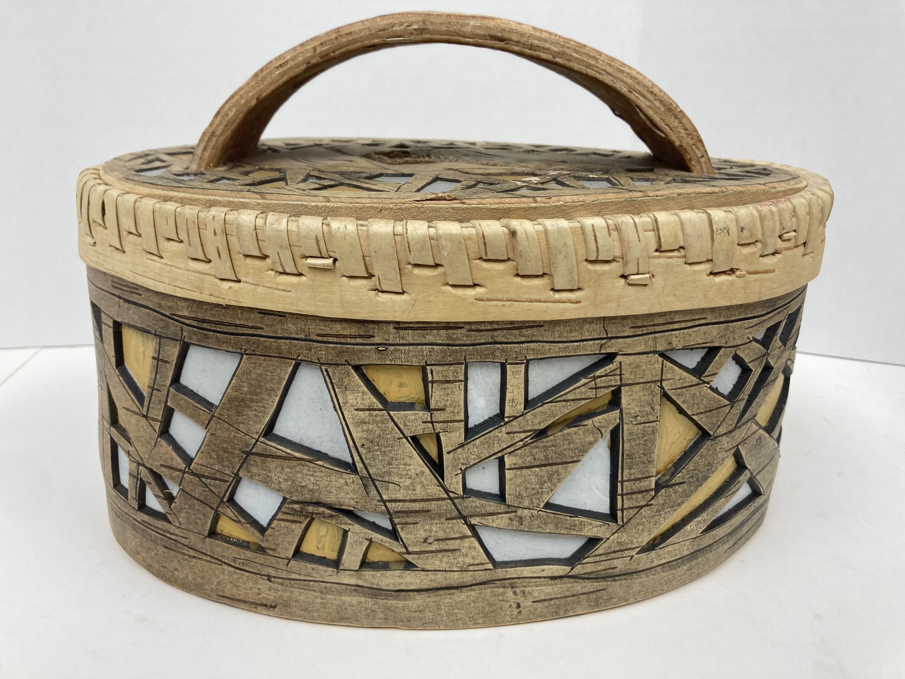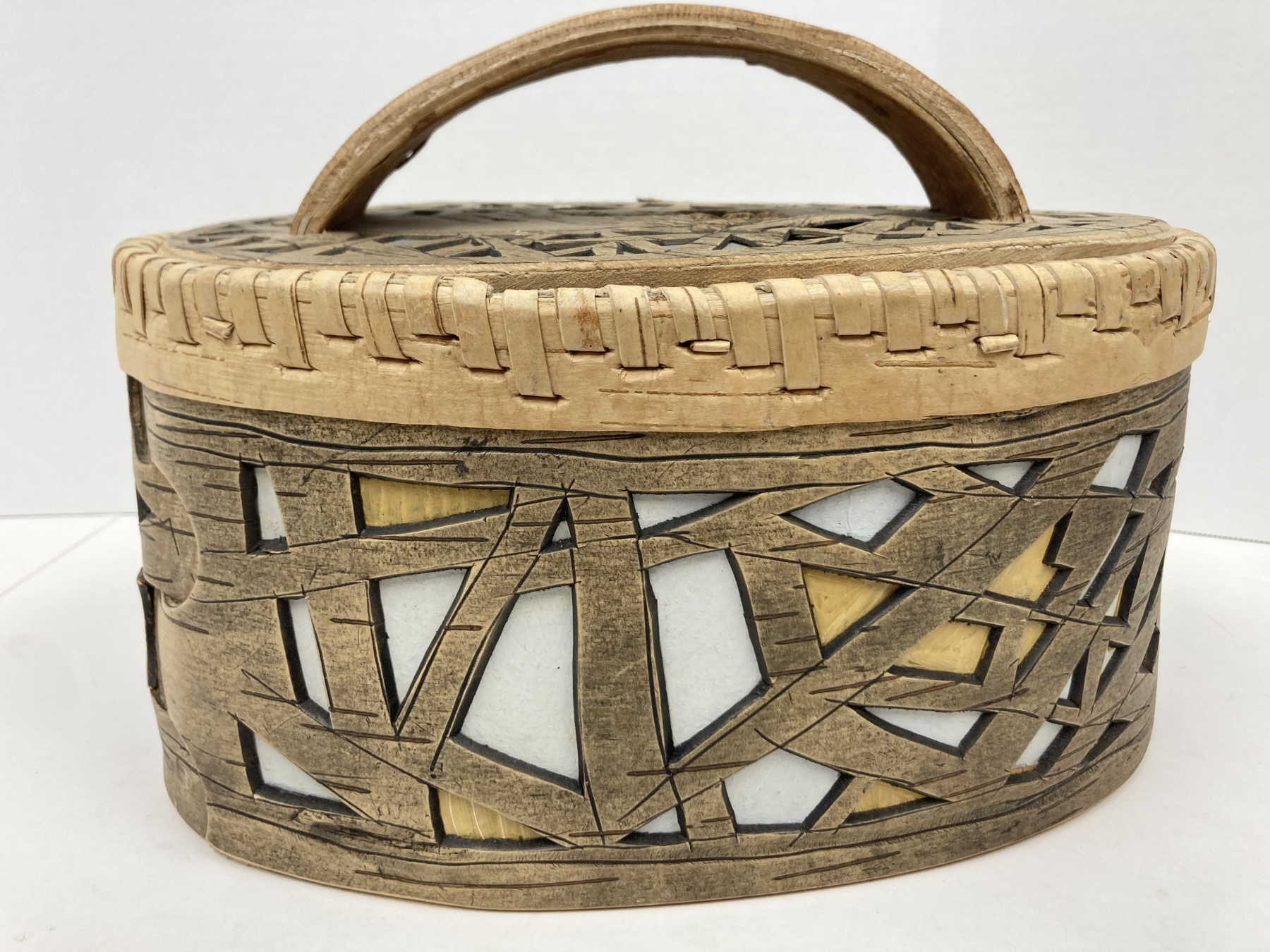 A very well crafted Oval Birch Box with an interesting and stylish pierced and colored surface treatment, thick bent wood handle and woven top edge. At one end, the bent panel has three thick joins which add interest, and a fine and well placed knot is located under the handle, and the bottom oval panel is Pine. Signed on the base, Nick Makhrov 2007”.