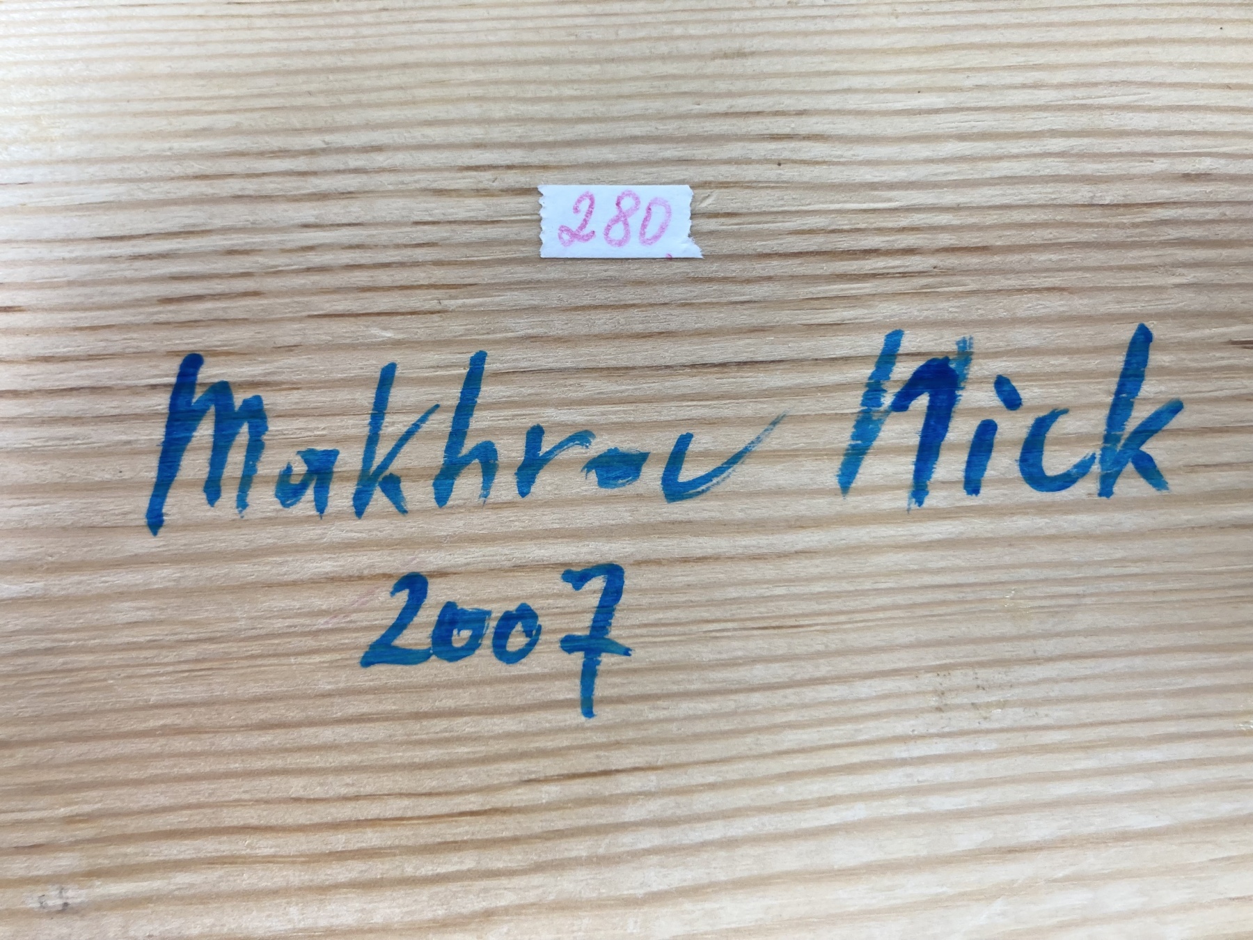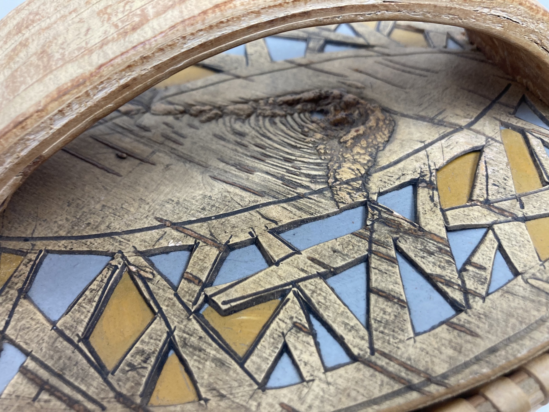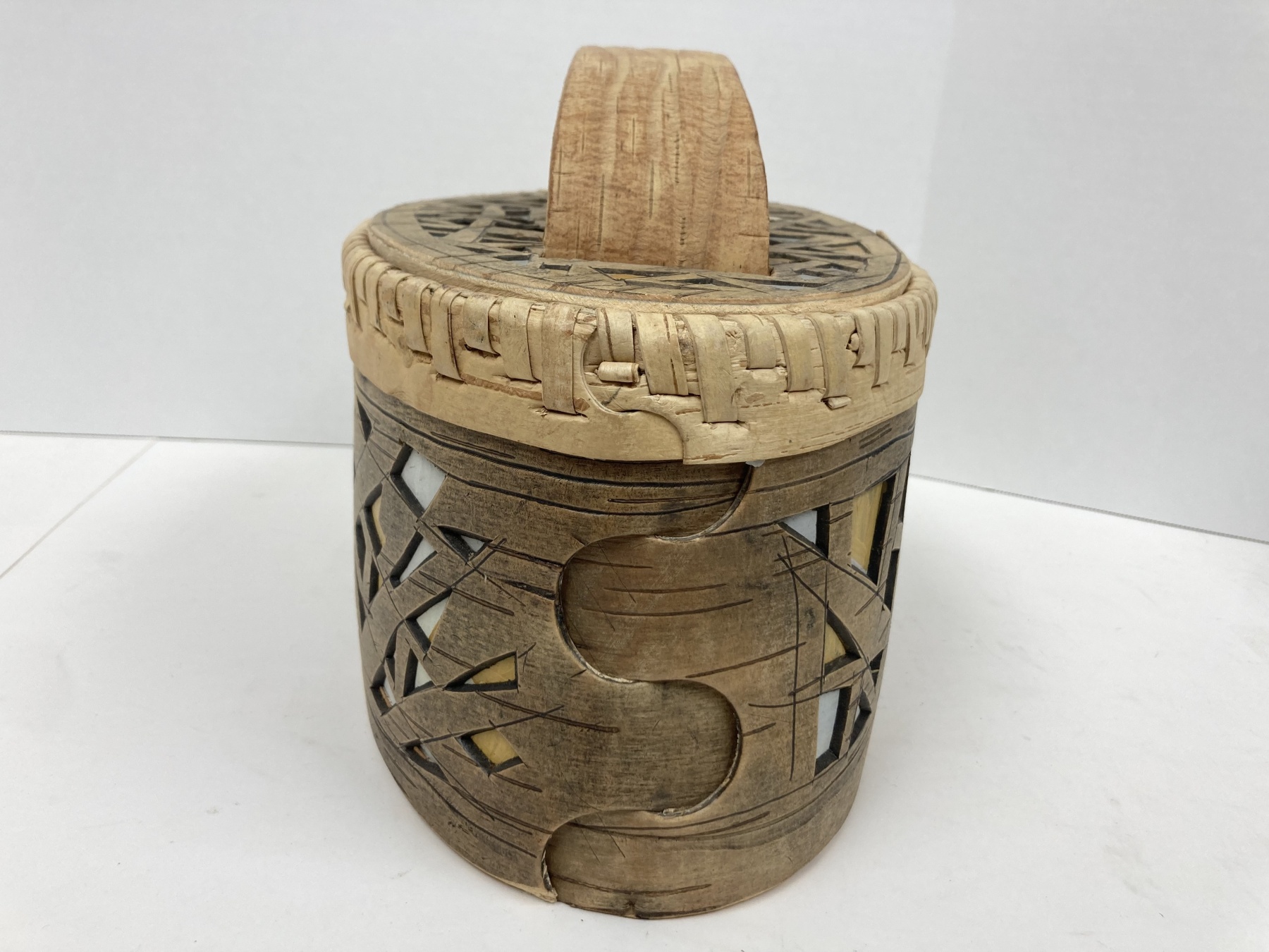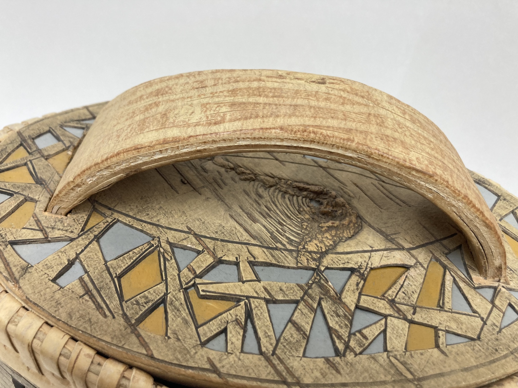 A very well crafted Oval Birch Box with an interesting and stylish pierced and colored surface treatment, thick bent wood handle and woven top edge. At one end, the bent panel has three thick joins which add interest, and a fine and well placed knot is located under the handle, and the bottom oval panel is Pine. Signed on the base, Nick Makhrov 2007”.