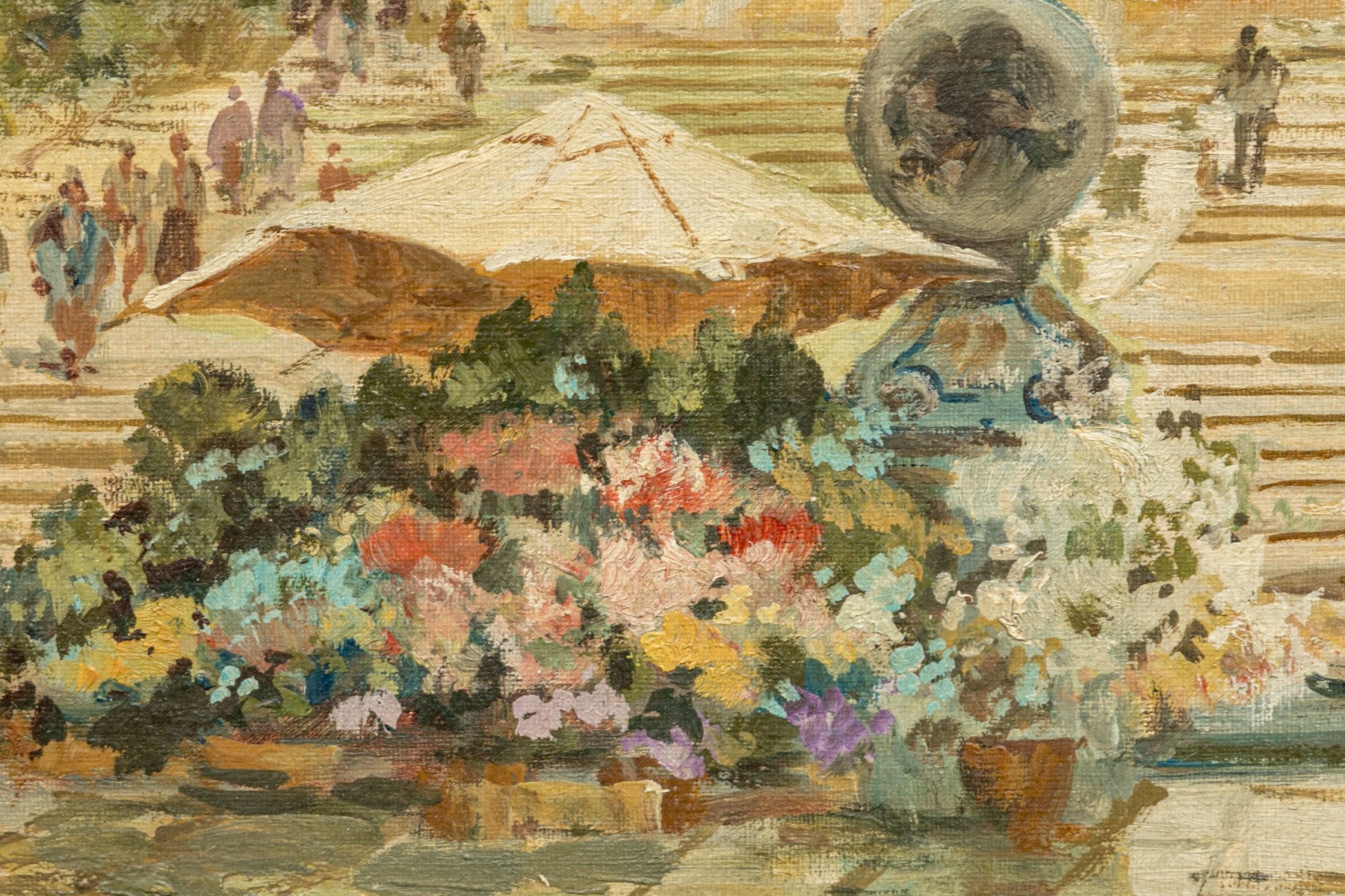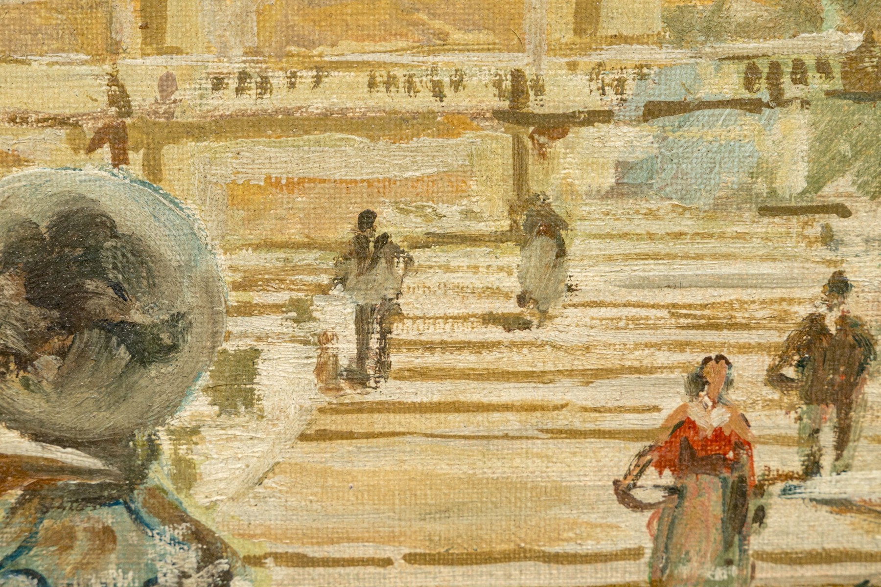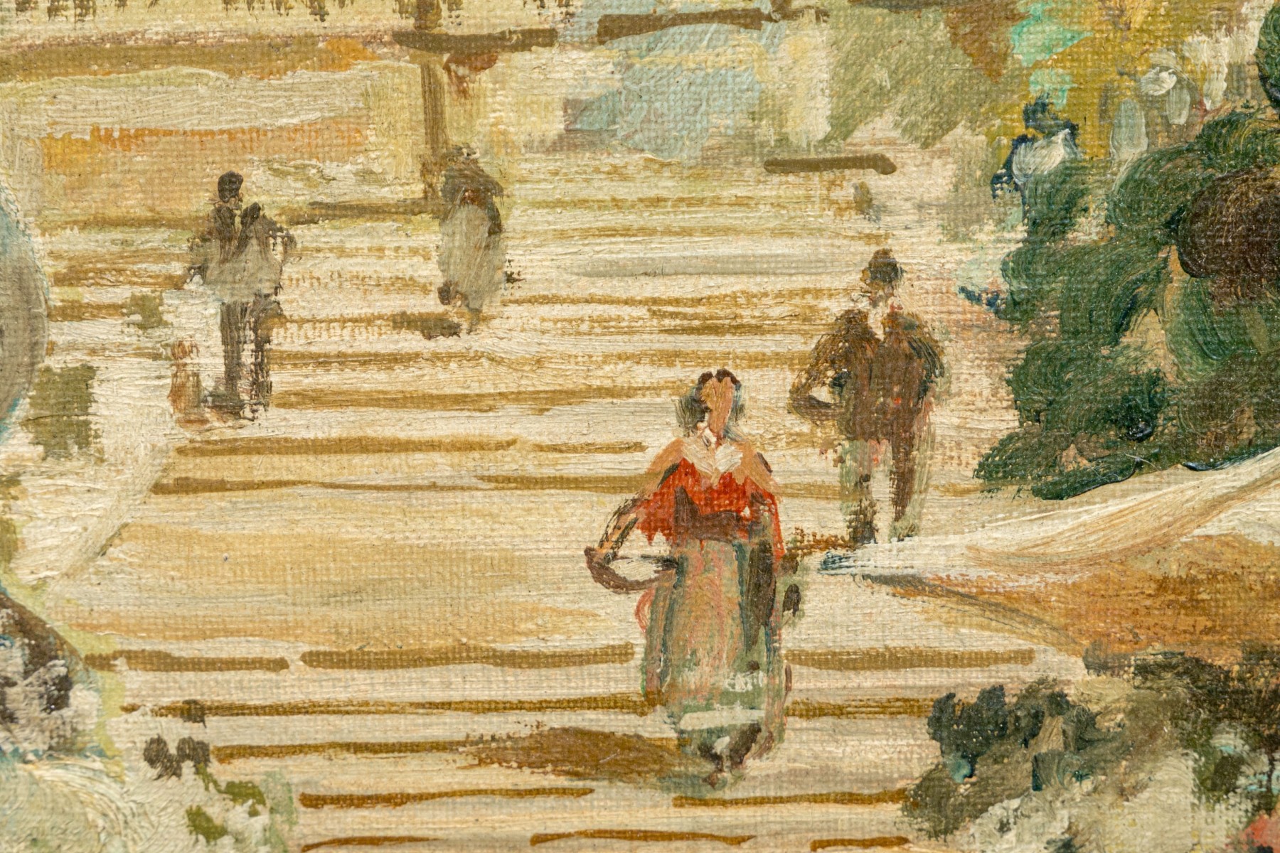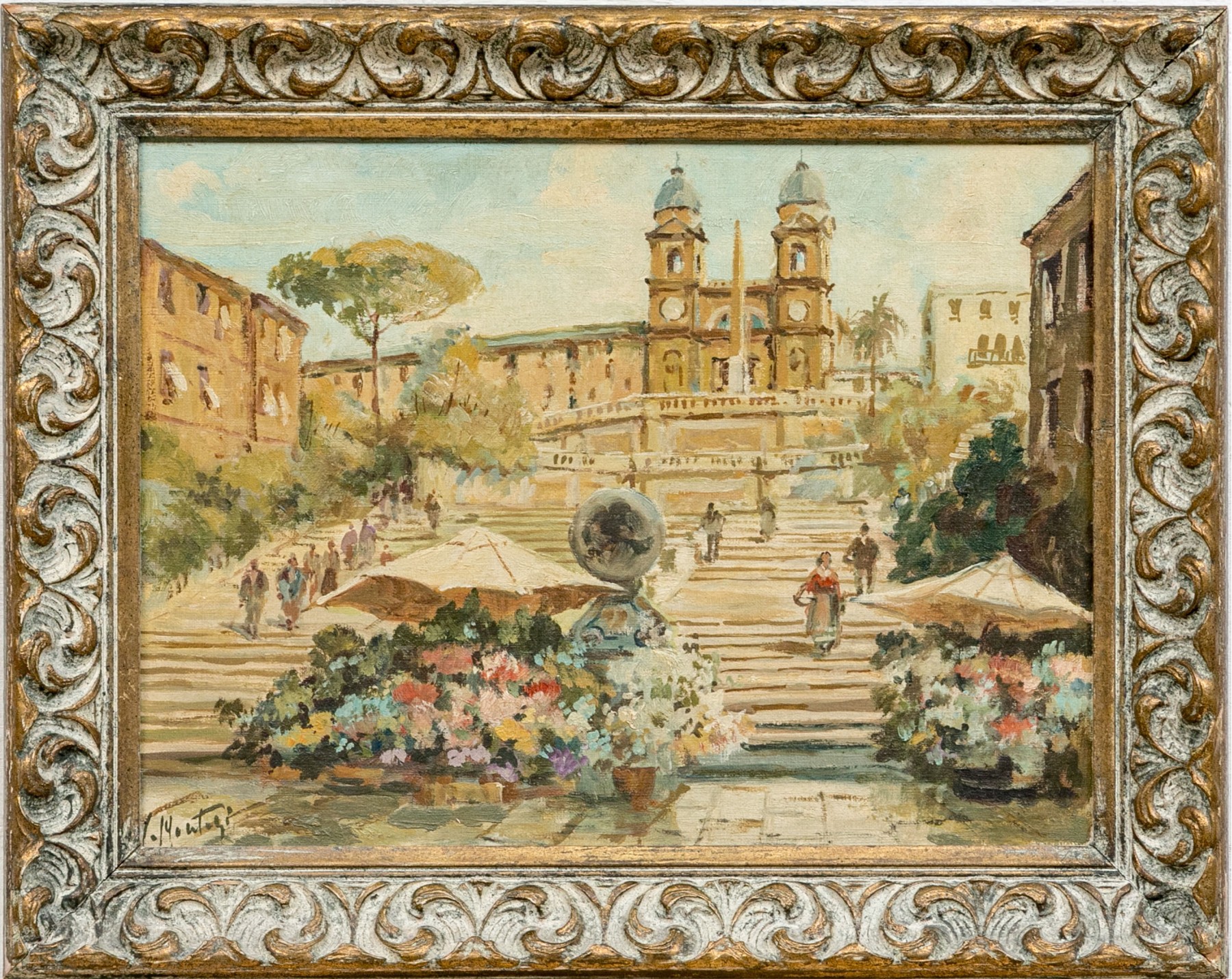 Signed indistinctly lower left. A view of the famous steps with some figures and flower sellers at the bottom. Presented in a foliate scrolled antiqued gilt wood frame.