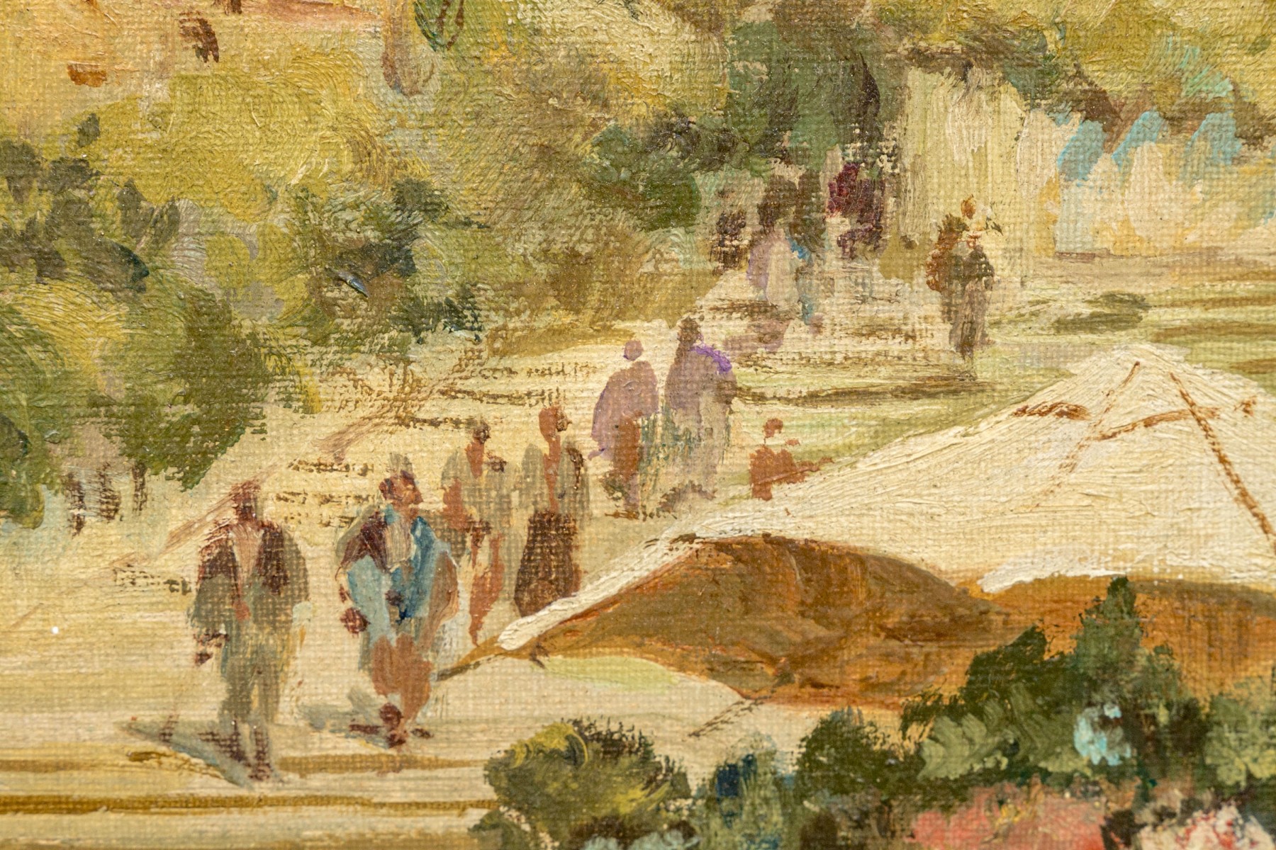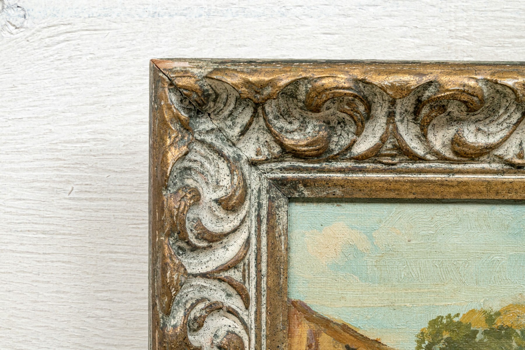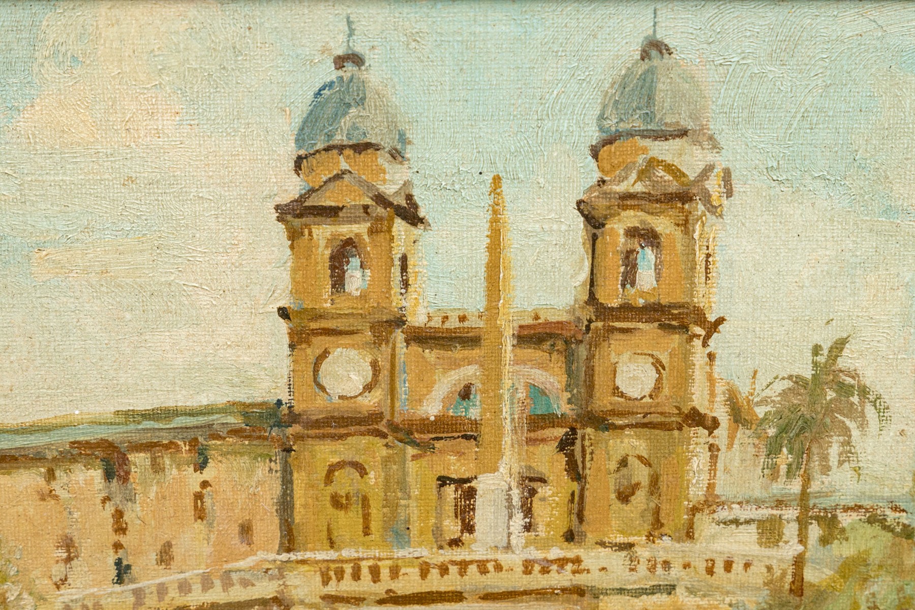 Signed indistinctly lower left. A view of the famous steps with some figures and flower sellers at the bottom. Presented in a foliate scrolled antiqued gilt wood frame.