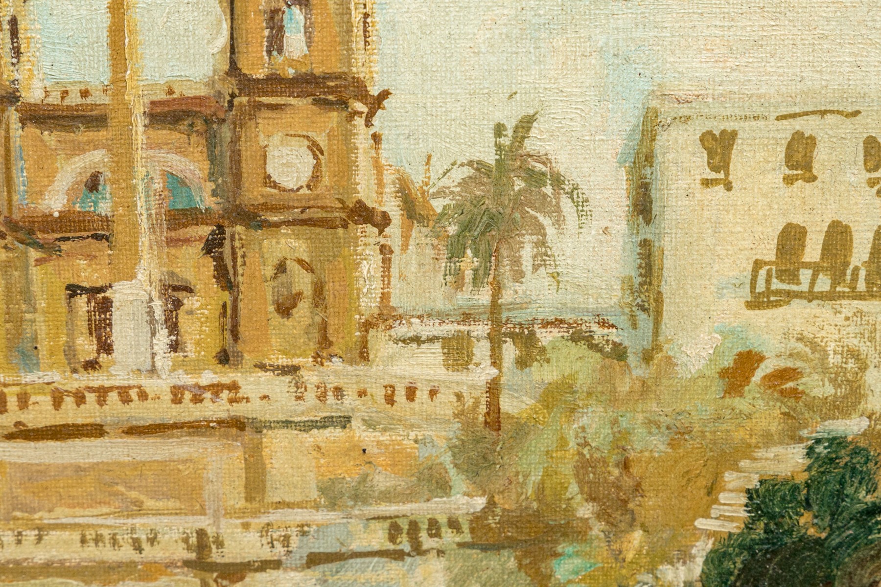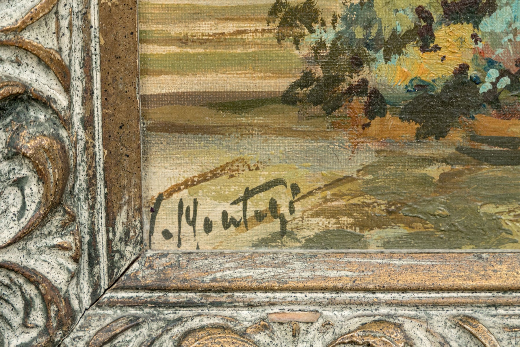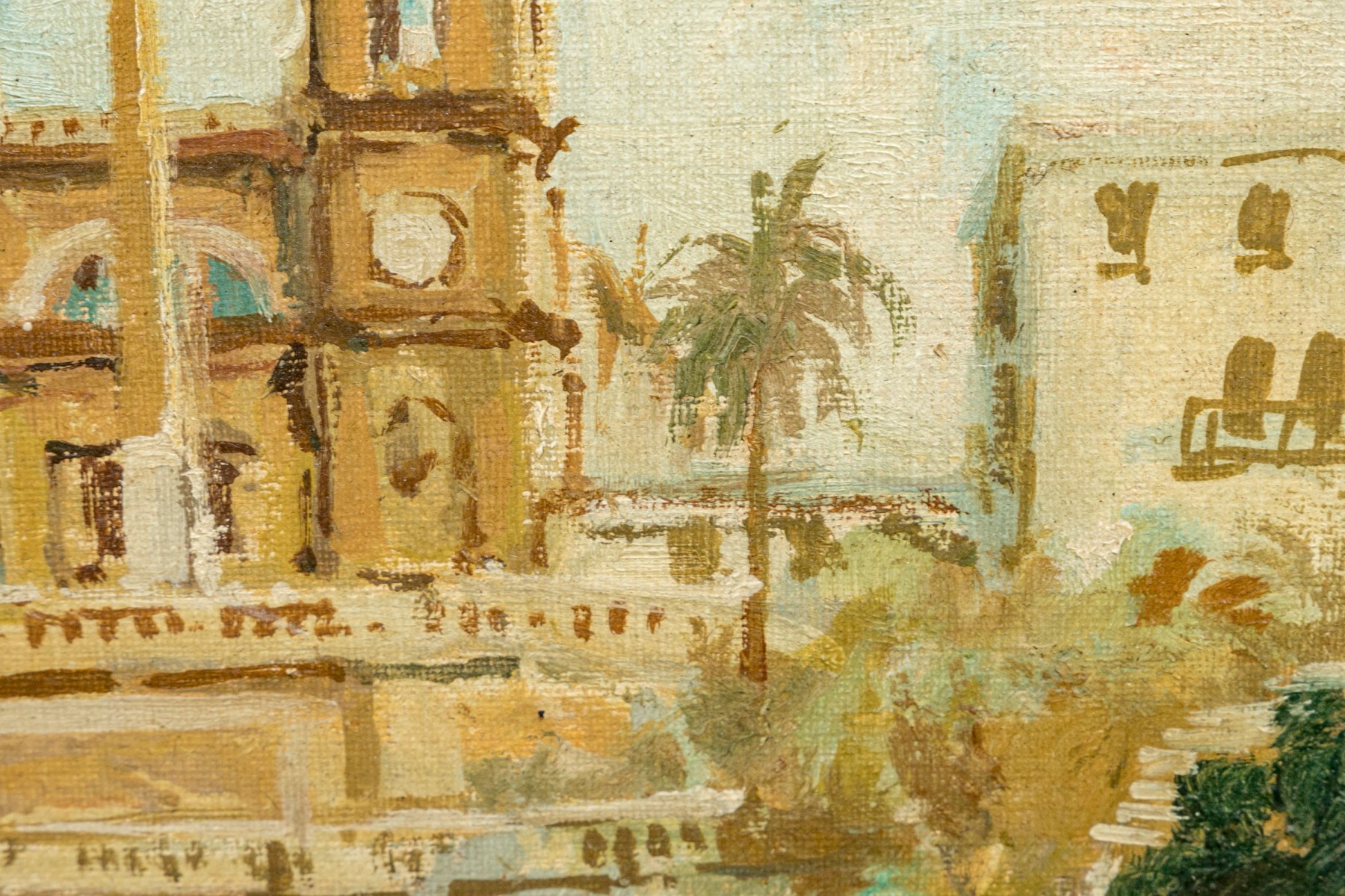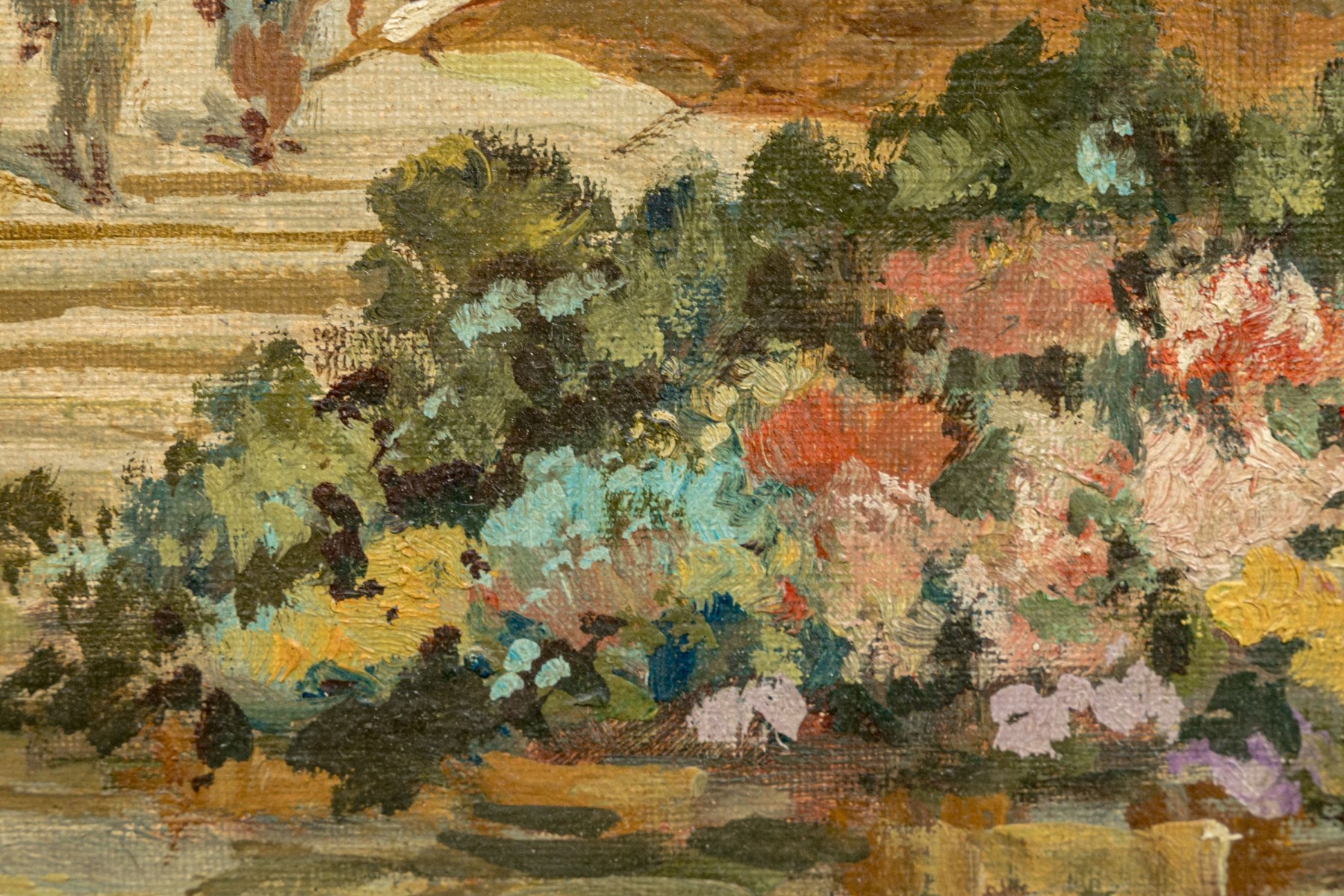Signed indistinctly lower left. A view of the famous steps with some figures and flower sellers at the bottom. Presented in a foliate scrolled antiqued gilt wood frame.