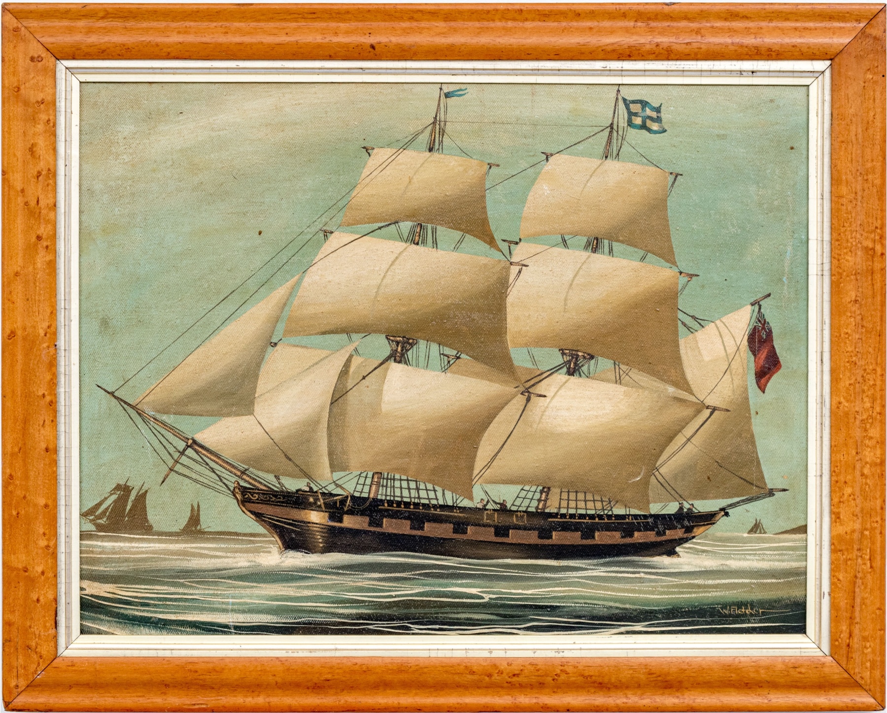 A well rendered oil painting on canvas depicting a classic scene of a clipper ship in profile flying a Red Duster. The ship is designed with a striking black hull decorated with golden battlement styled moulding giving the ship an elegant appearance as it sails over calm teal water with other ships seen in the distance. Signed W. Fletcher lower right.