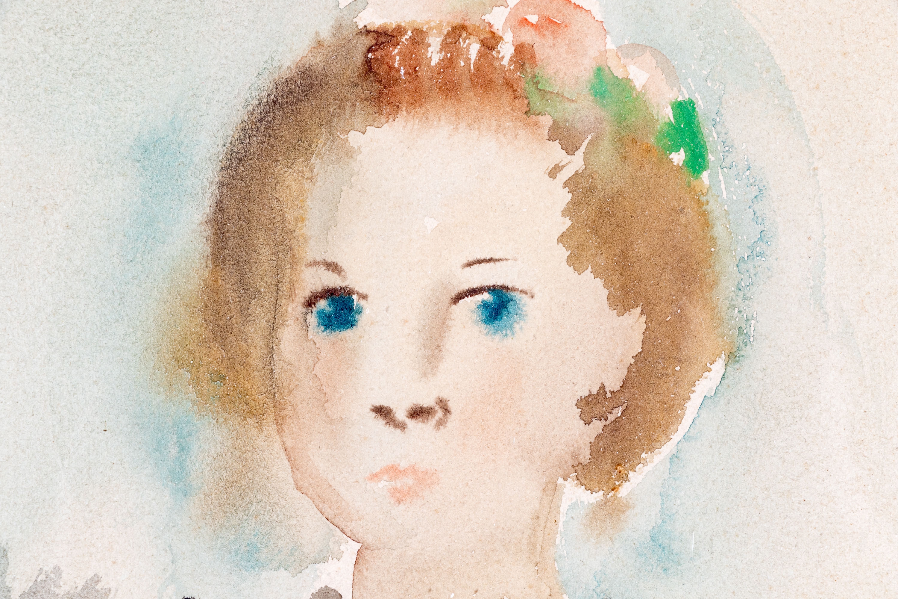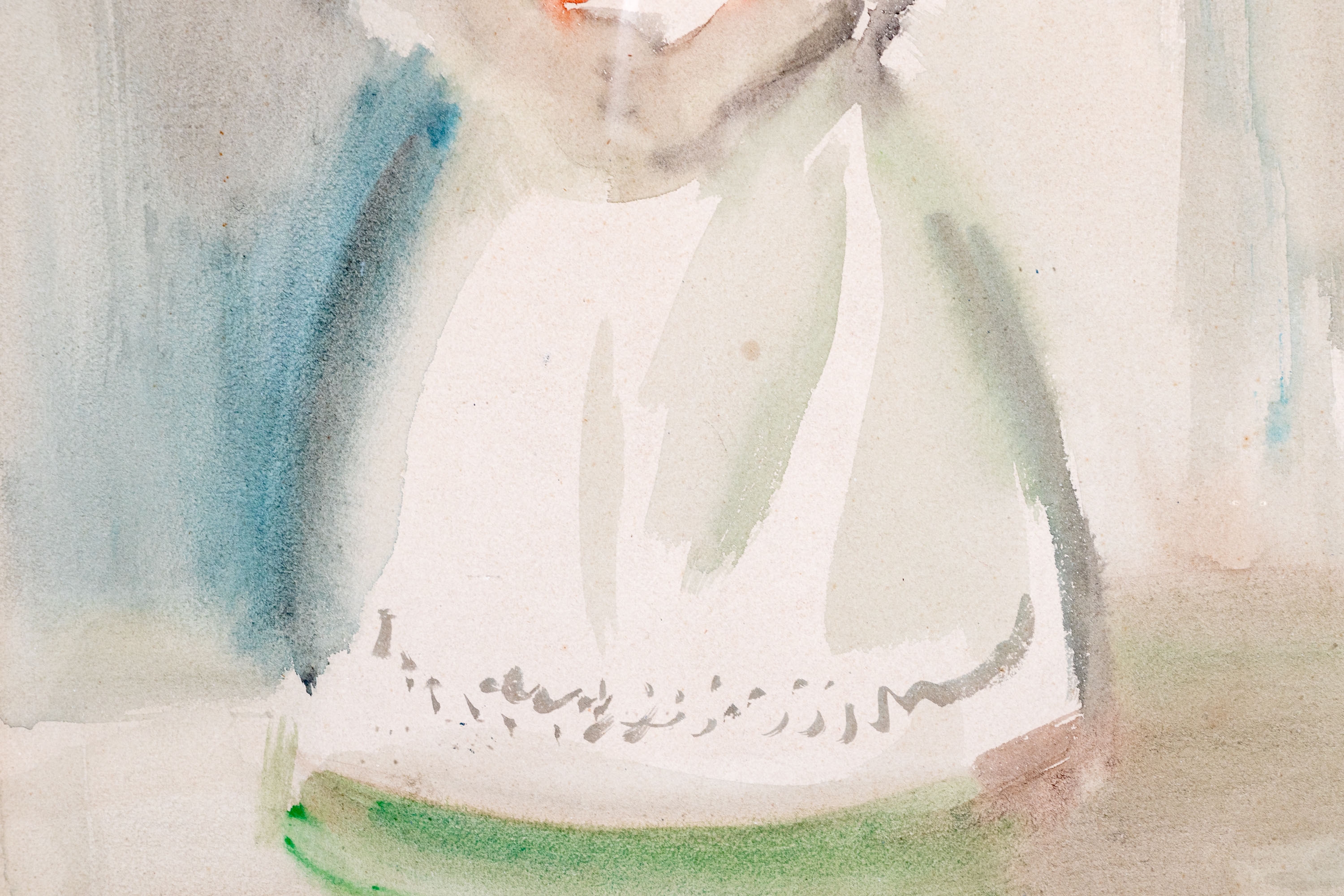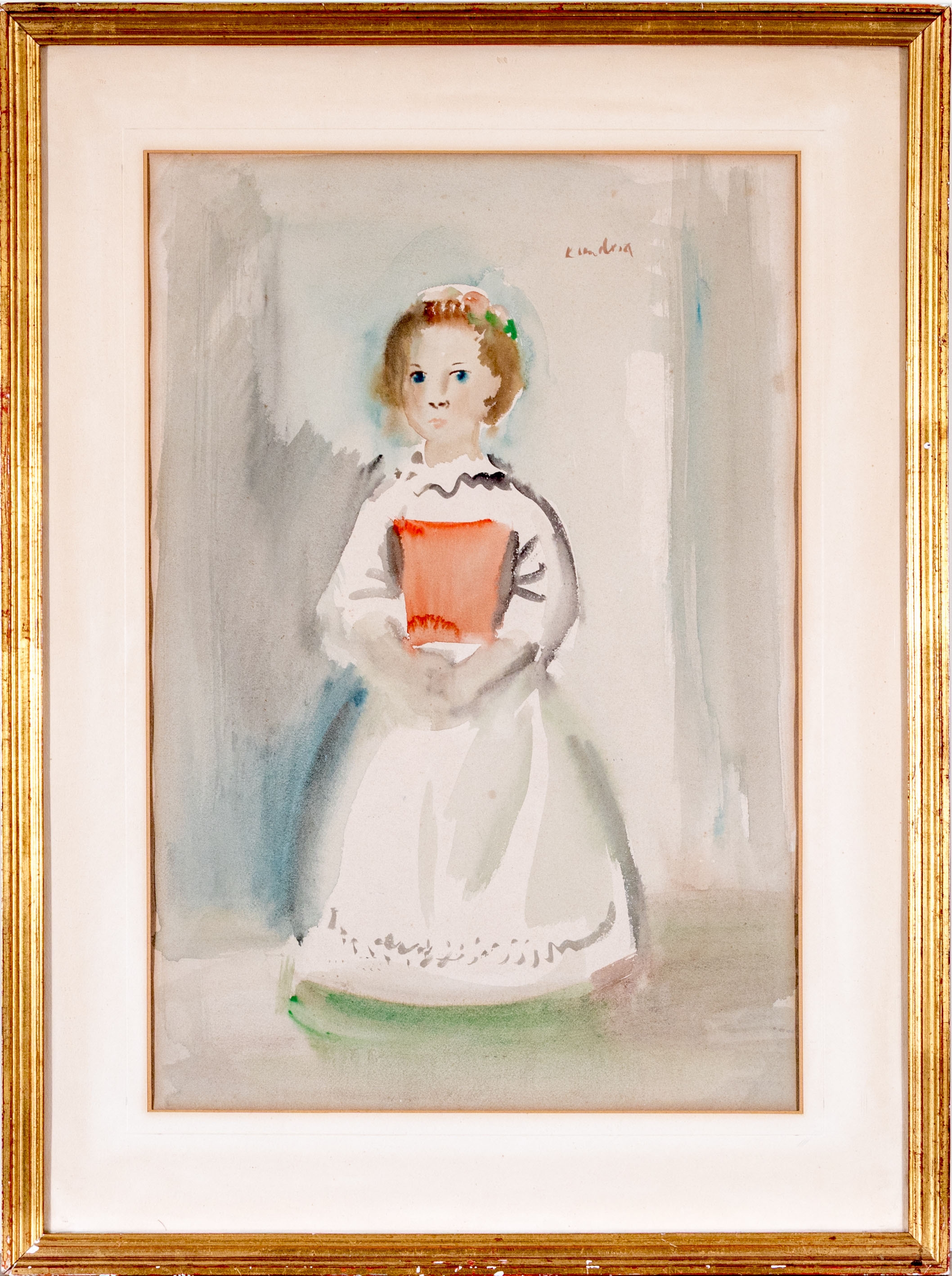 A lovely watercolor painting depicting a young girl in a long white and red dress standing against a light background with blue and green accents. Signed upper right.