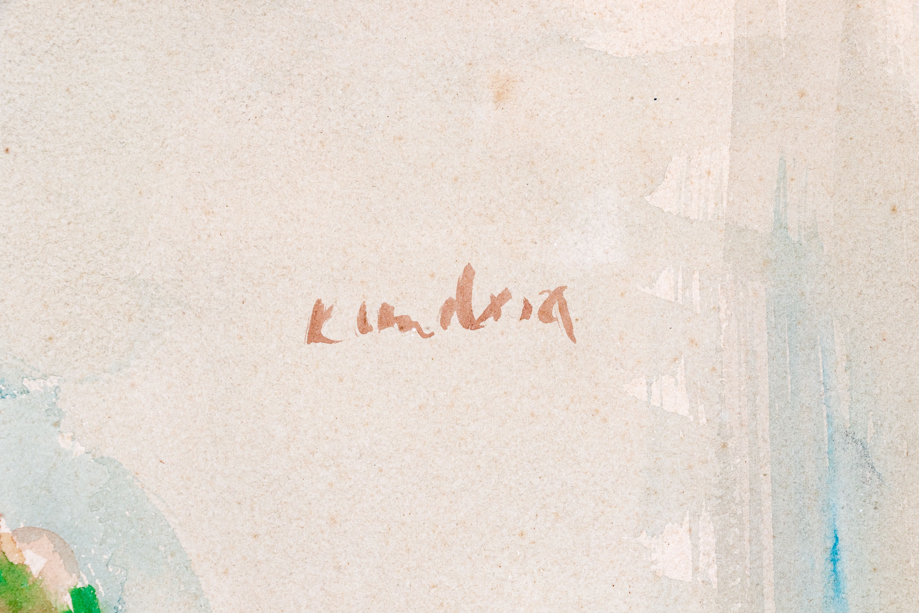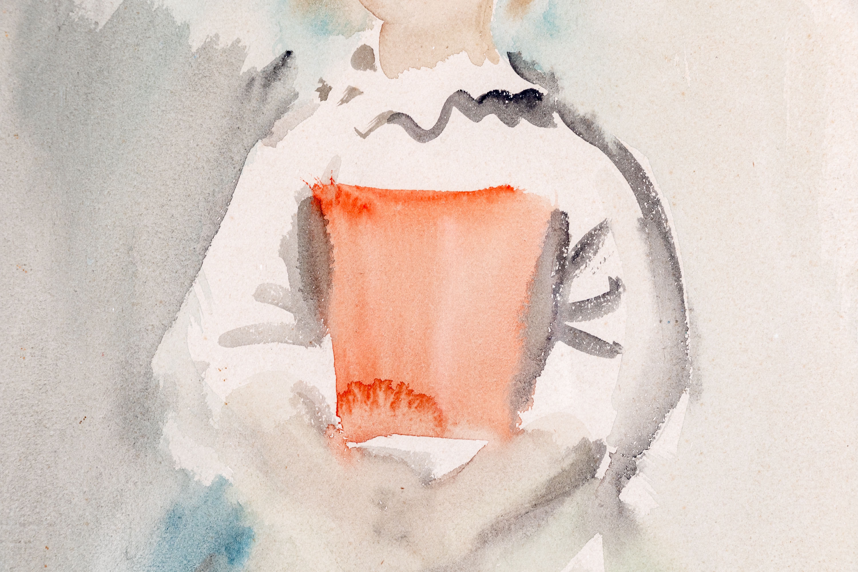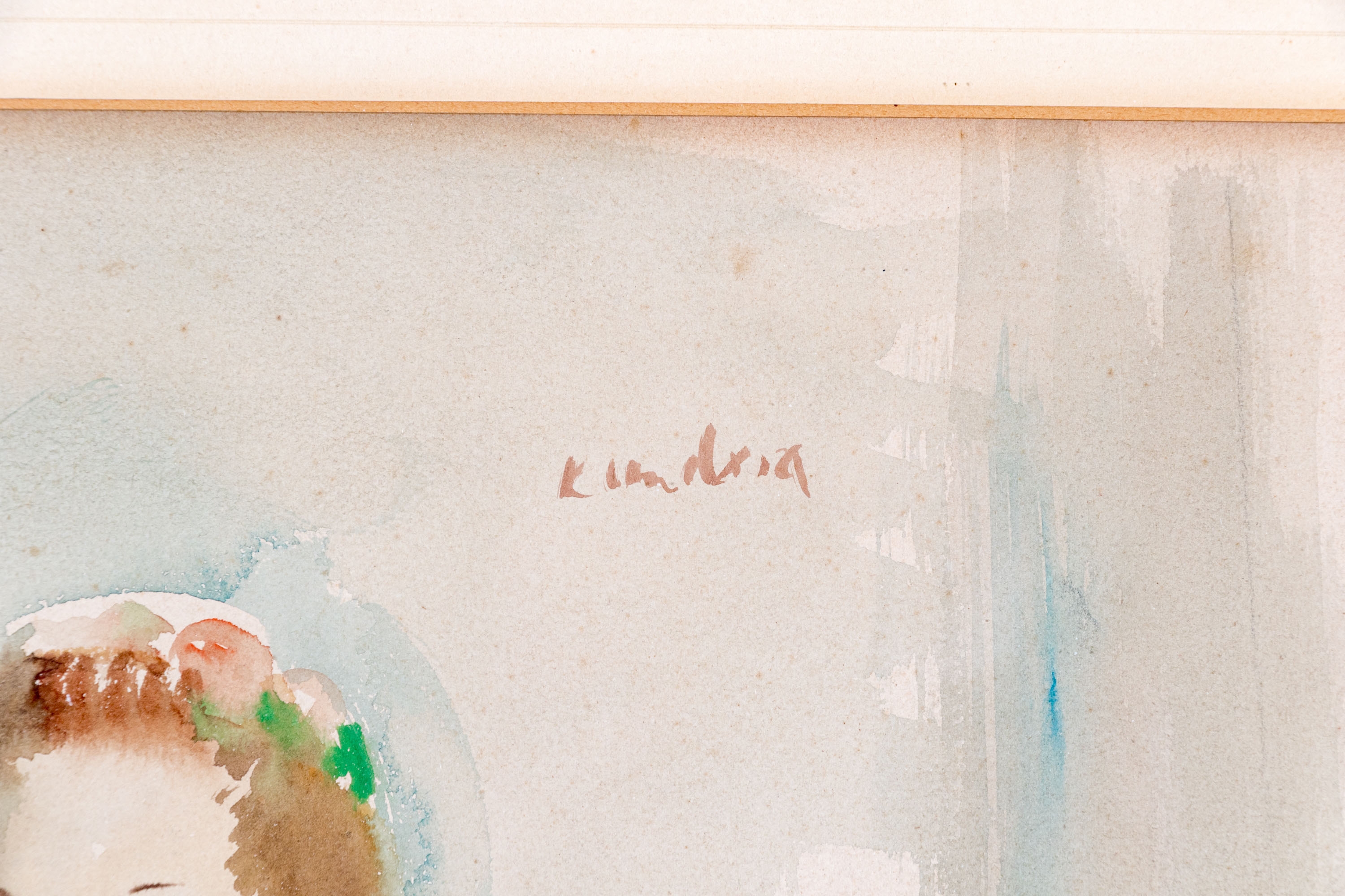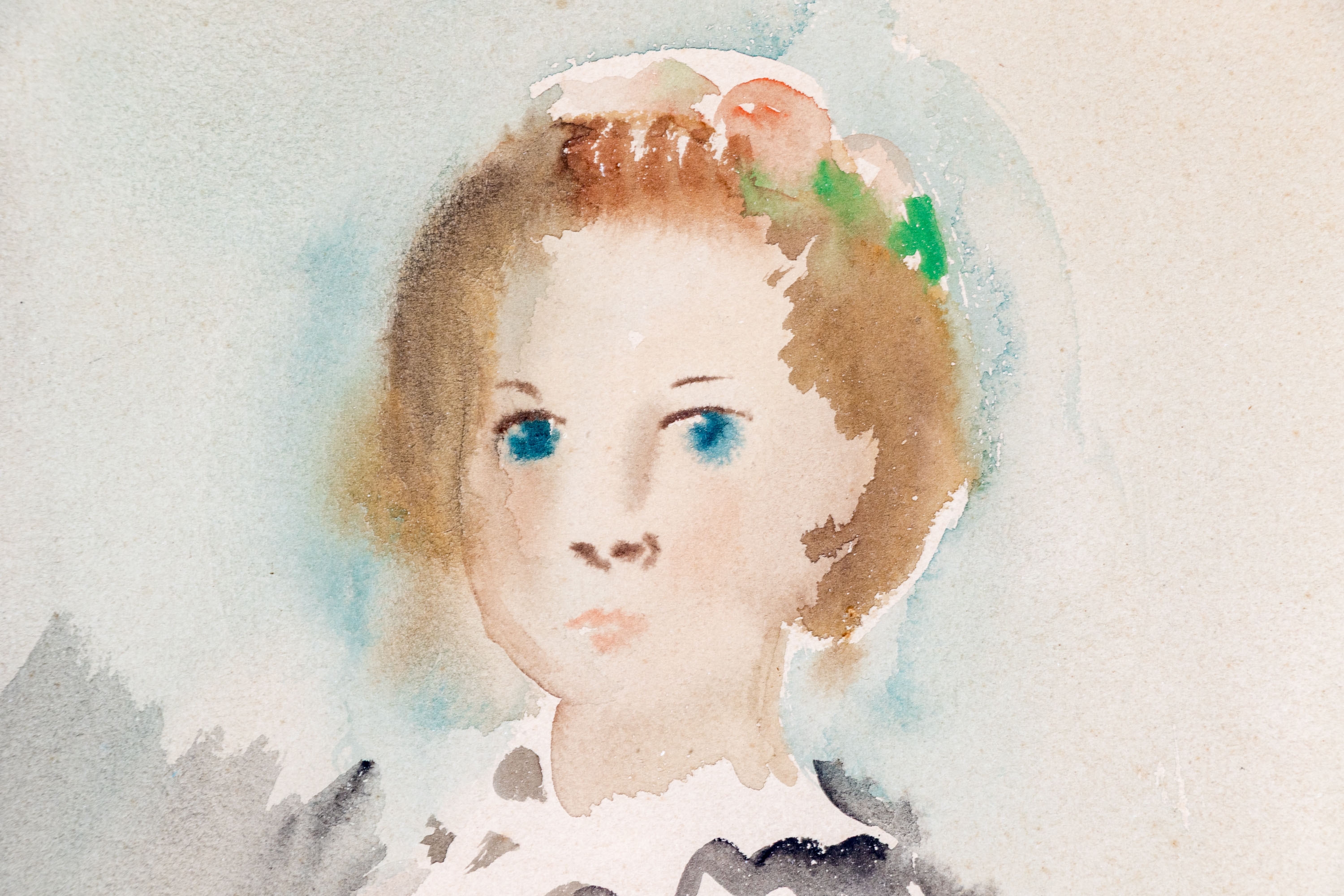 A lovely watercolor painting depicting a young girl in a long white and red dress standing against a light background with blue and green accents. Signed upper right.