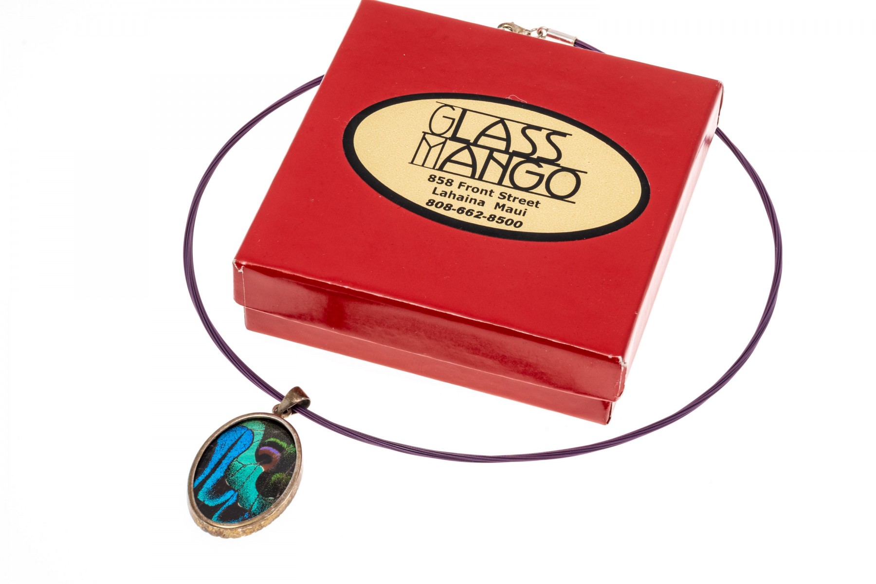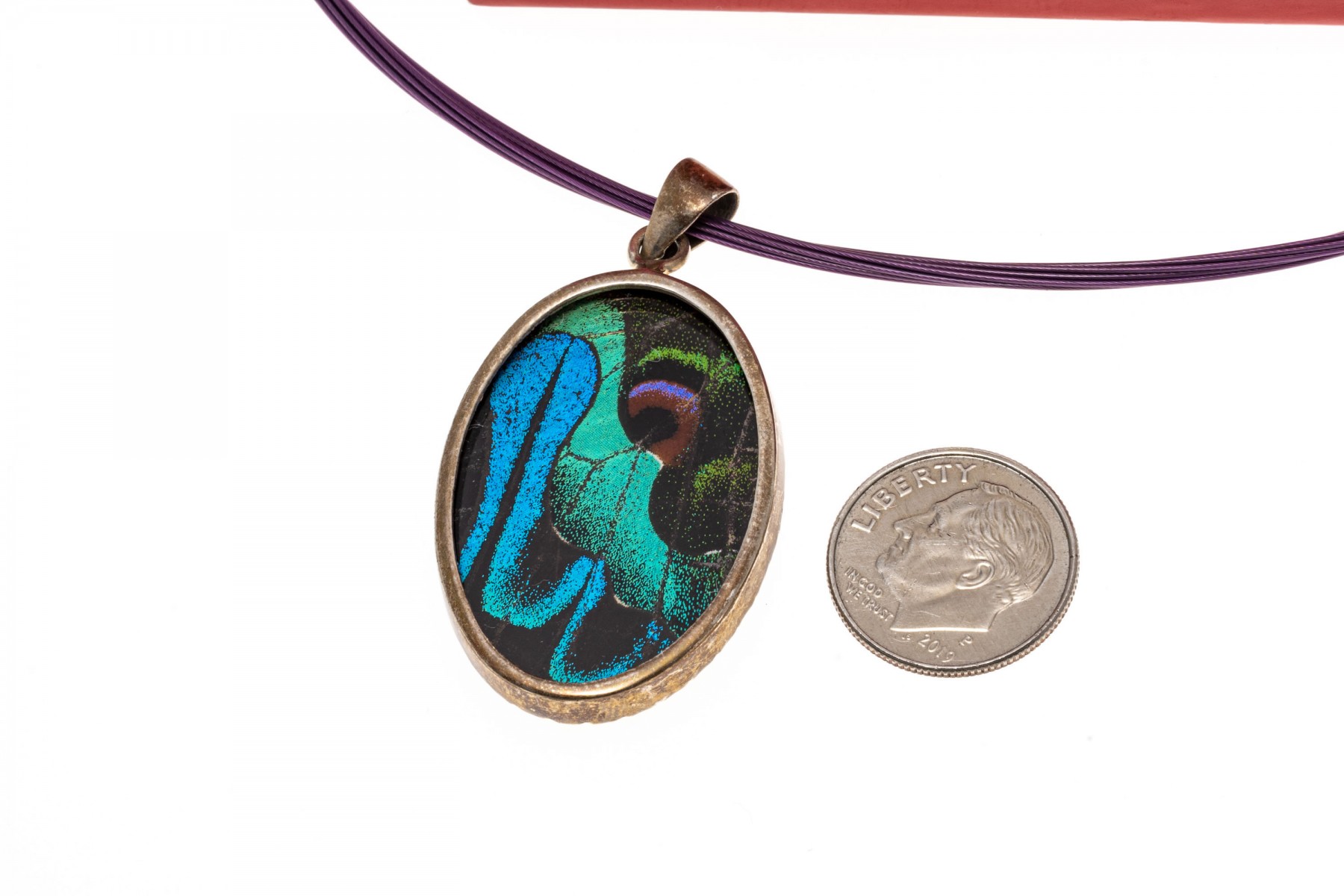 Dimensions: 6 1/4" L x 1" W-Charm Bracelet, 2" L x 1 1/16" W-Brooch with synthetic stone, 17 1/2" Purple cord with 1" W x 1 13/16" L (with bale)-Butterfly wing pendant necklace, 1/4" and 5/8" Across Tops-Rings.