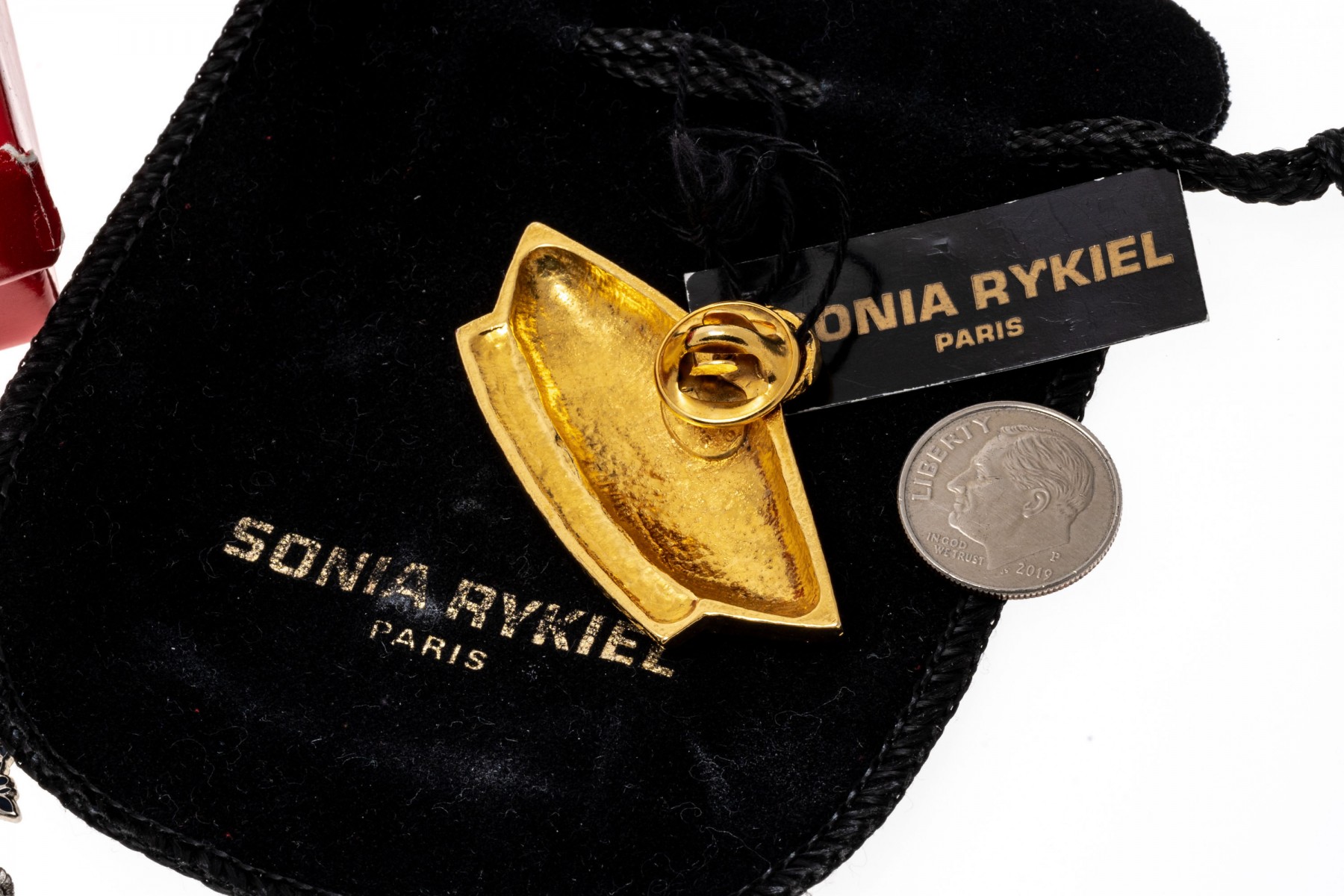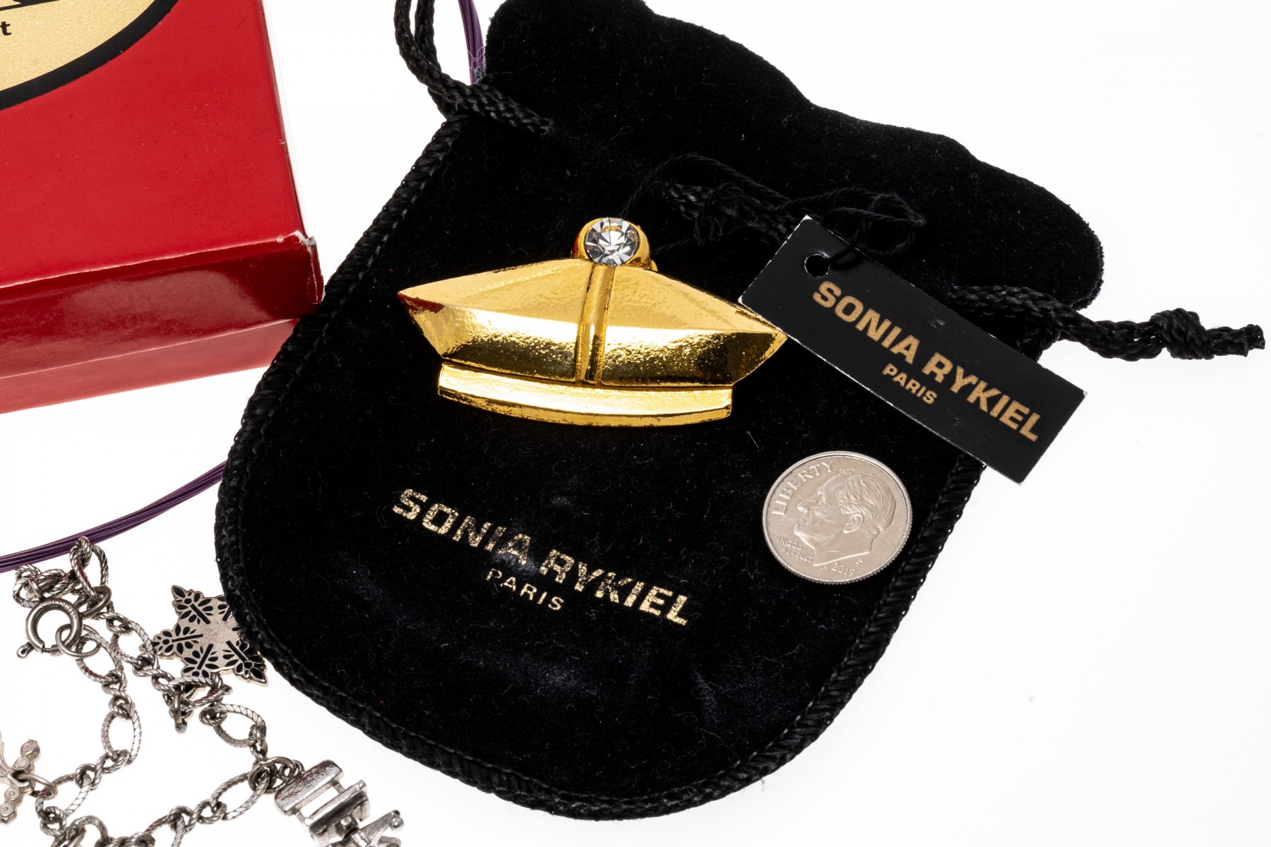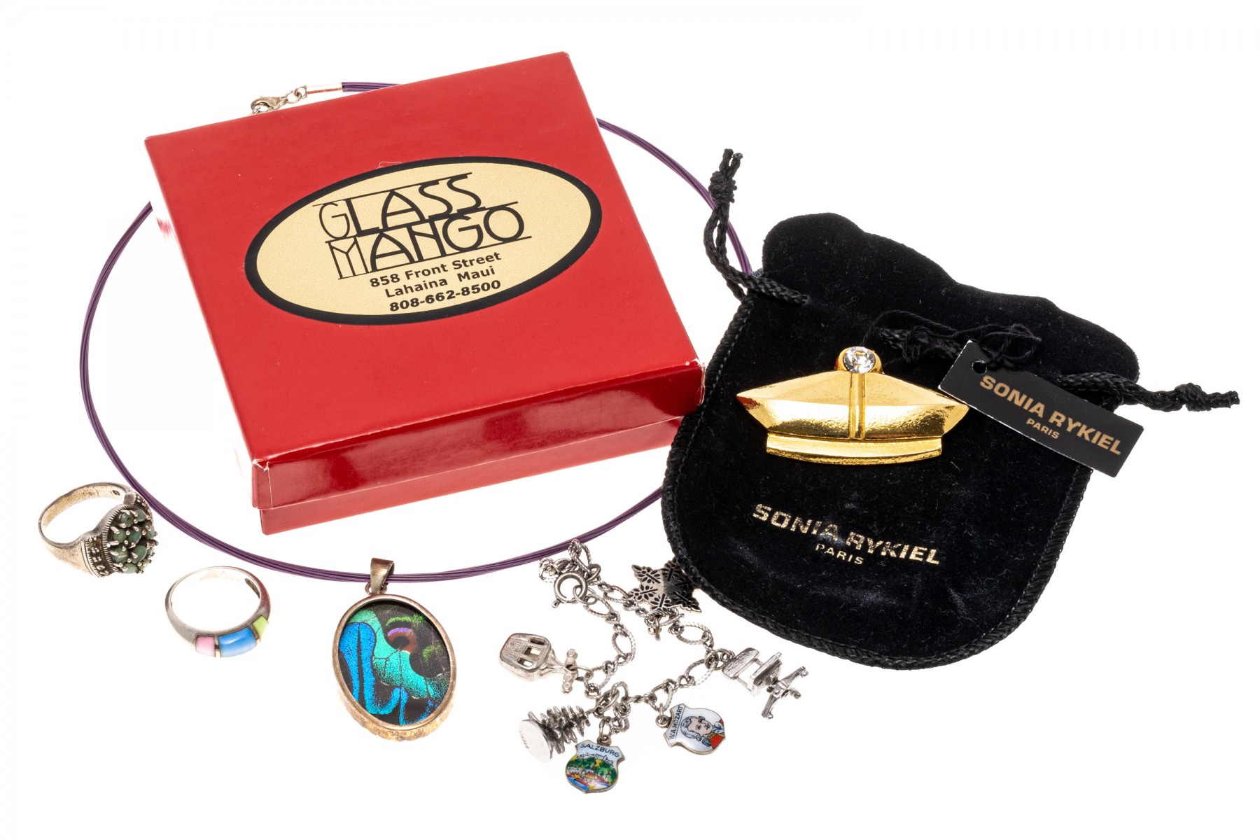 A collection of costume jewelry. These pieces include a Sonia Rykiel brooch, two sterling silver rings, a charm bracelet with silver and fashion charms, a sterling necklace with a butterfly wing pendant. The charm bracelet has three 800 silver charms, two sterling silver charms and a snowflake fashion charm. Rings sizes 7.25 and 8.