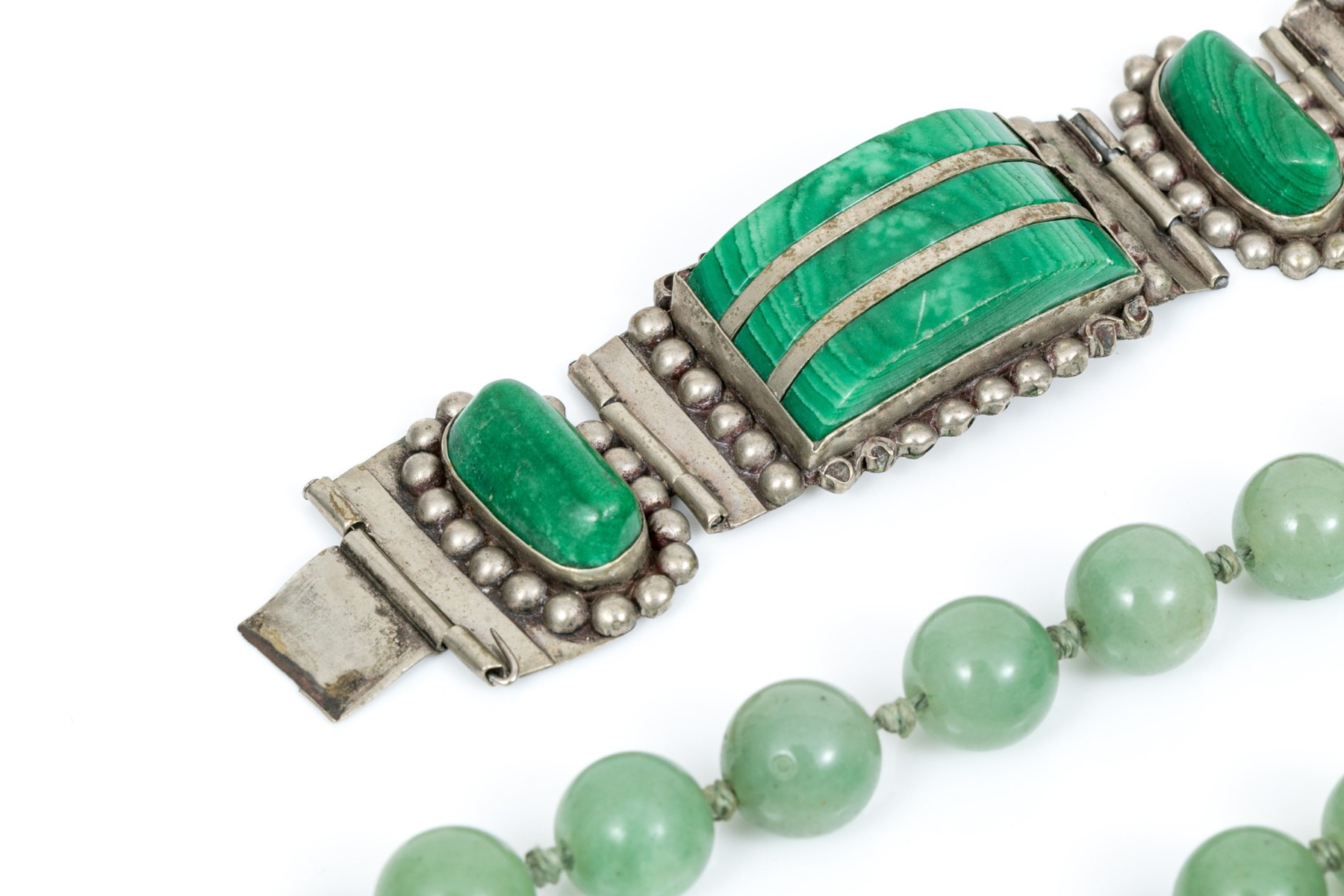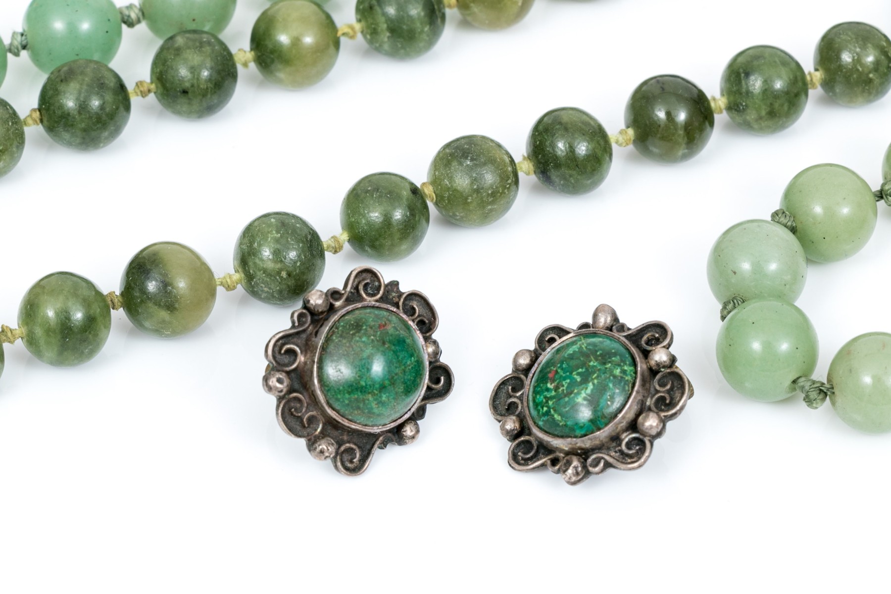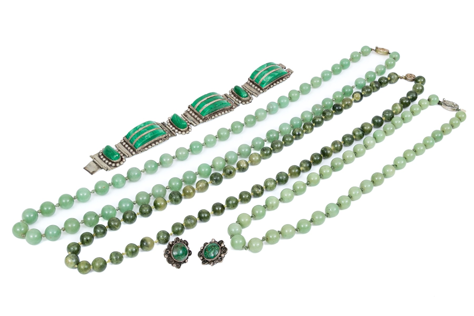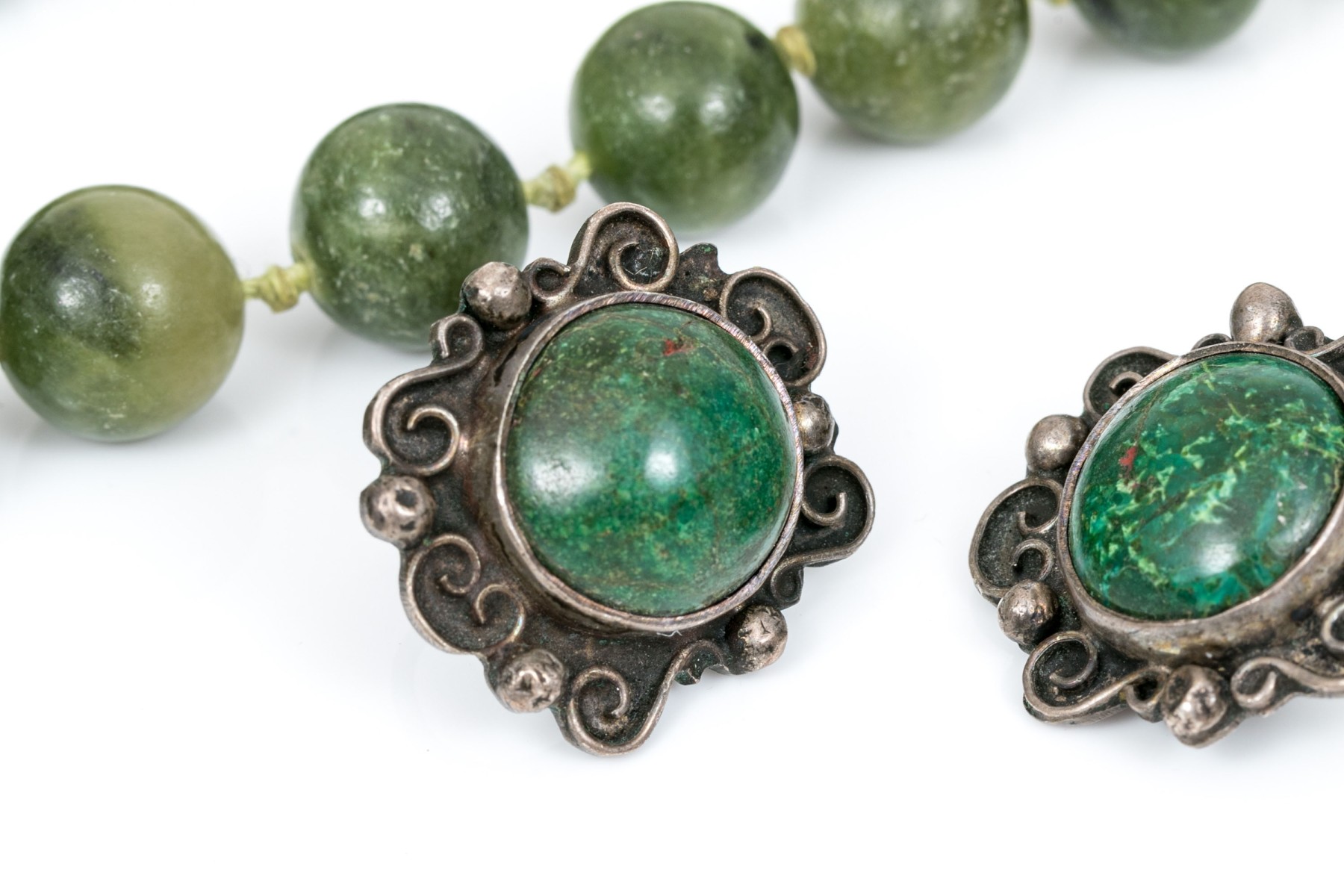 Collection of silver jewelry. Three beaded necklaces, two aventurine and one serpentine, box clasps. One bracelet with malachite, box clasp. Clip back earrings.