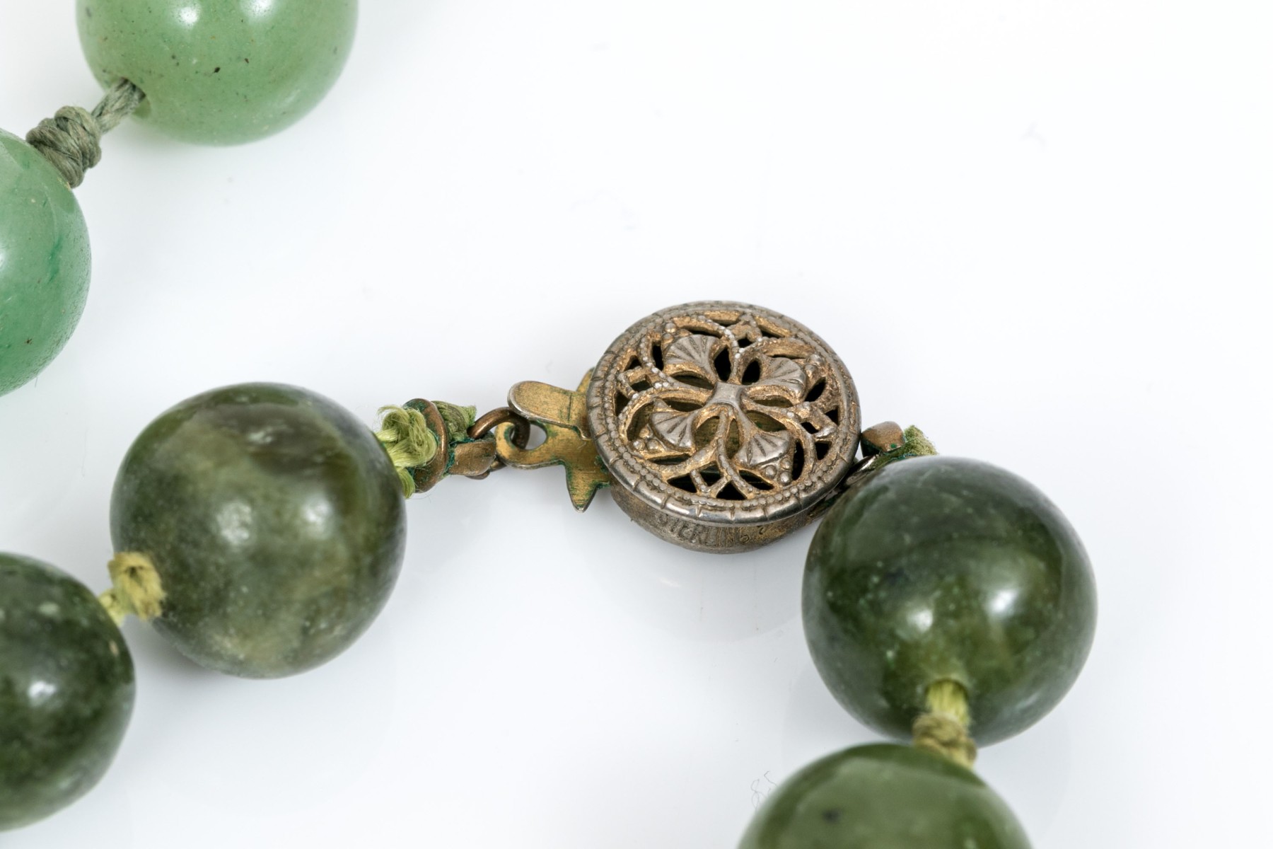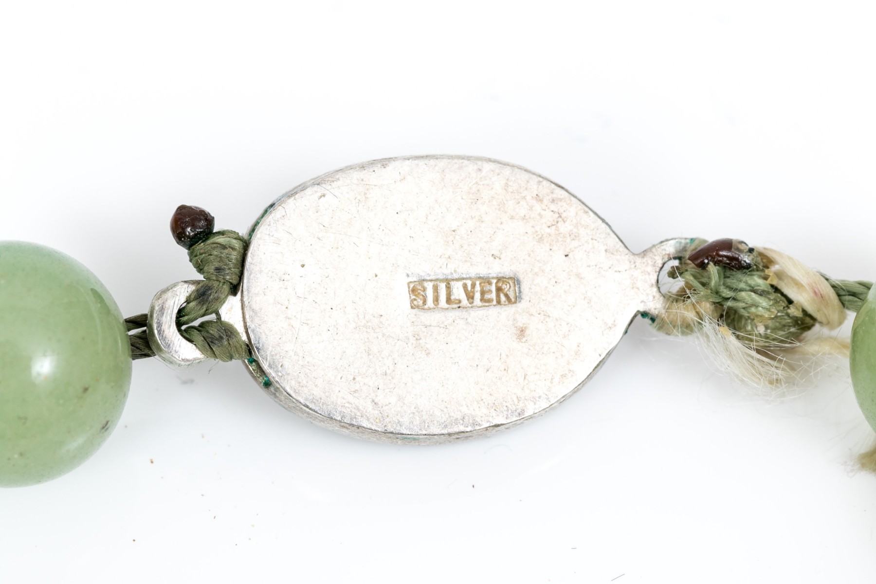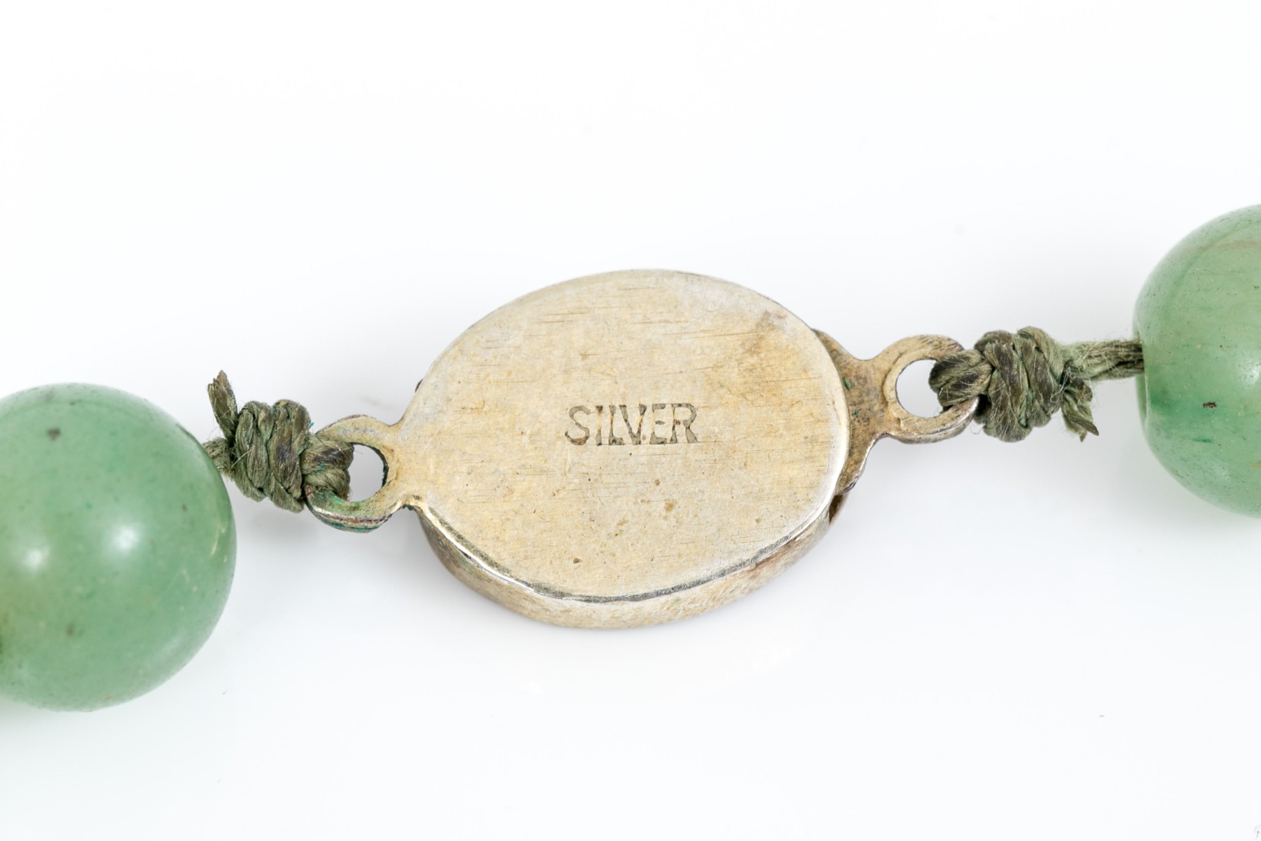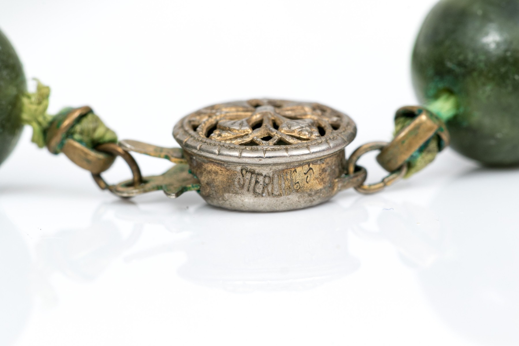 Collection of silver jewelry. Three beaded necklaces, two aventurine and one serpentine, box clasps. One bracelet with malachite, box clasp. Clip back earrings.