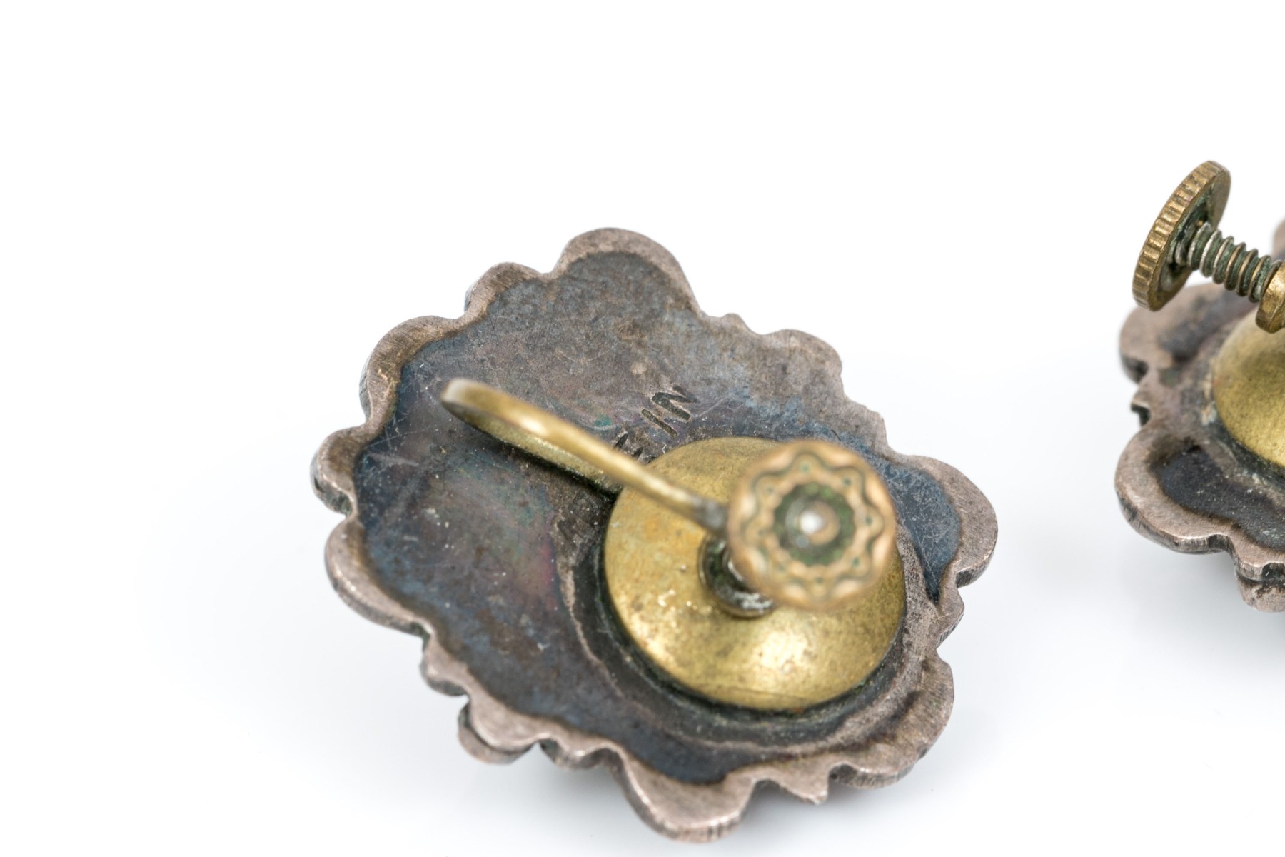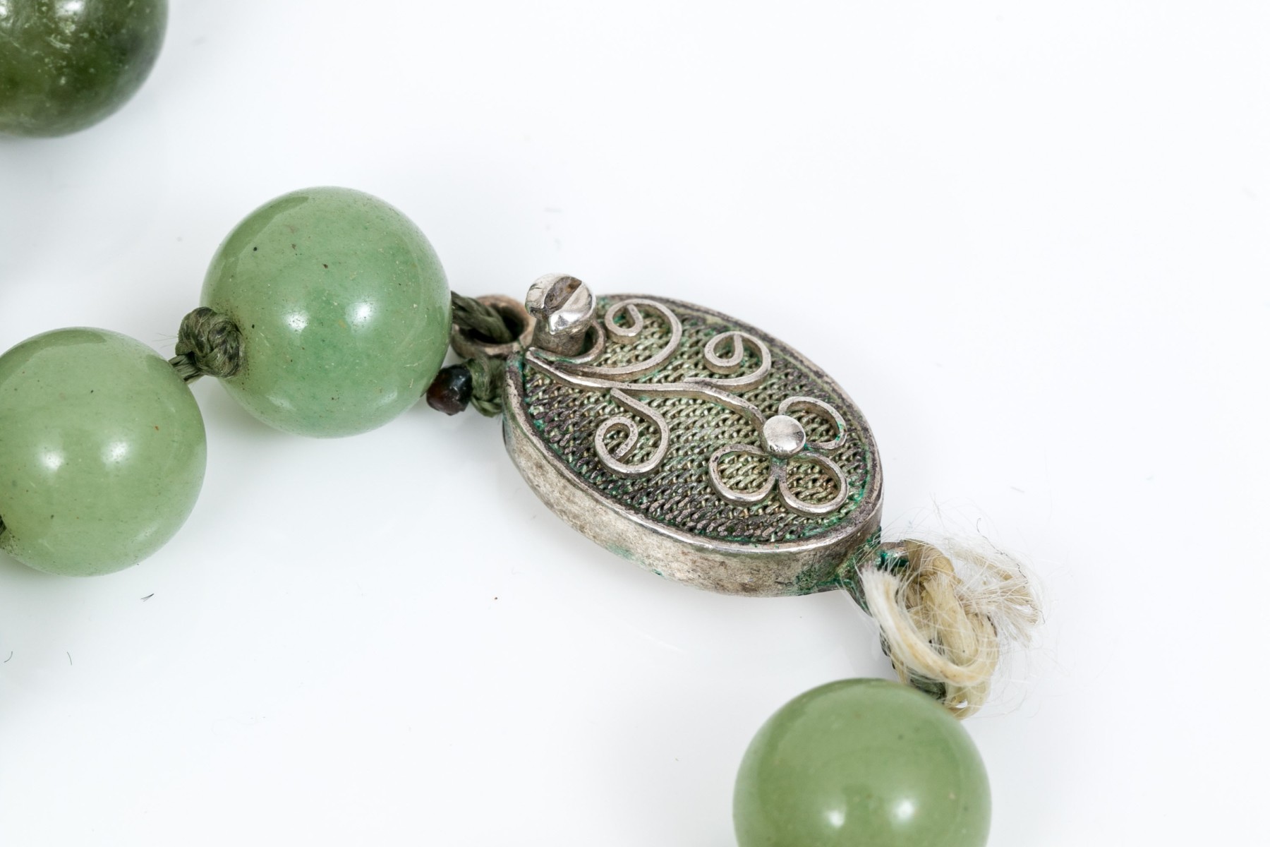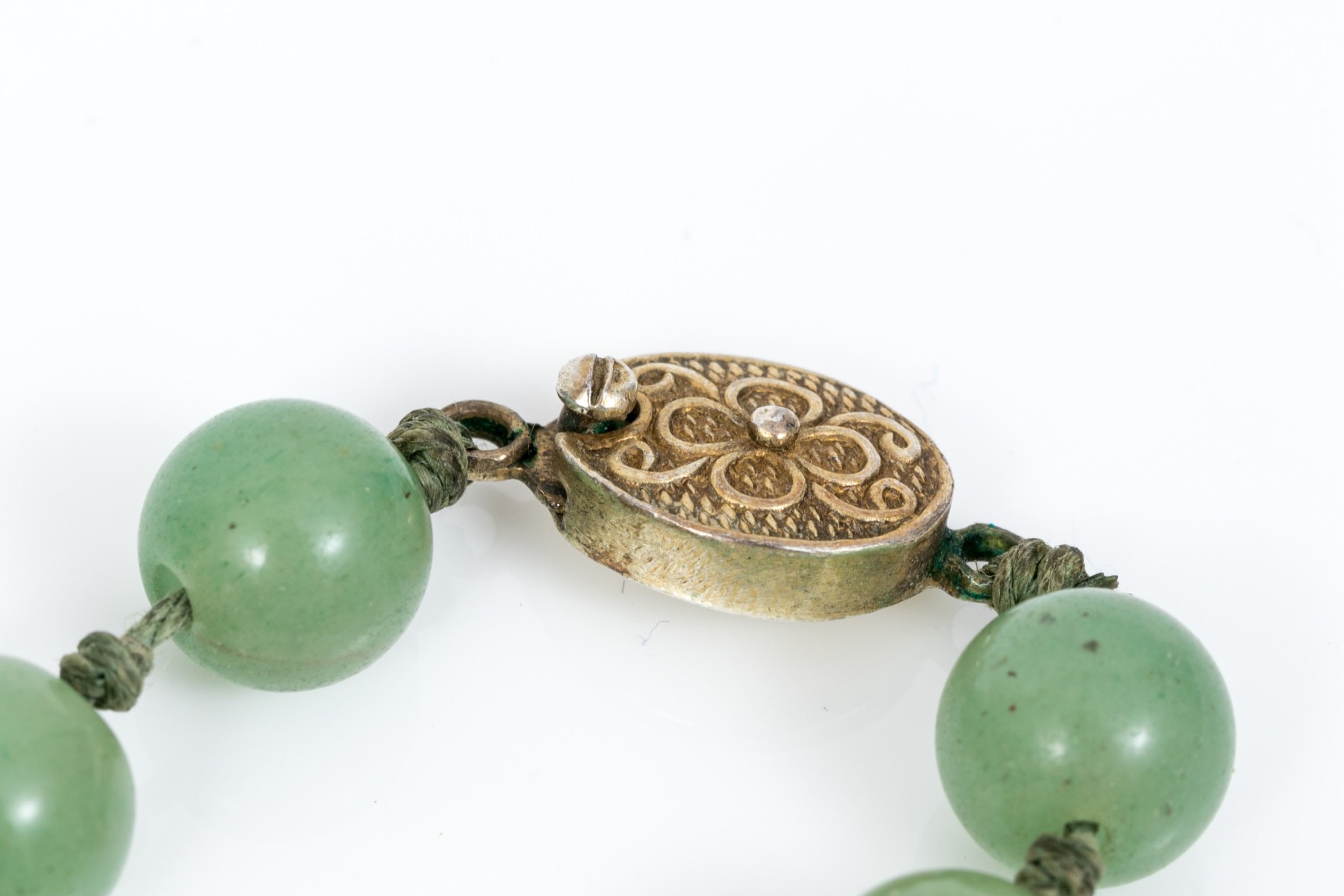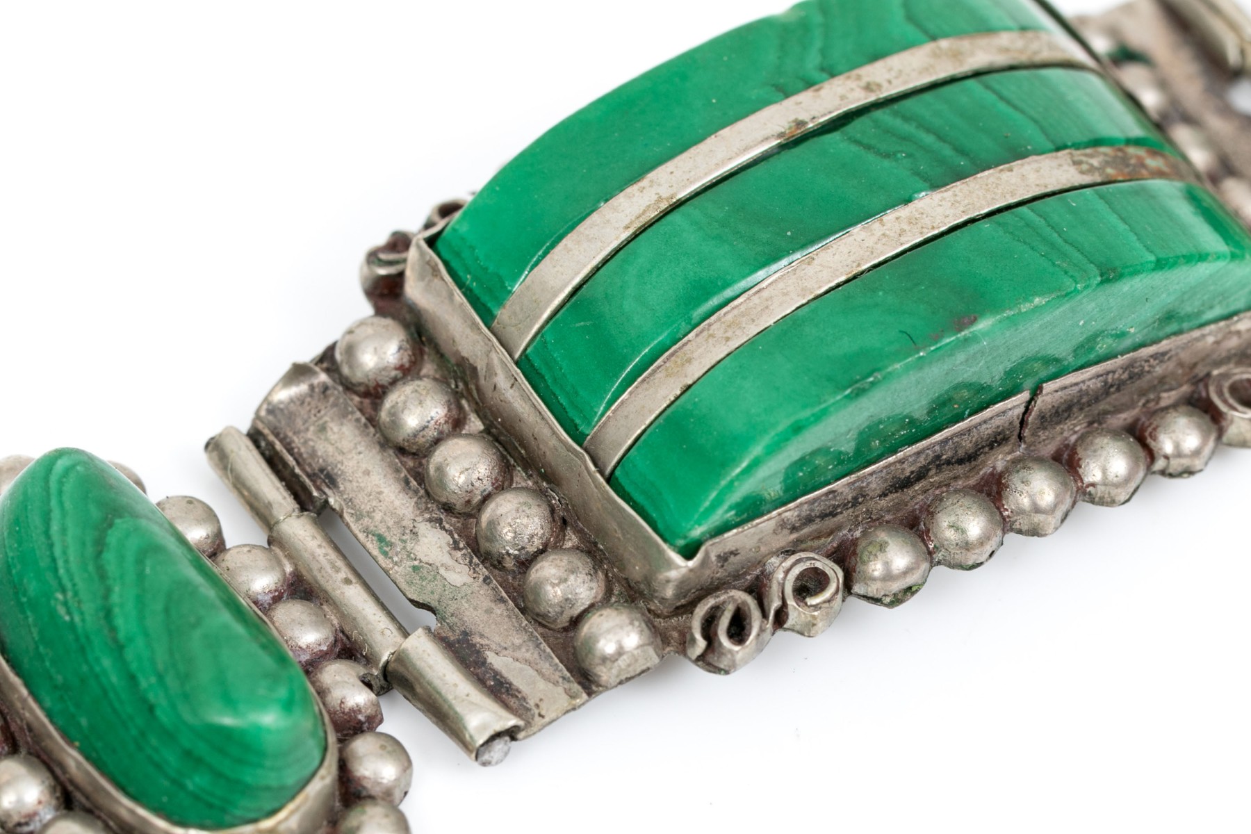 Collection of silver jewelry. Three beaded necklaces, two aventurine and one serpentine, box clasps. One bracelet with malachite, box clasp. Clip back earrings.