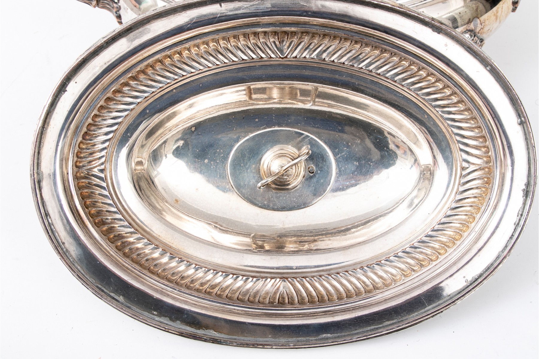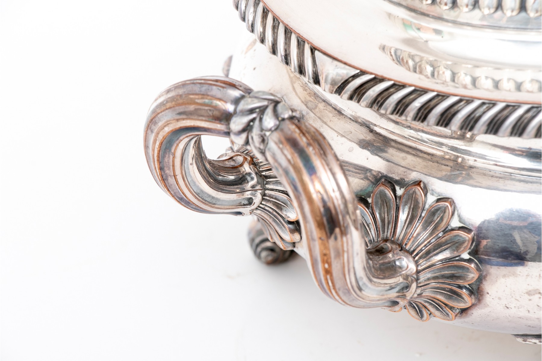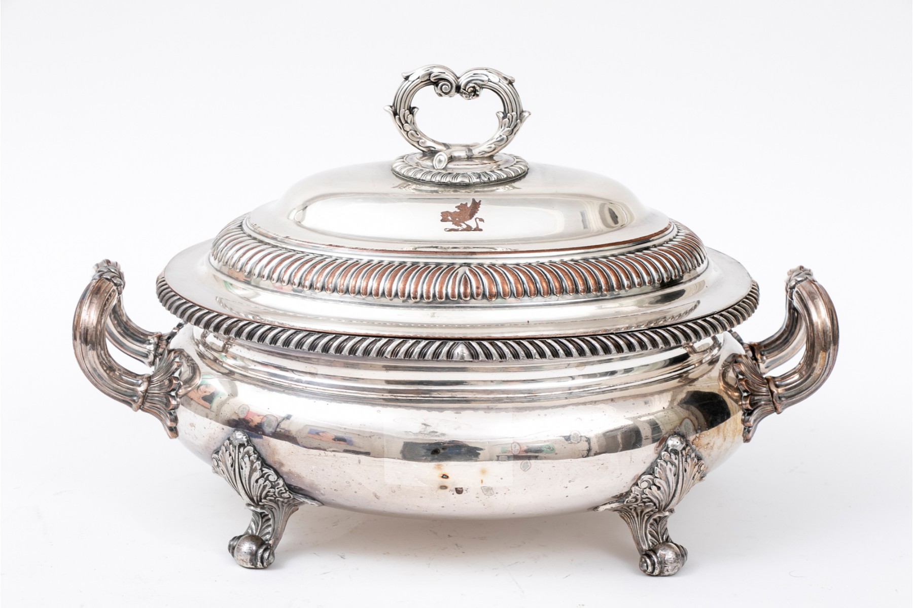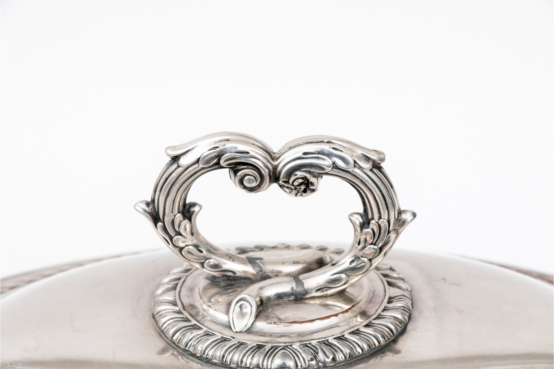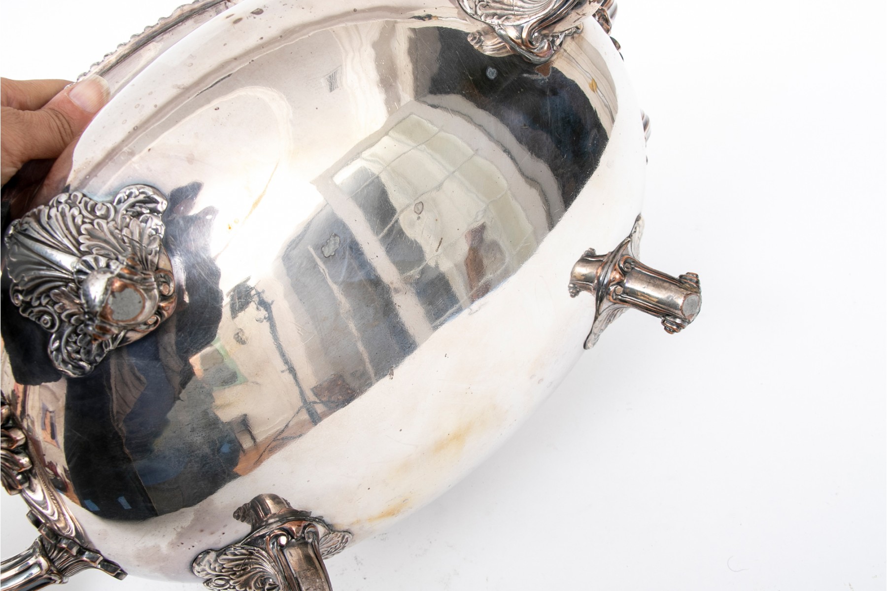Silver plate lidded dish with dual rococo handles, griffin image on lid, foliate turned legs, C-scroll finial.