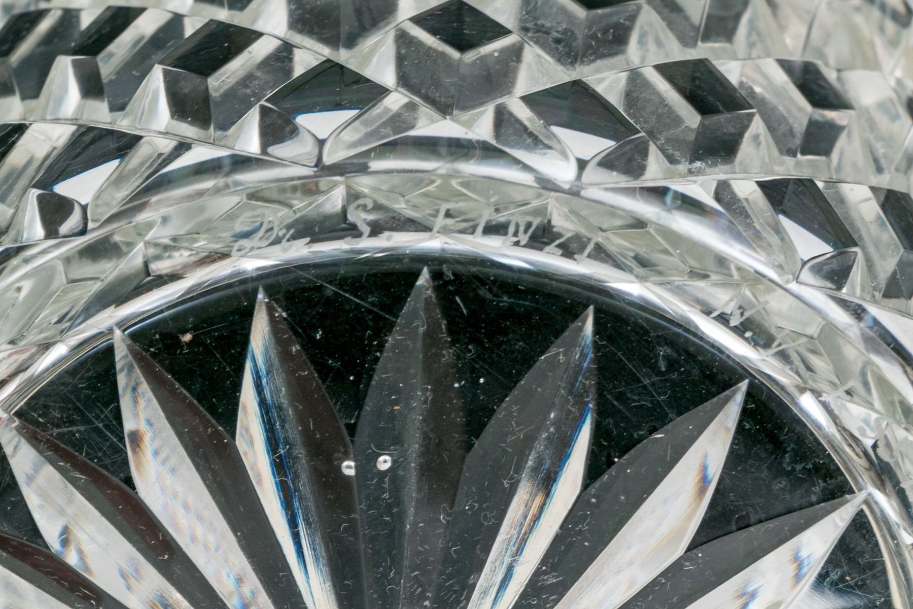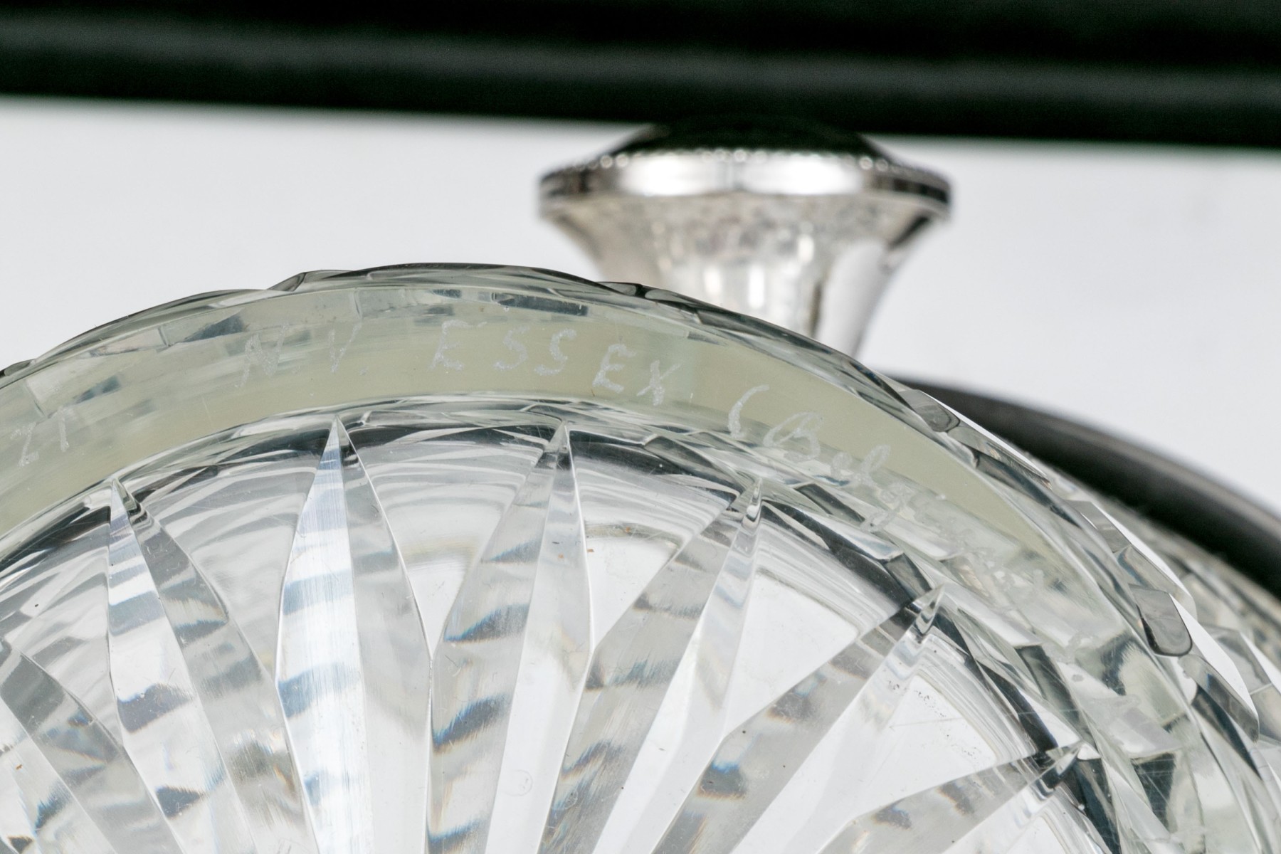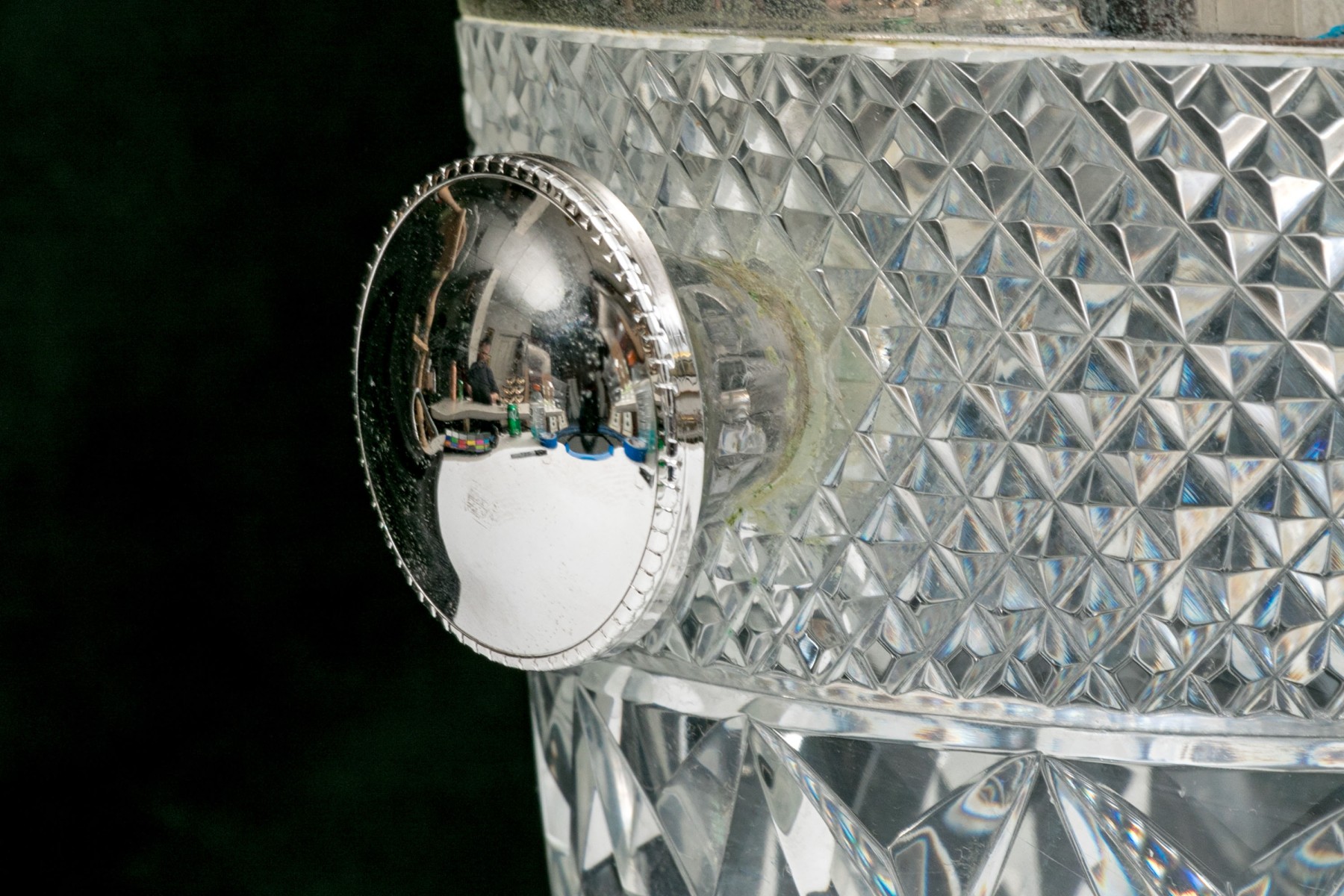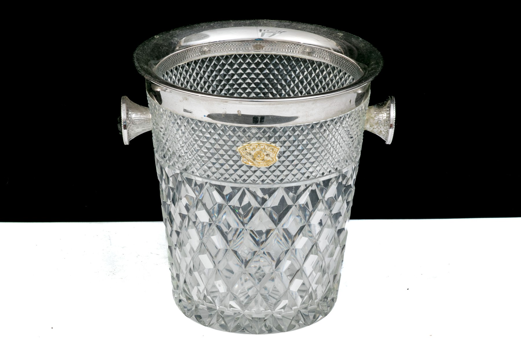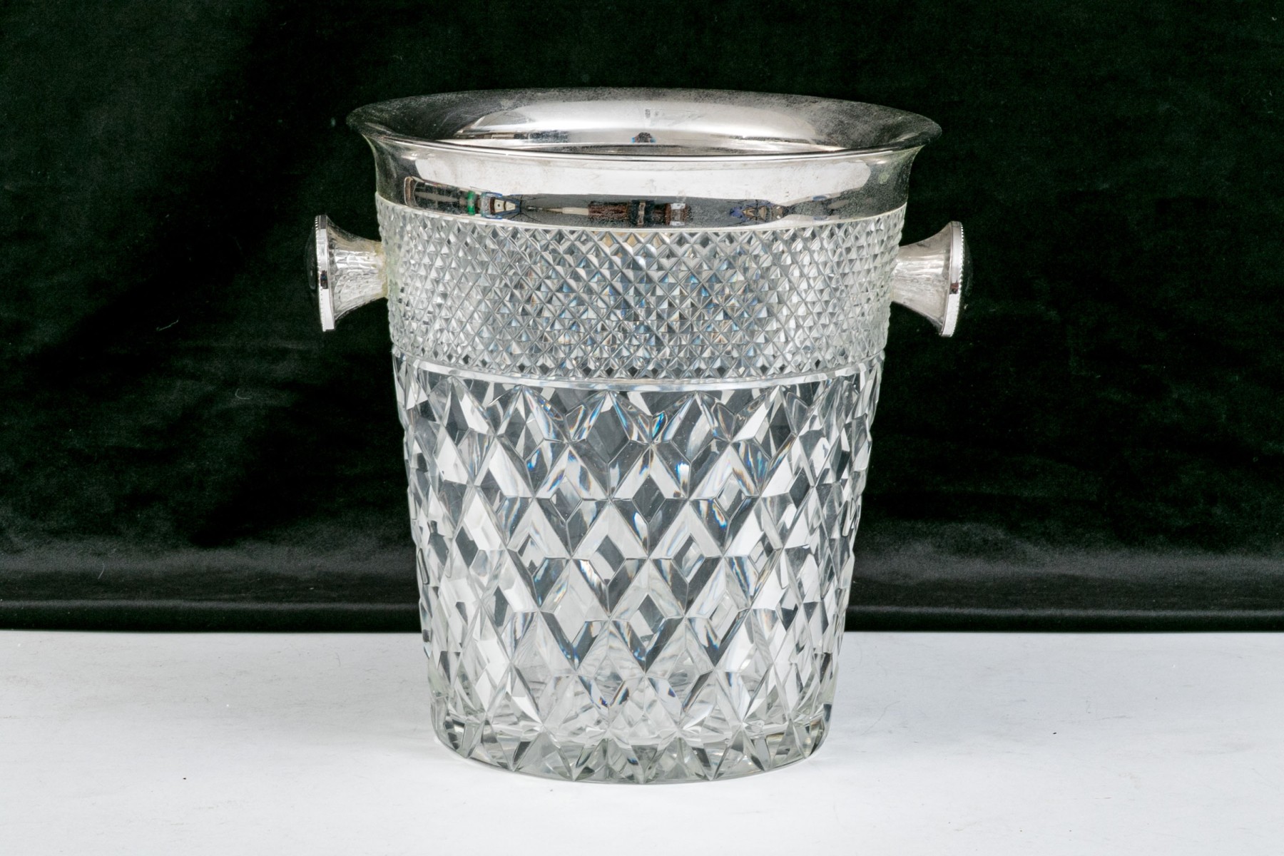 Handsomely crafted cut crystal vessel with silver plated handle and two knob form handles.