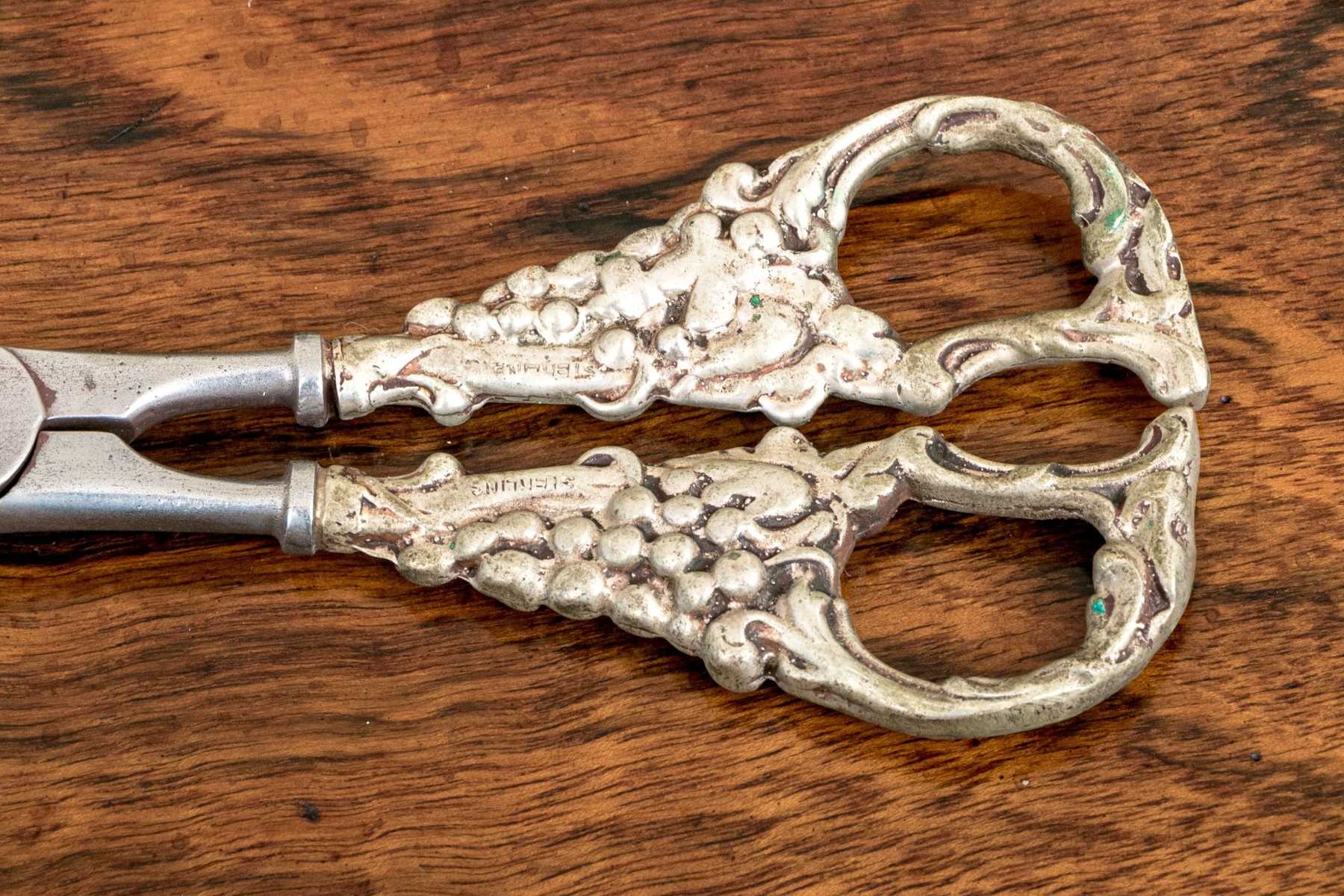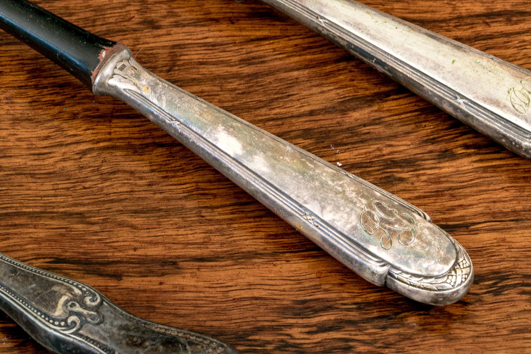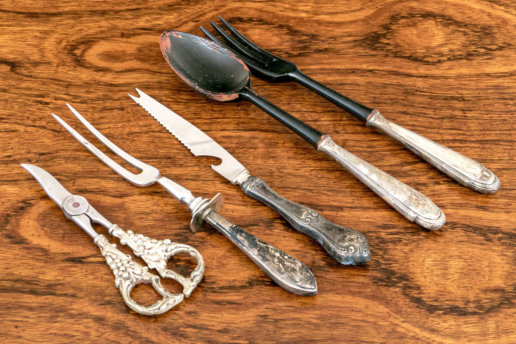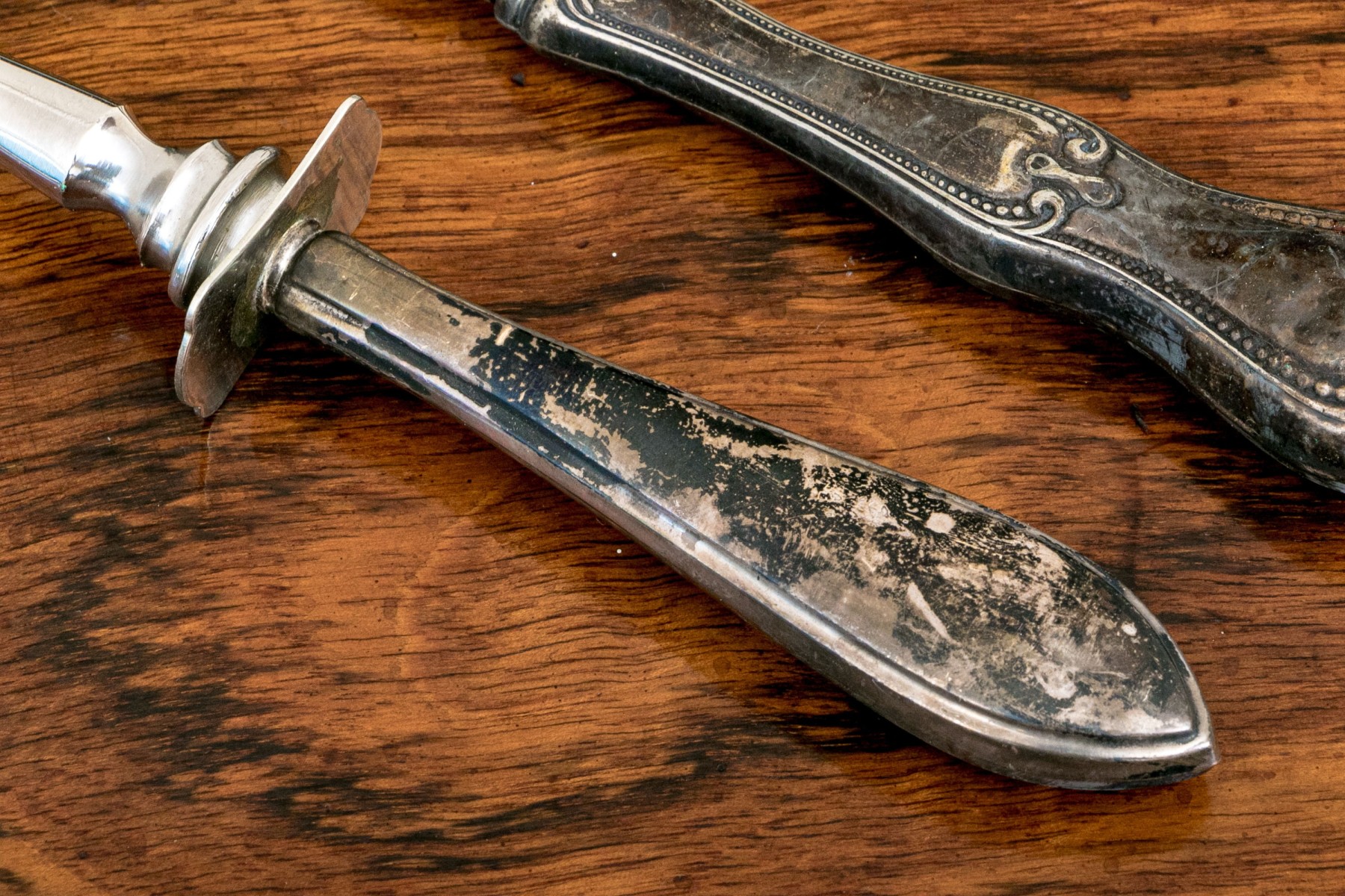 Heavily tarnished. The serrated blade is coming loose of its handle. Additionally there is wear to the ebonized finish on the salad servers. See lot images.