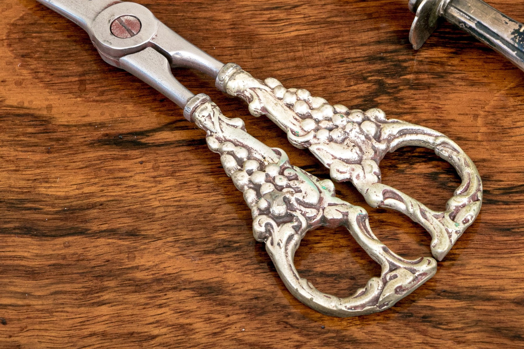 - a slice with two pronged end, serated blade with integrated bottle opener with silver plated handle