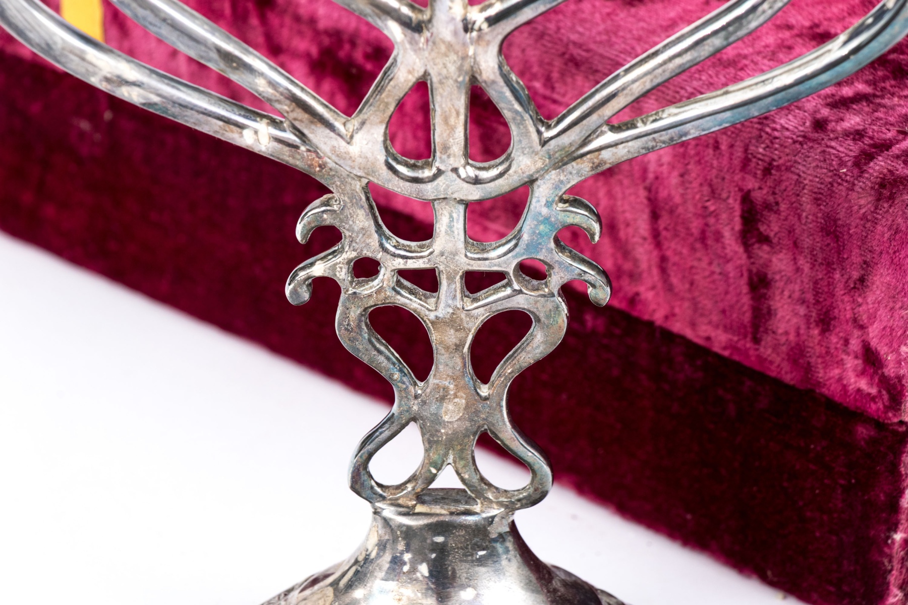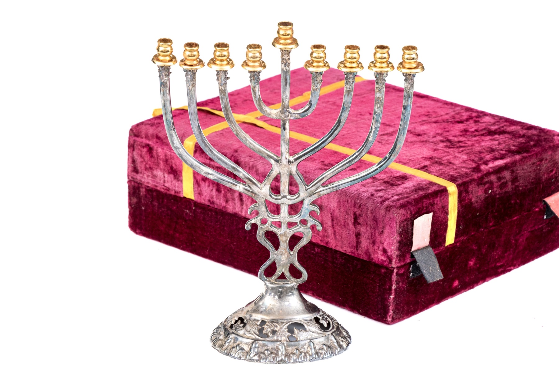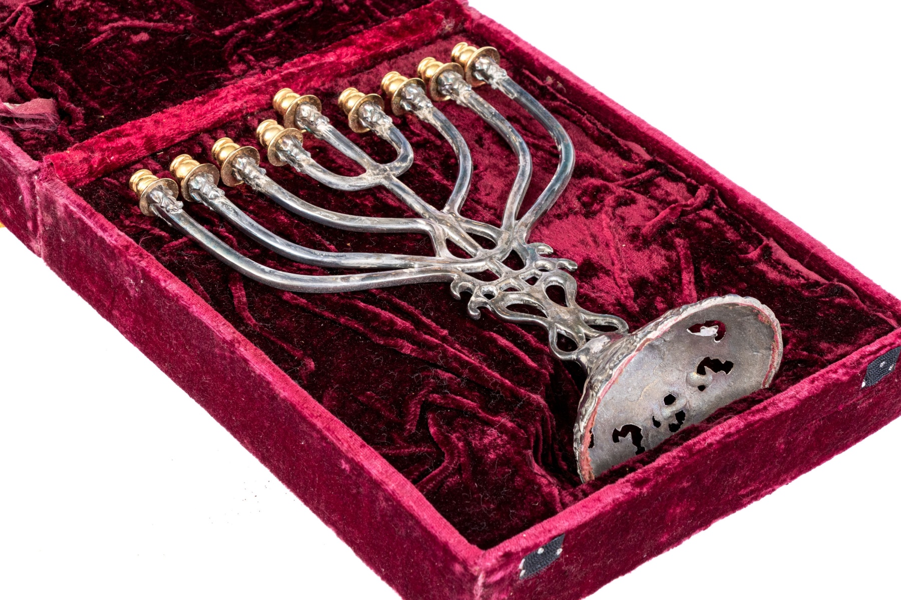 A beautiful silver plated menorah with brass or gilt sconces over curving arms meeting at an openwork column supported by a foliate pierced circular foot. Includes a red velvet case.
