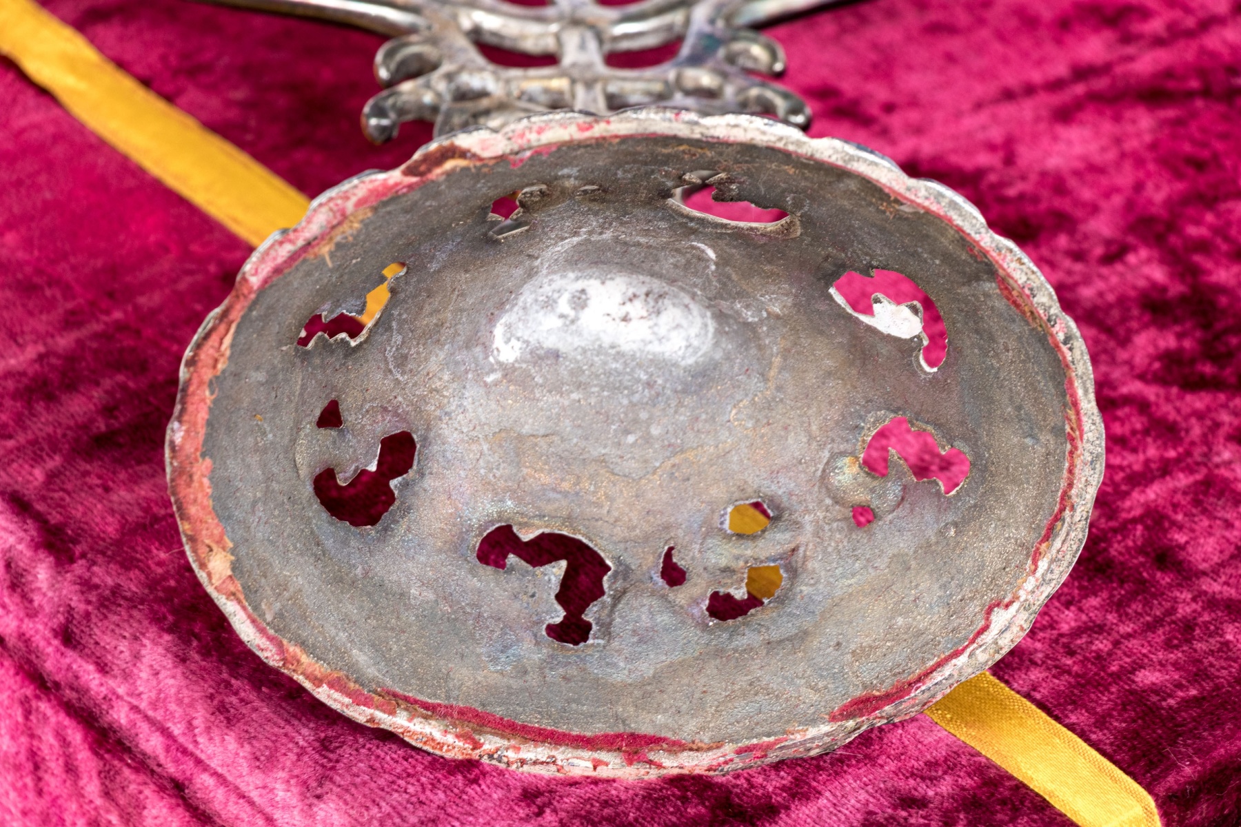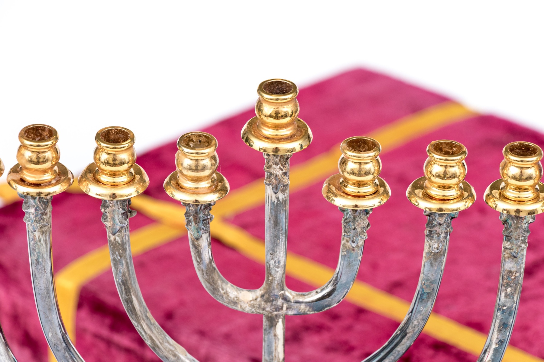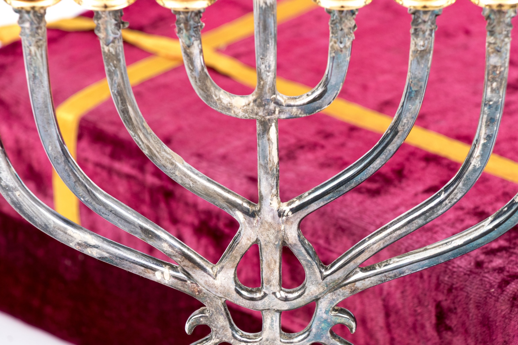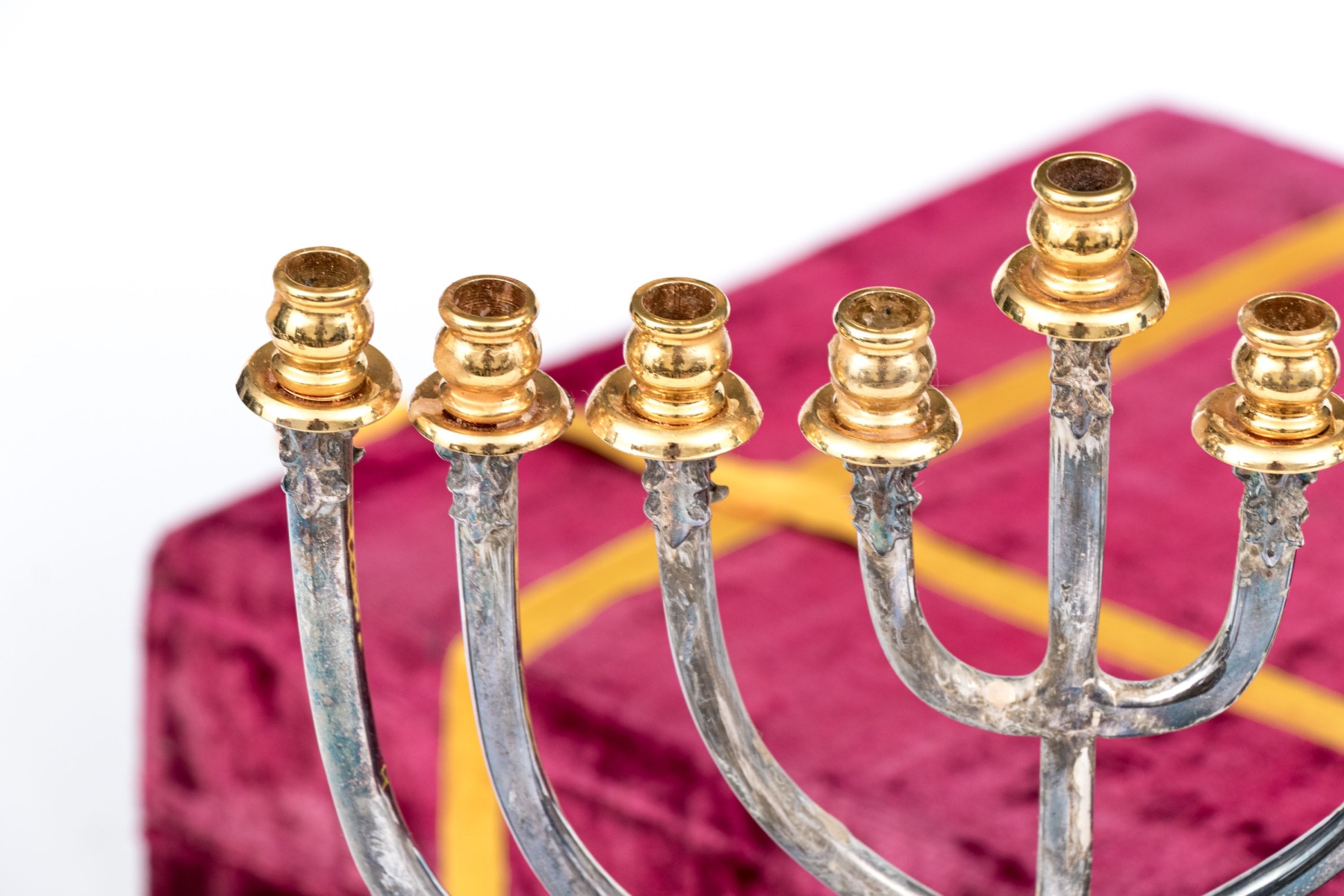 A beautiful silver plated menorah with brass or gilt sconces over curving arms meeting at an openwork column supported by a foliate pierced circular foot. Includes a red velvet case.