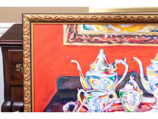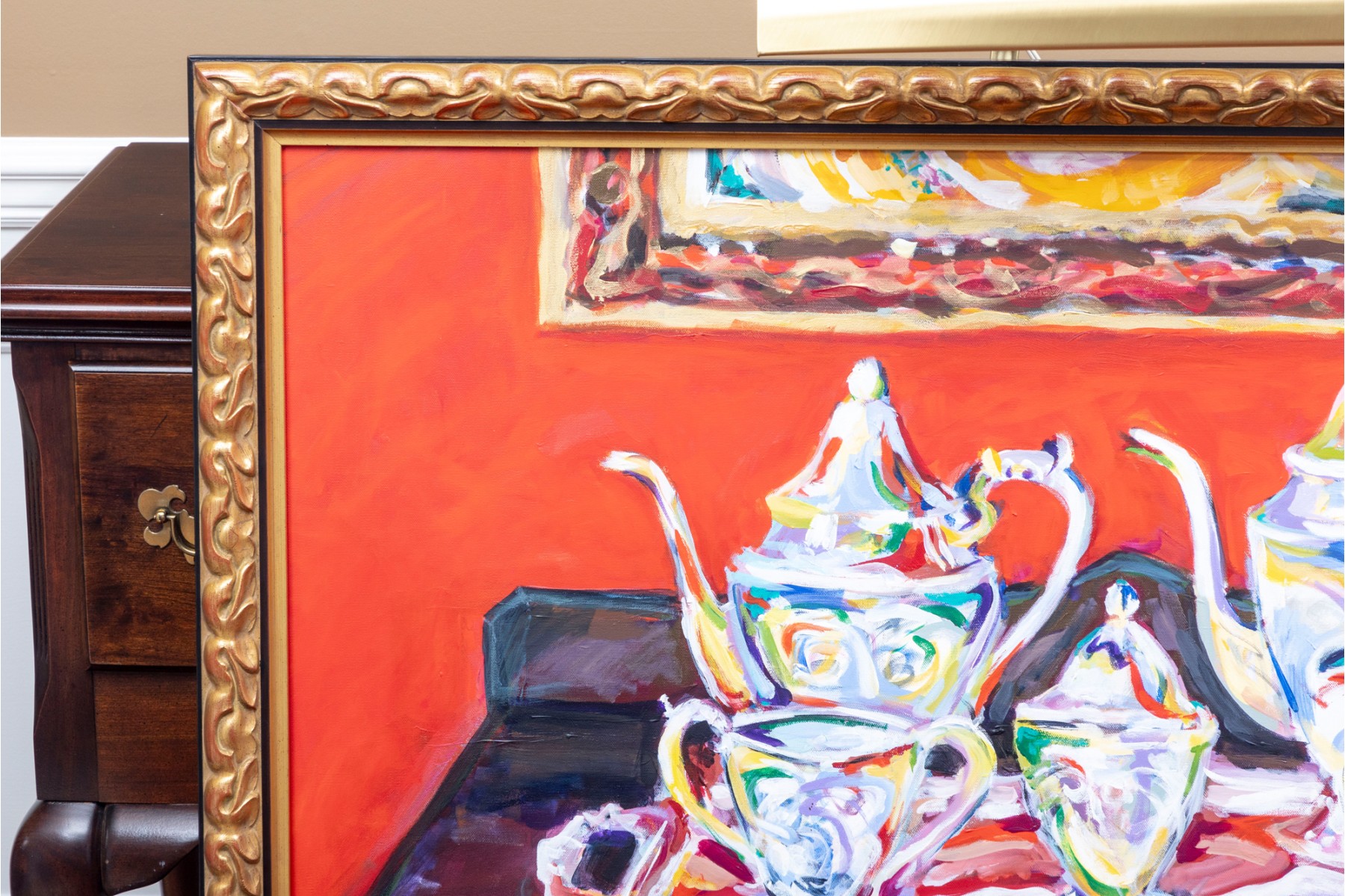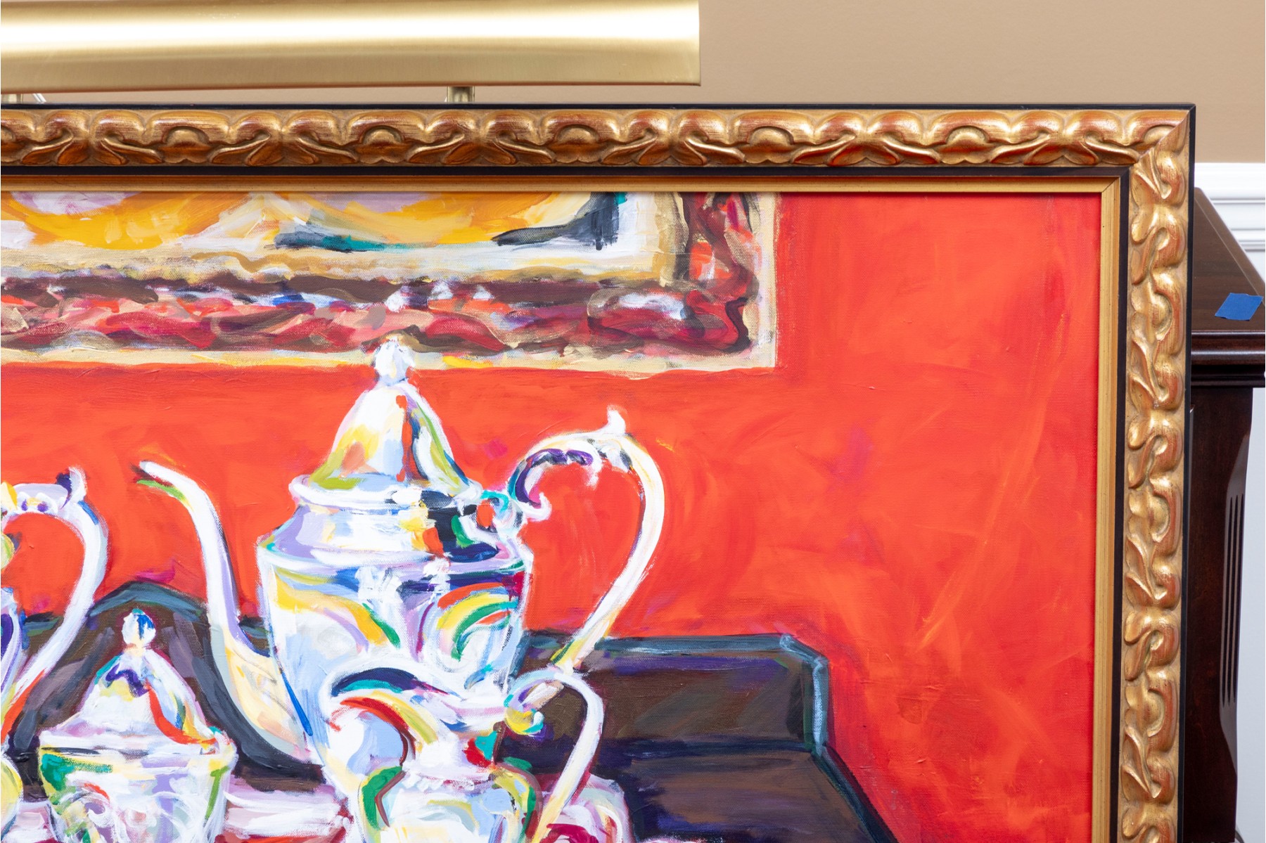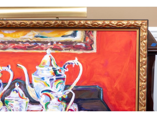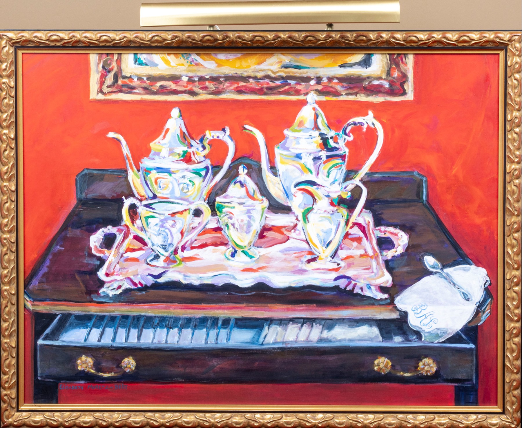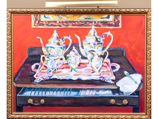 An original oil on canvas painting, commissioned by Lee Armstrong -- "Silver Tea Service On Chest" by Elizabeth Moretz-Britt. The painting is presented in an ornate gilt-wood frame displayed openly with an overhead light fixture in brass.