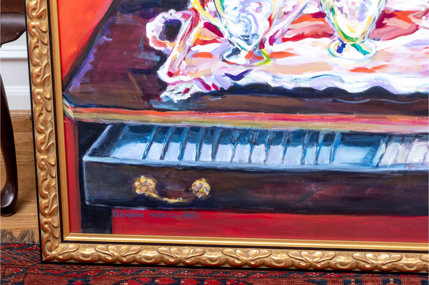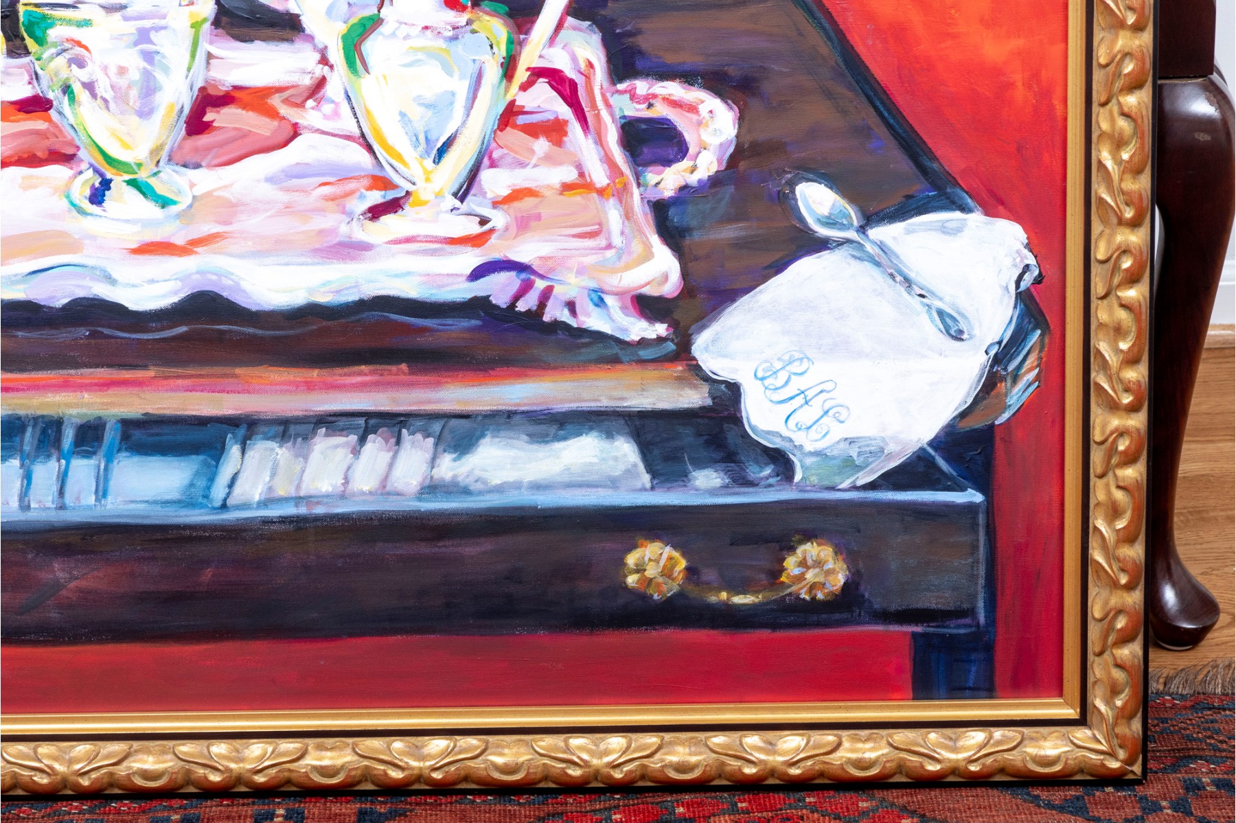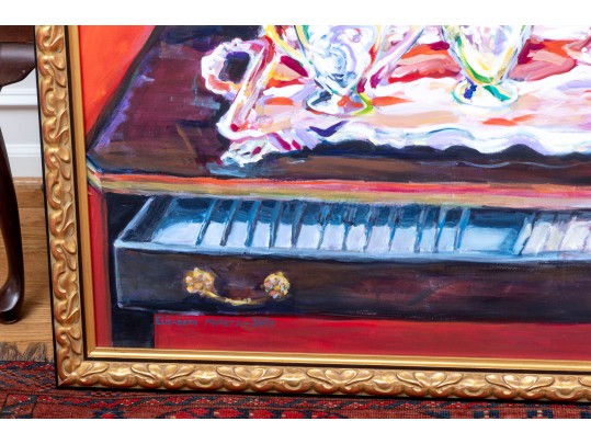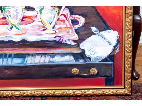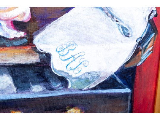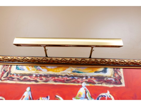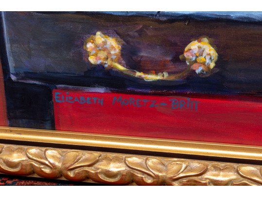 An original oil on canvas painting, commissioned by Lee Armstrong -- "Silver Tea Service On Chest" by Elizabeth Moretz-Britt. The painting is presented in an ornate gilt-wood frame displayed openly with an overhead light fixture in brass.
