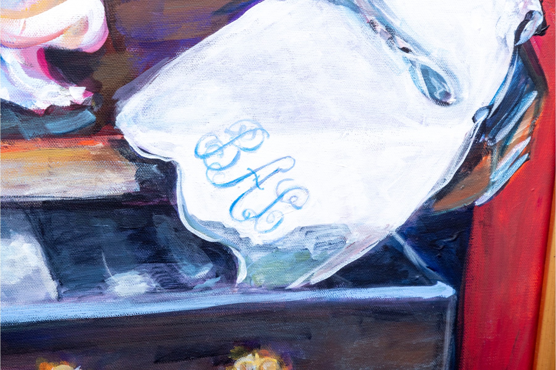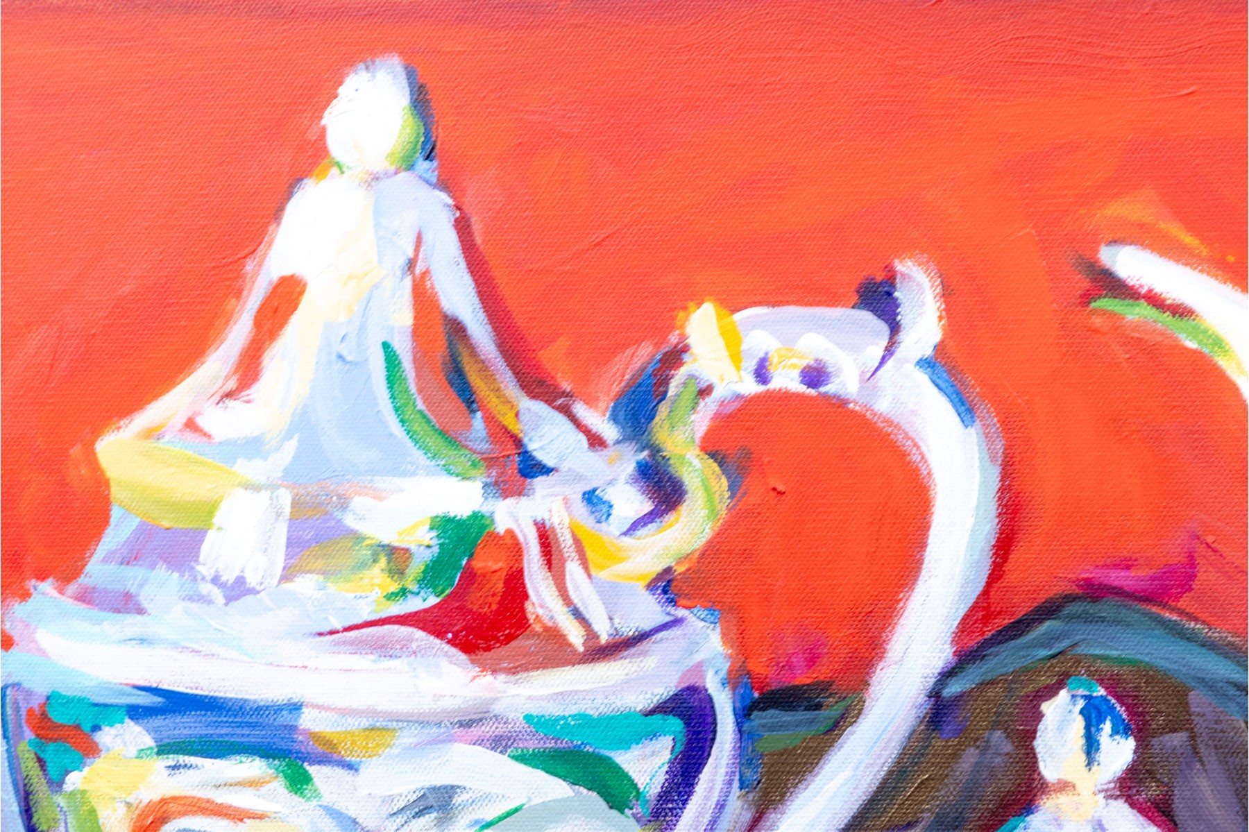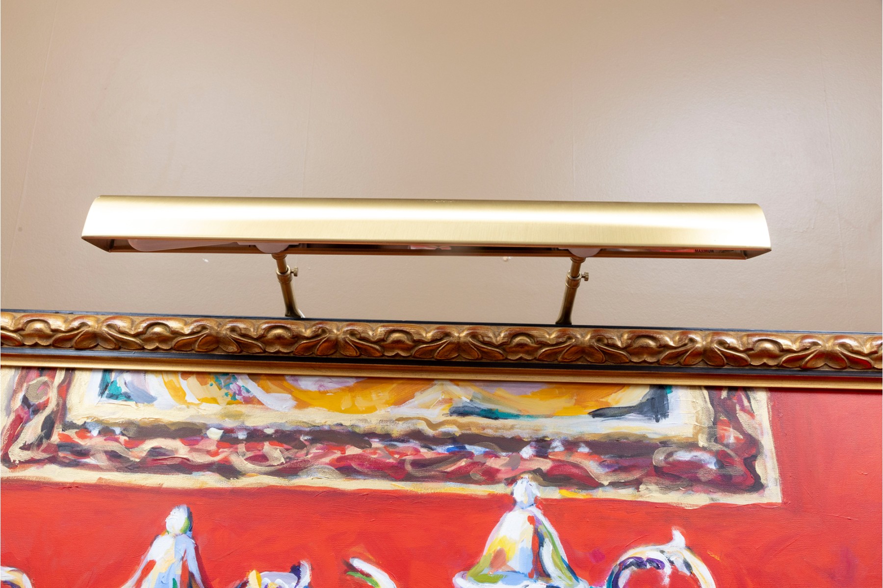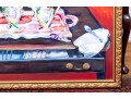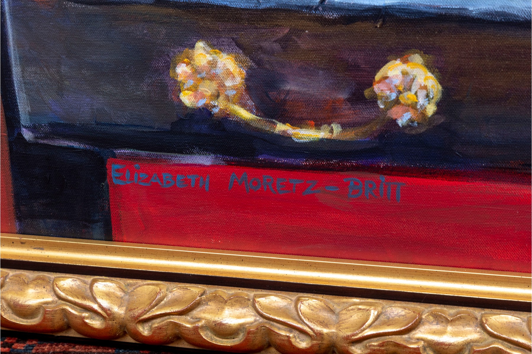 An original oil on canvas painting, commissioned by Lee Armstrong -- "Silver Tea Service On Chest" by Elizabeth Moretz-Britt. The painting is presented in an ornate gilt-wood frame displayed openly with an overhead light fixture in brass.