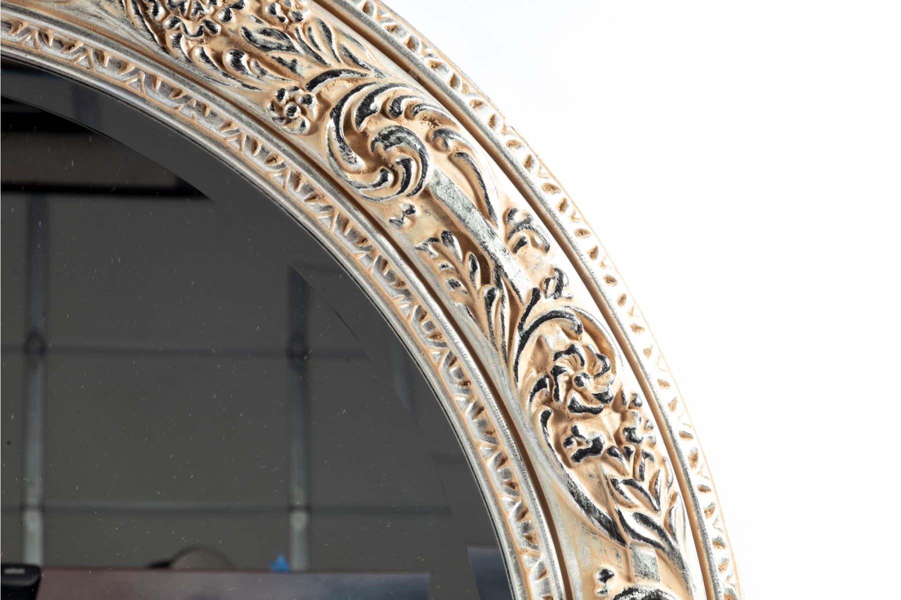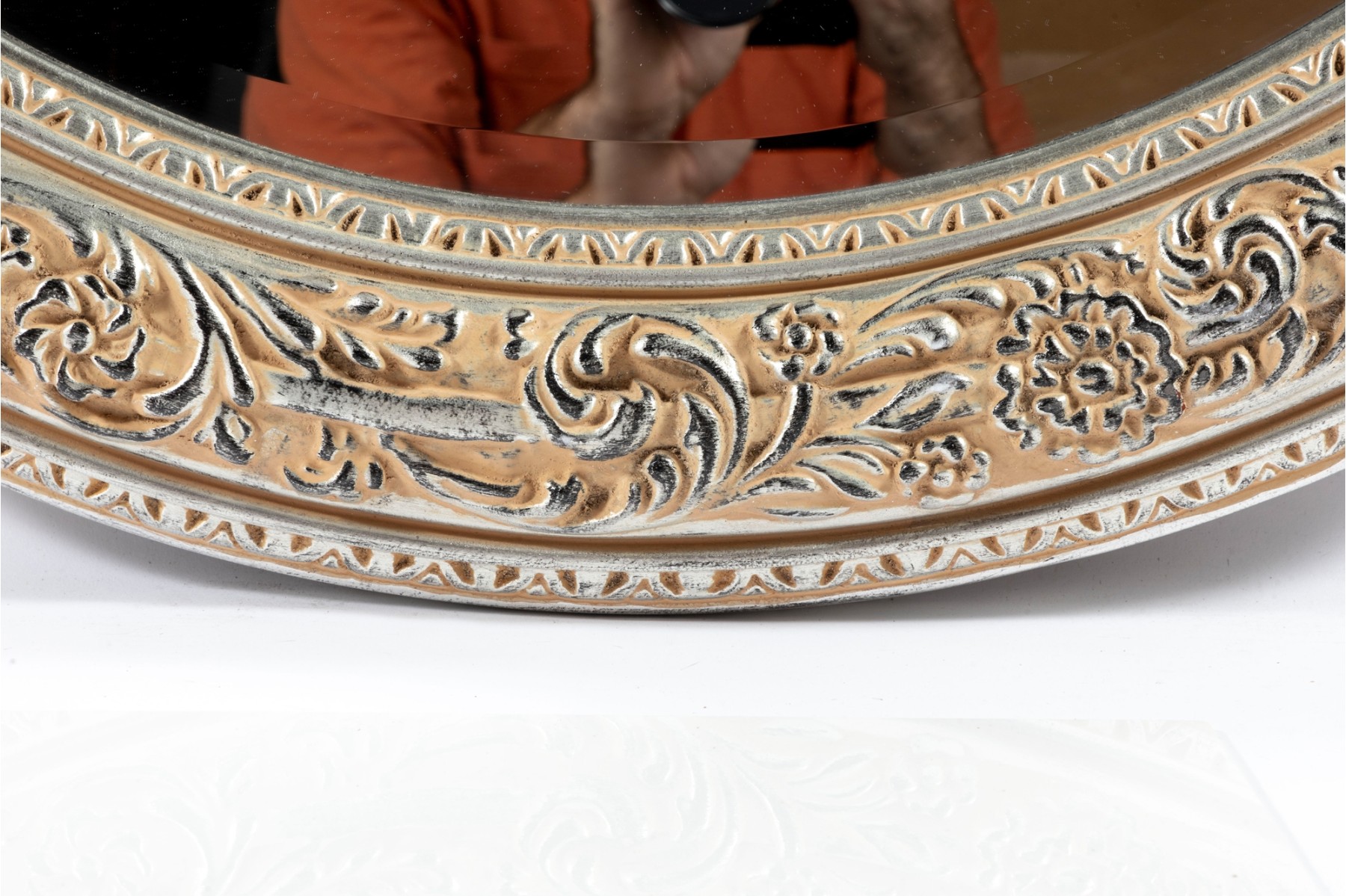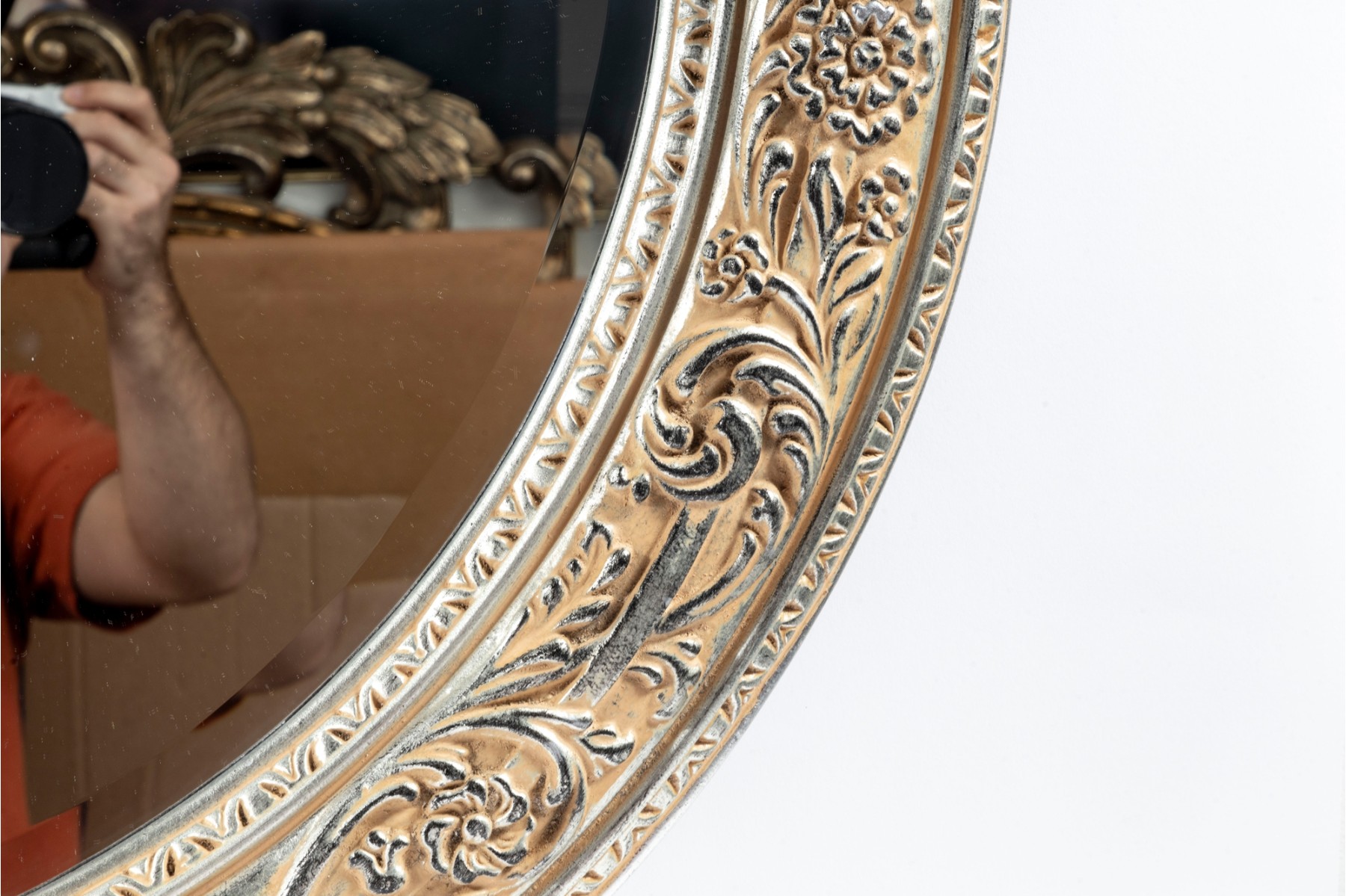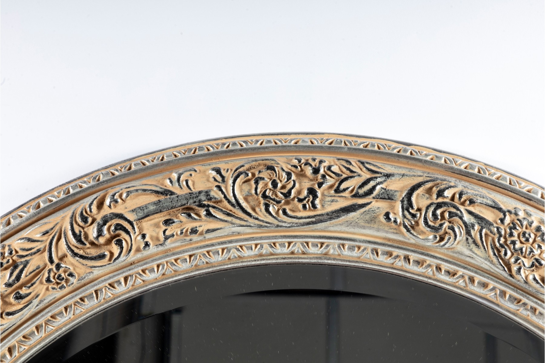 A contemporary beveled glass wall mirror with a round, carved wood frame outlined in floral motifs and light distressing.