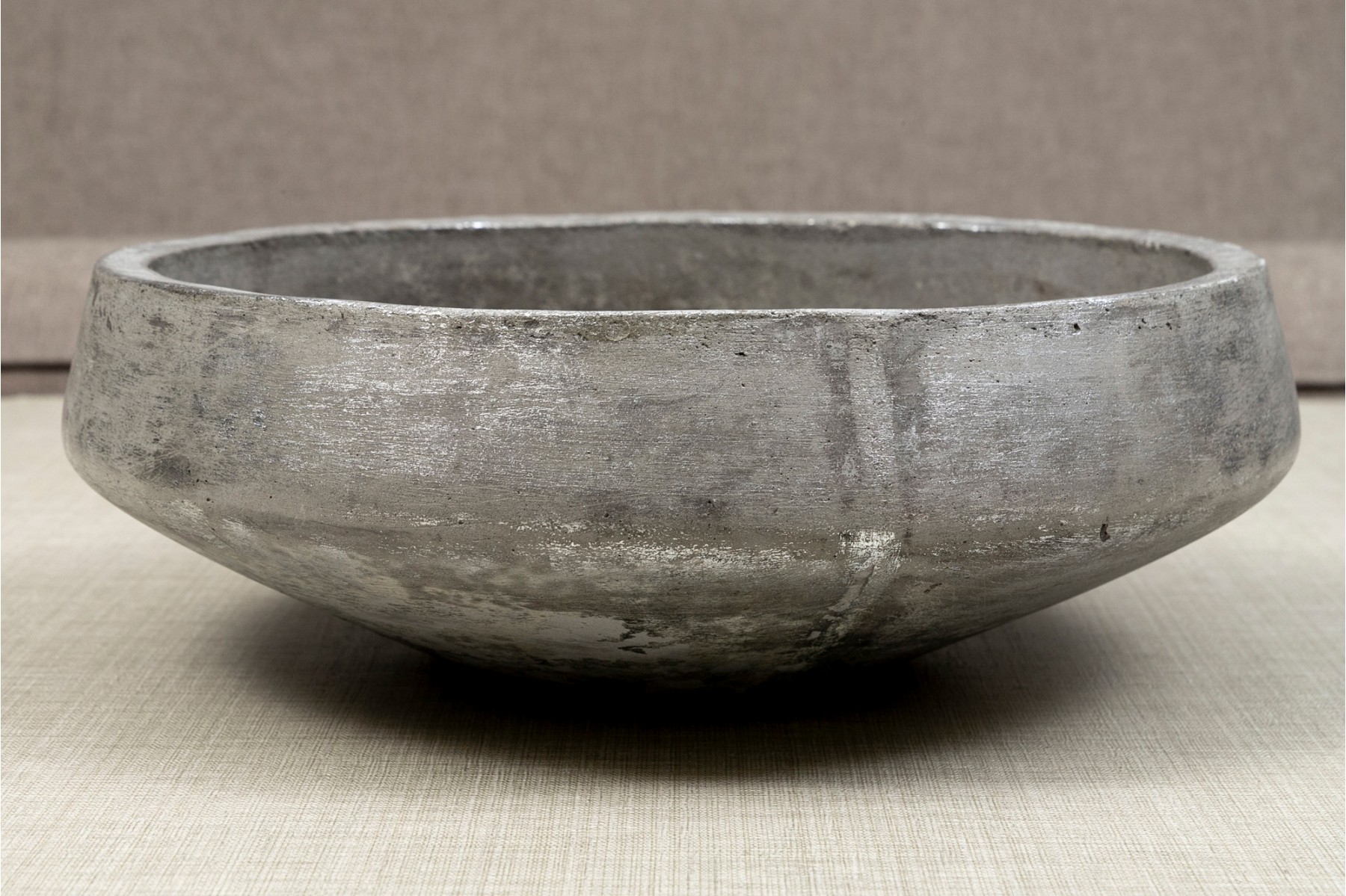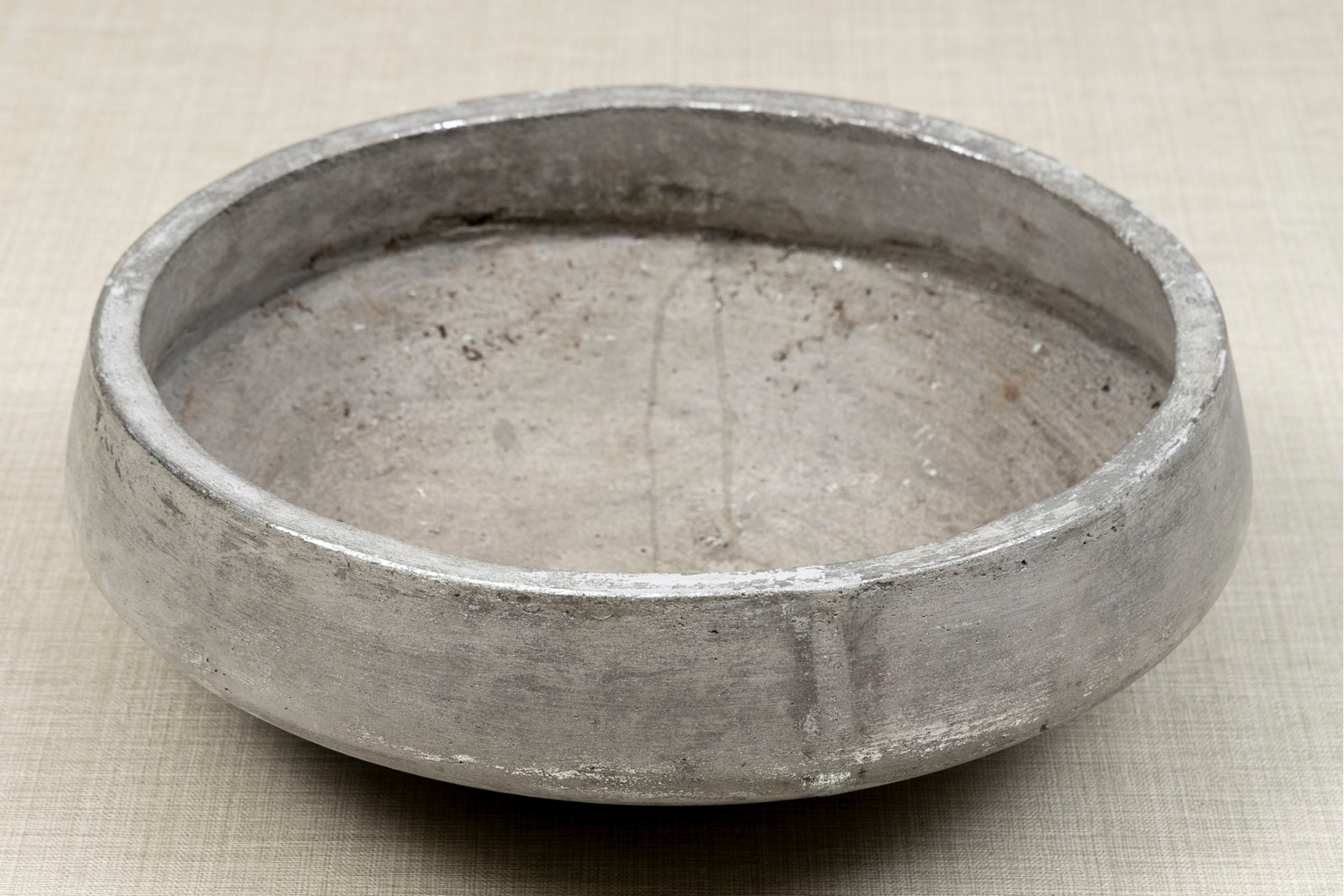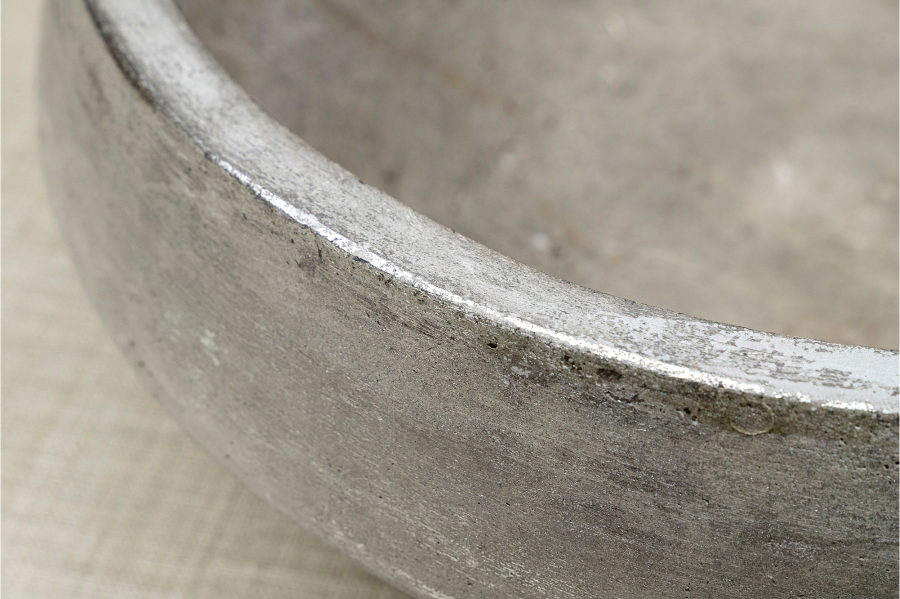 The shallow bowl with a wide rim band and painted overall in a silvery mottled finish.
