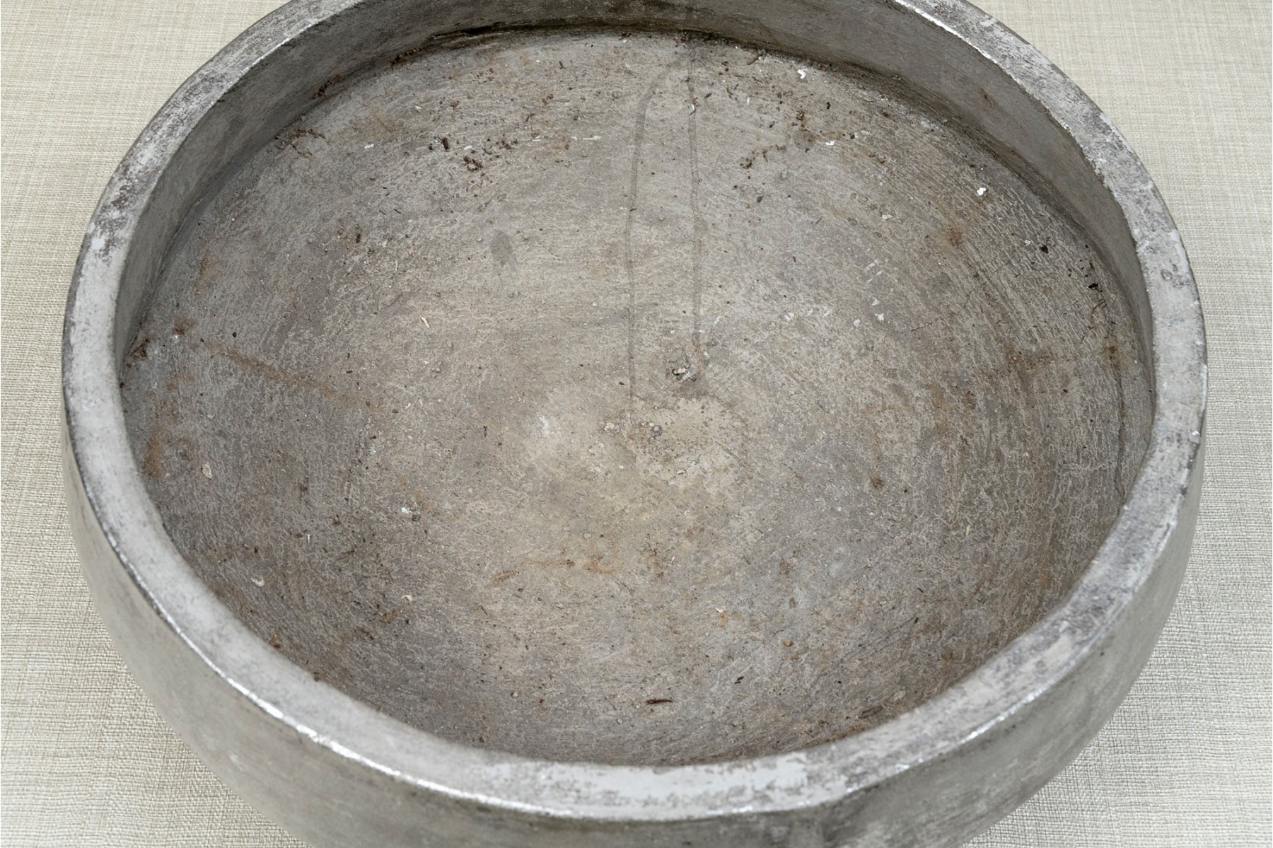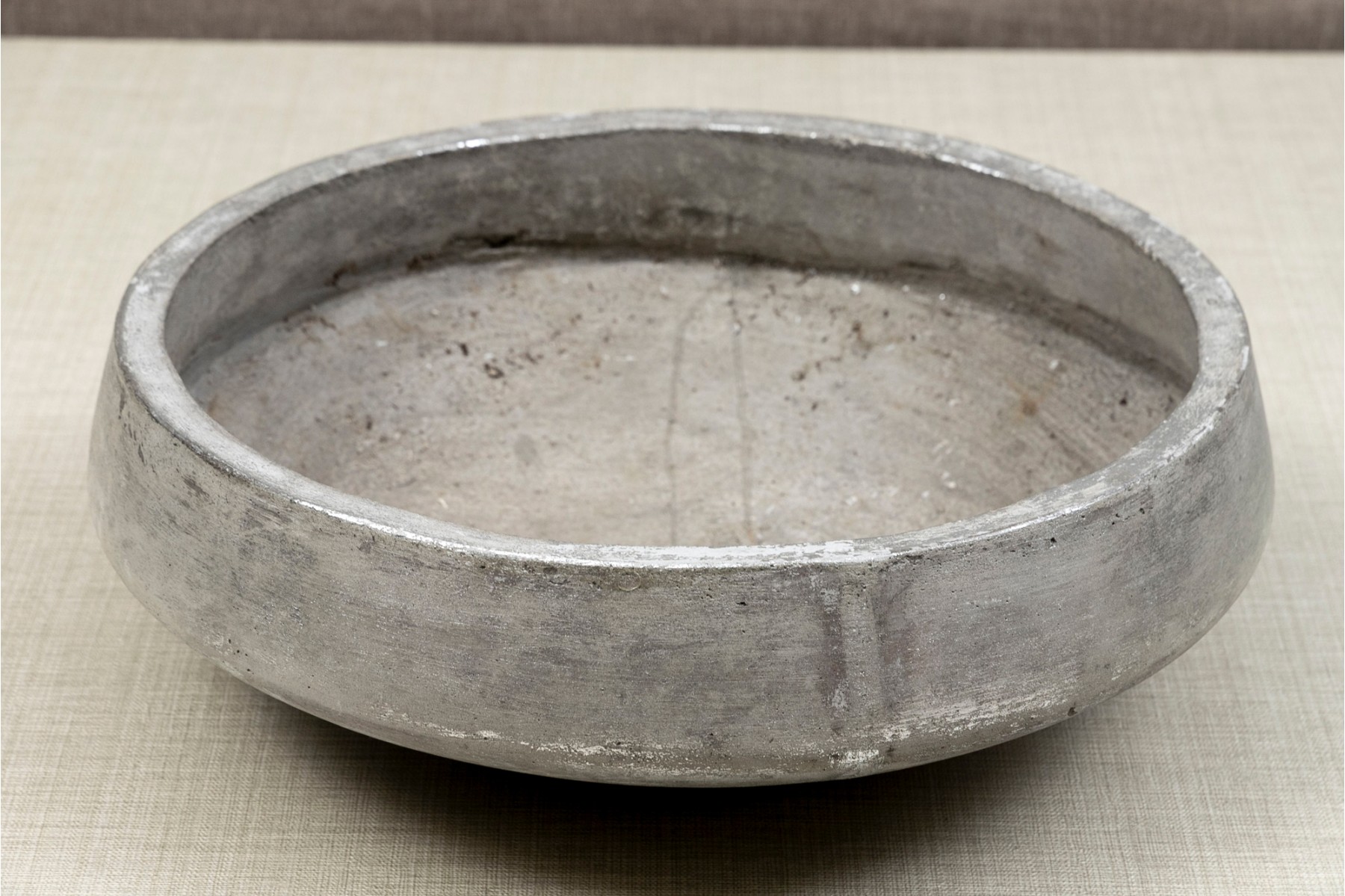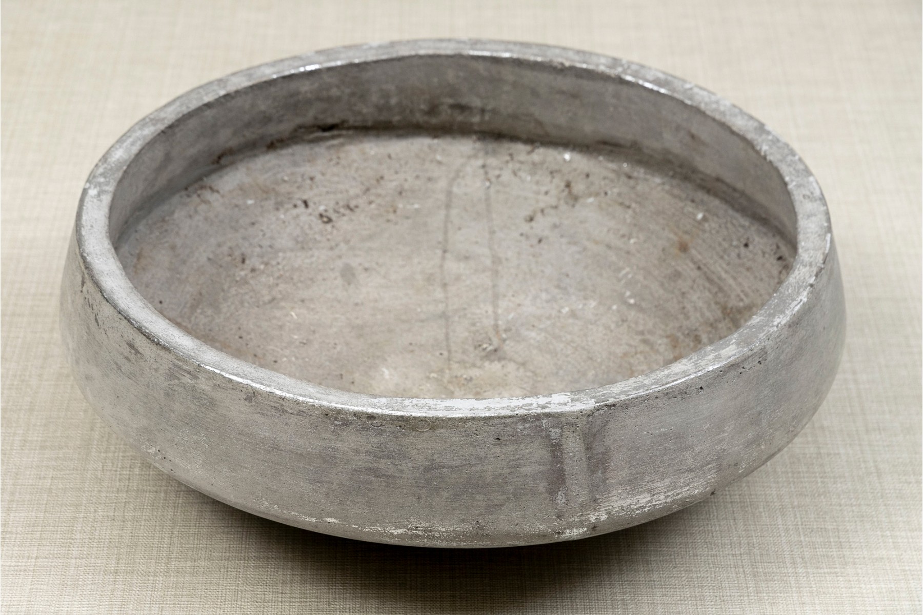 The shallow bowl with a wide rim band and painted overall in a silvery mottled finish.