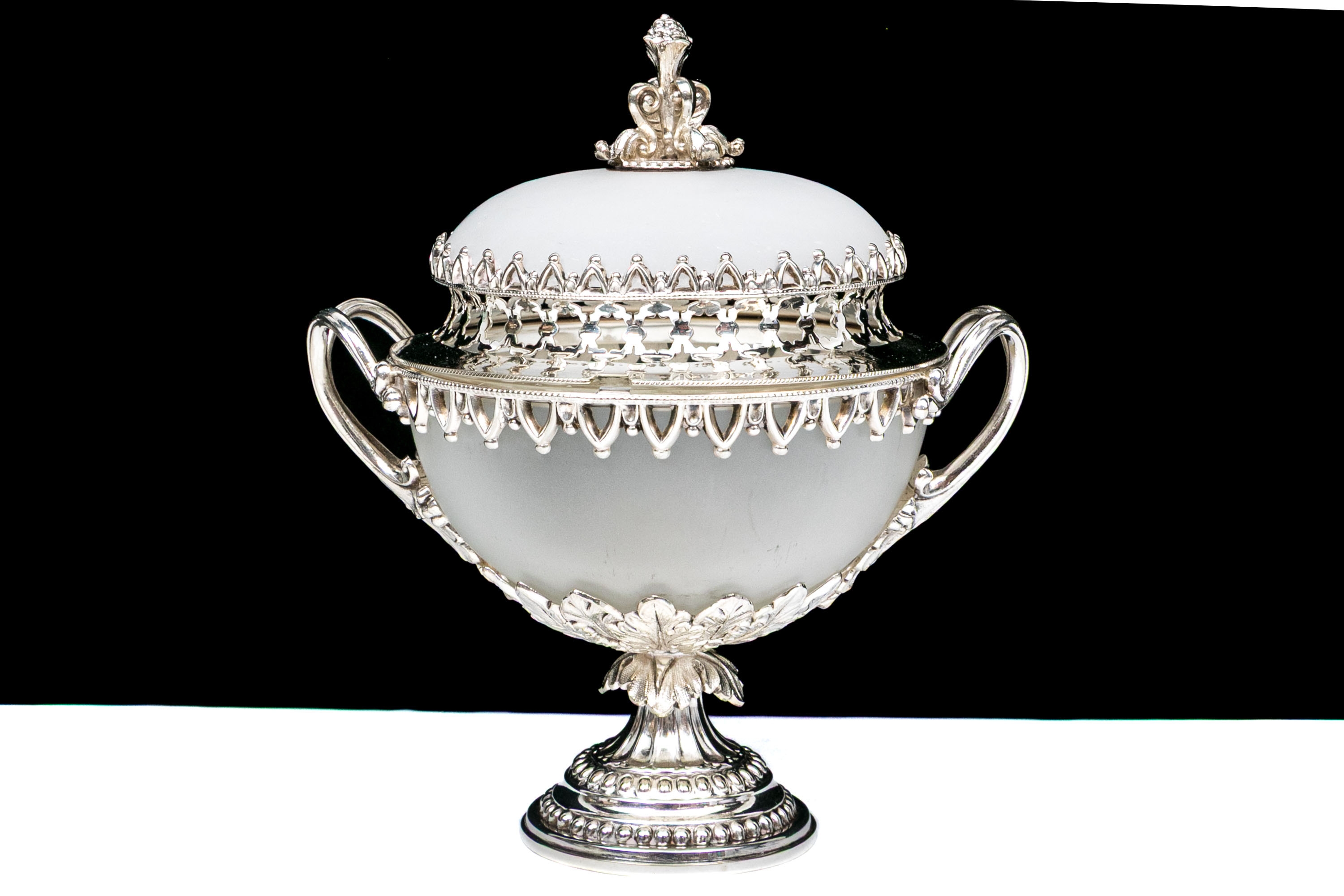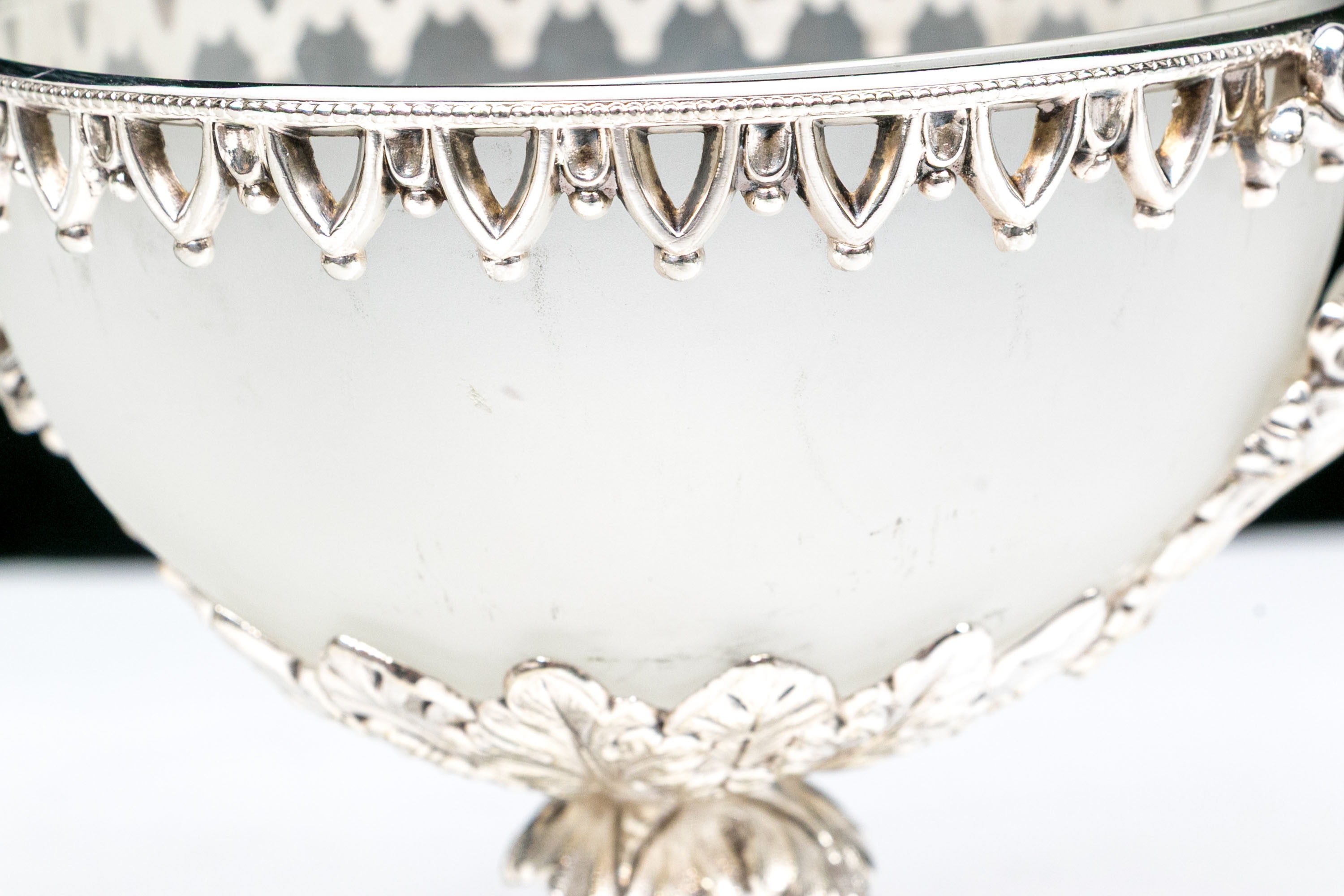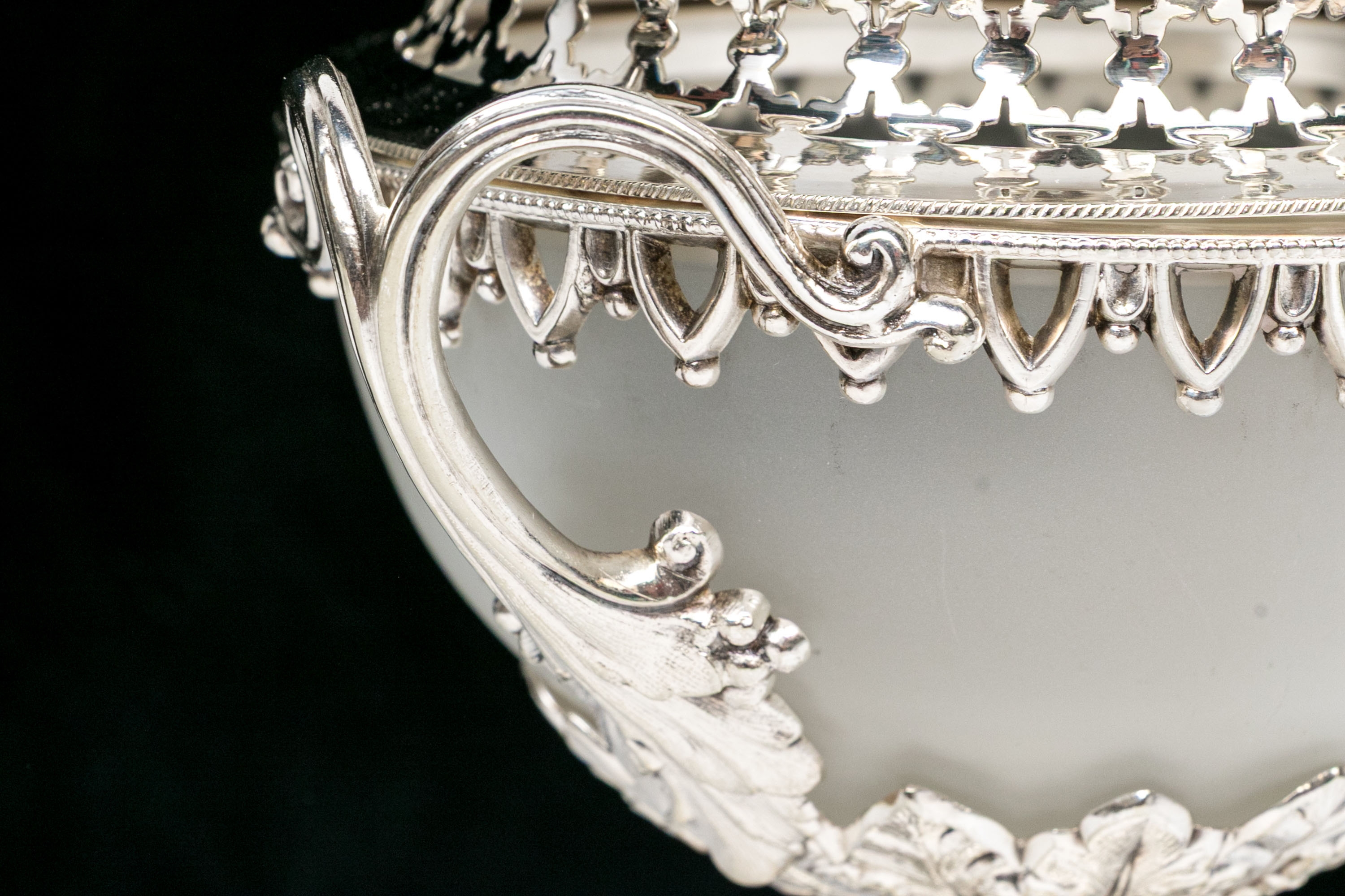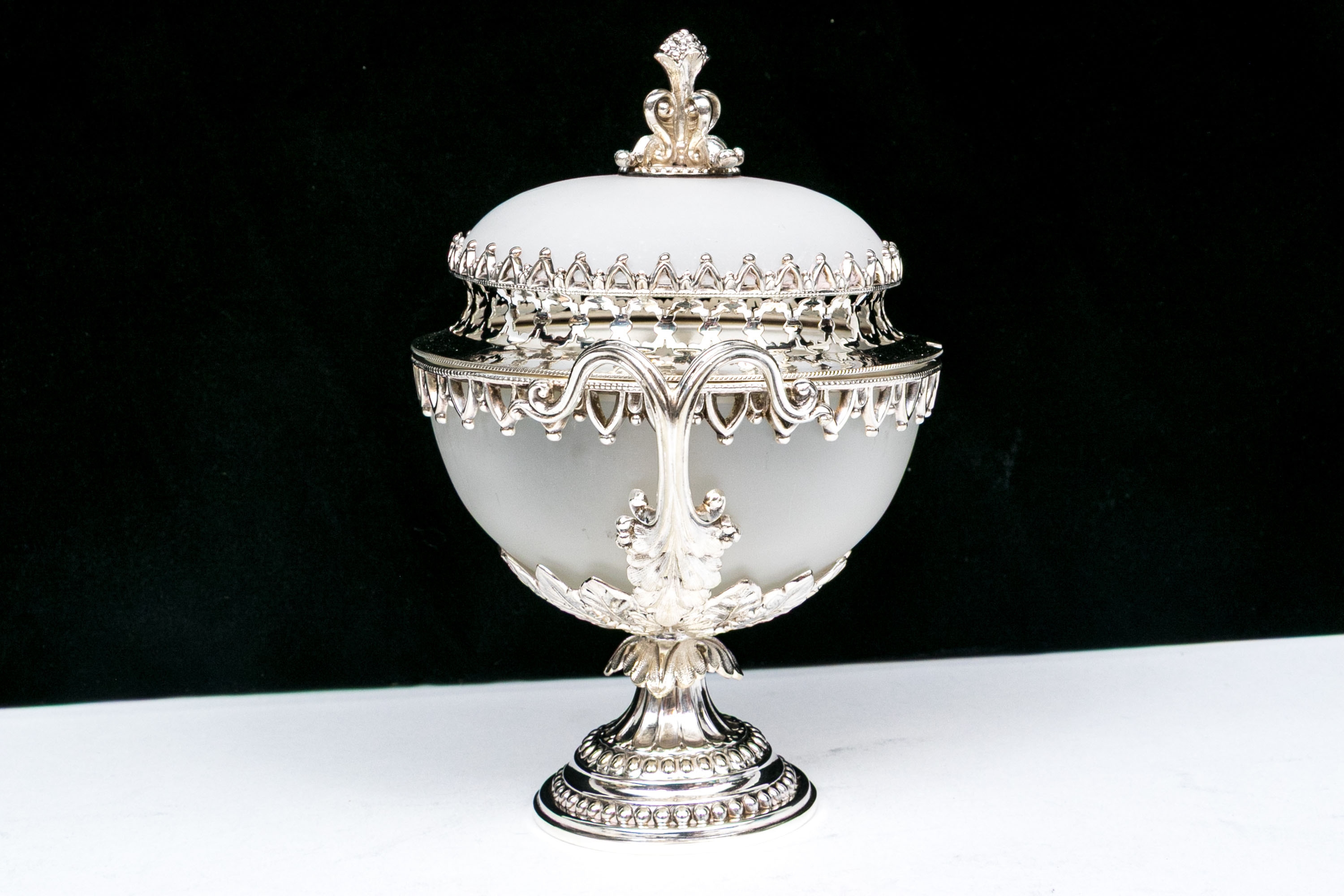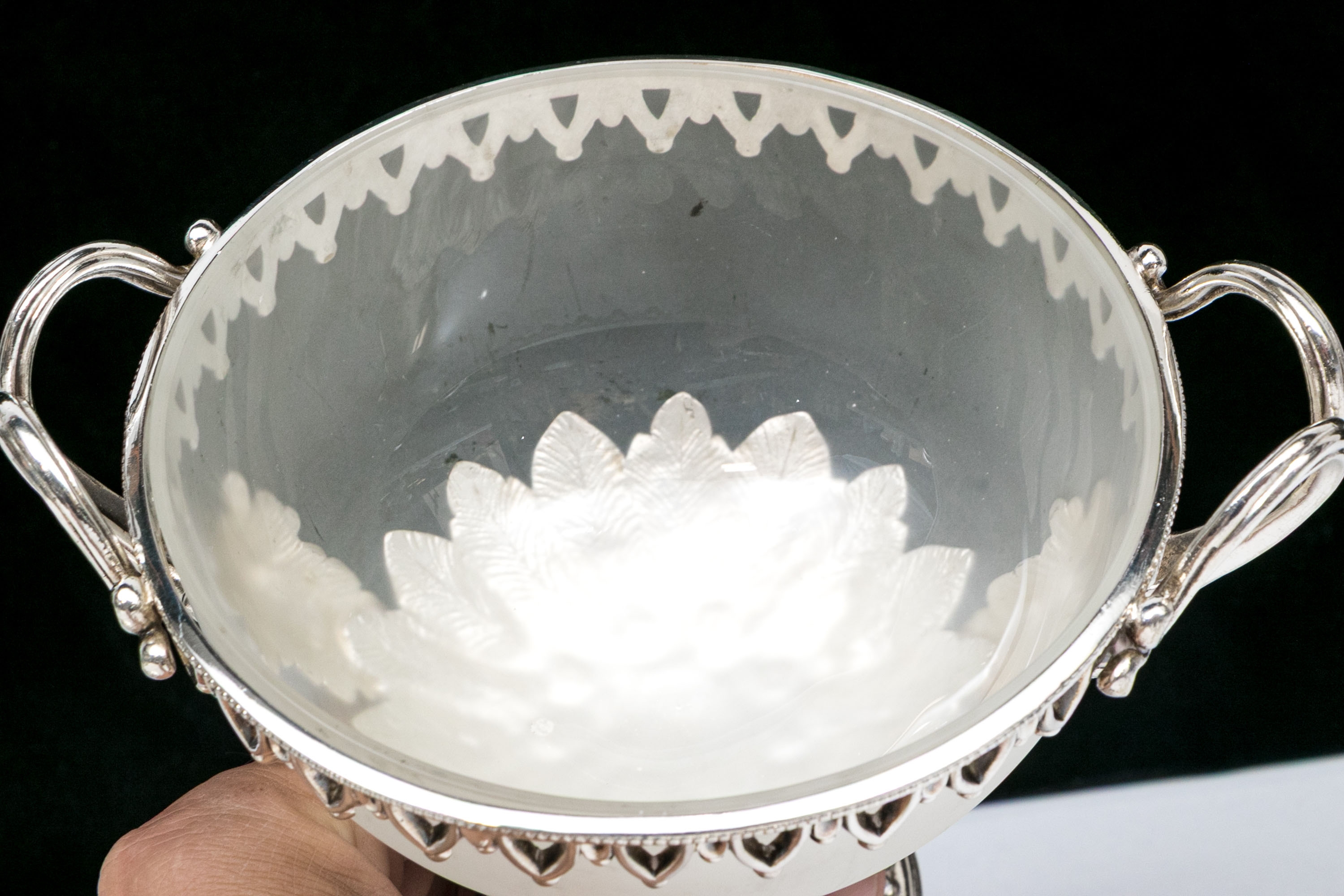 A fine footed silverplate twin leaf and berry handled bowl and acanthus leafy base. The lid with attached frosted glass insert and scrolled finial and an opening for a utensil. Along with a frosted glass removable bowl.