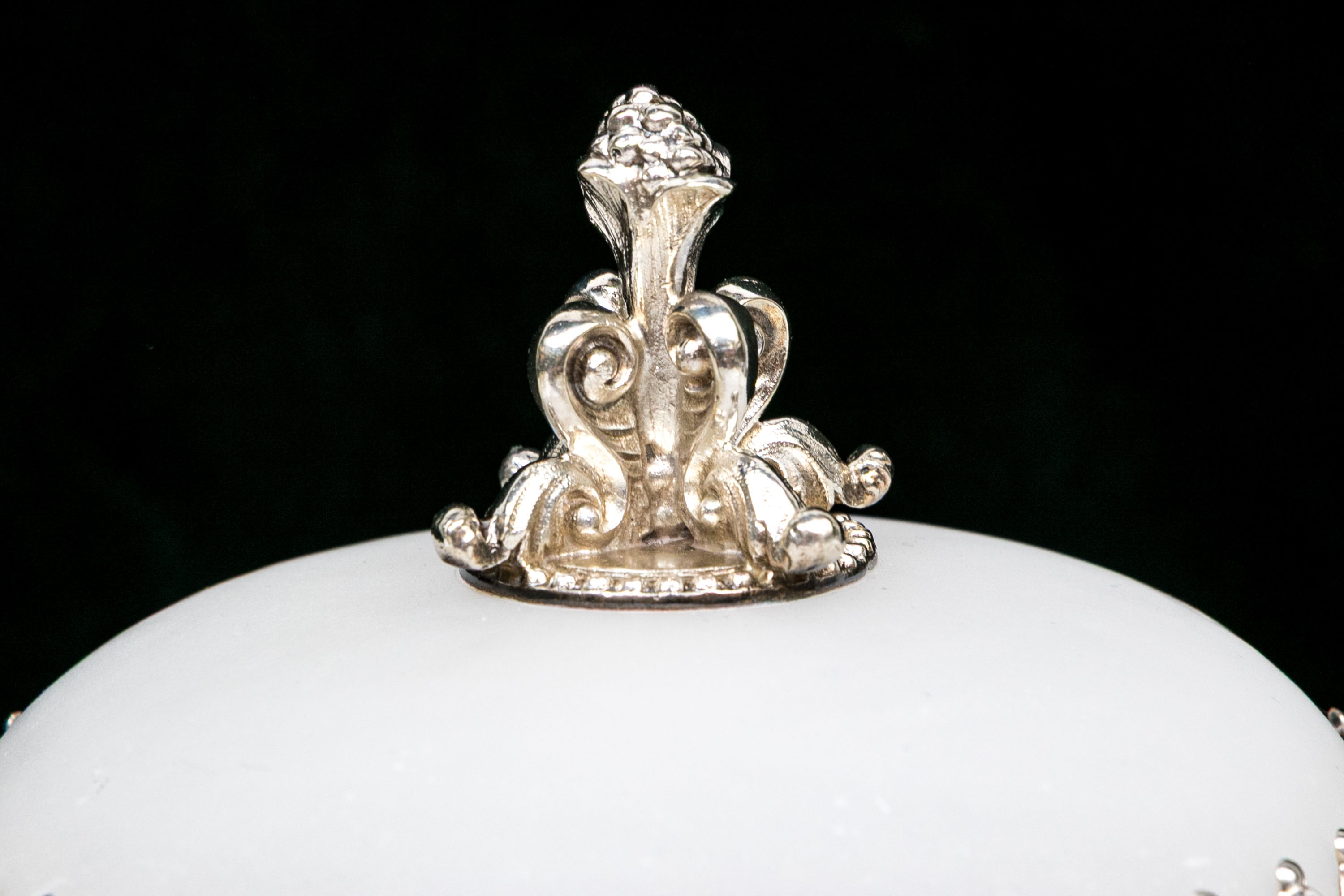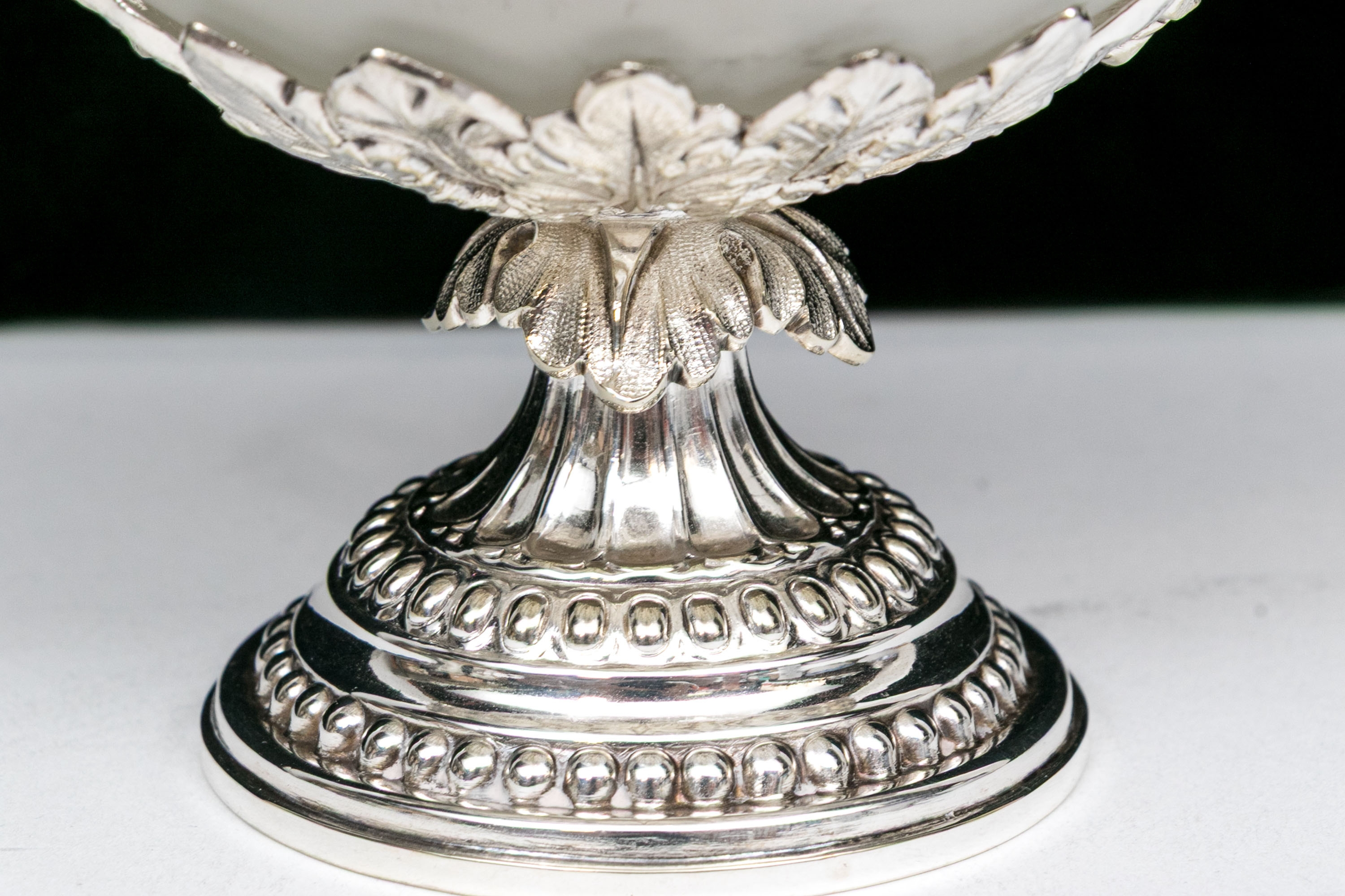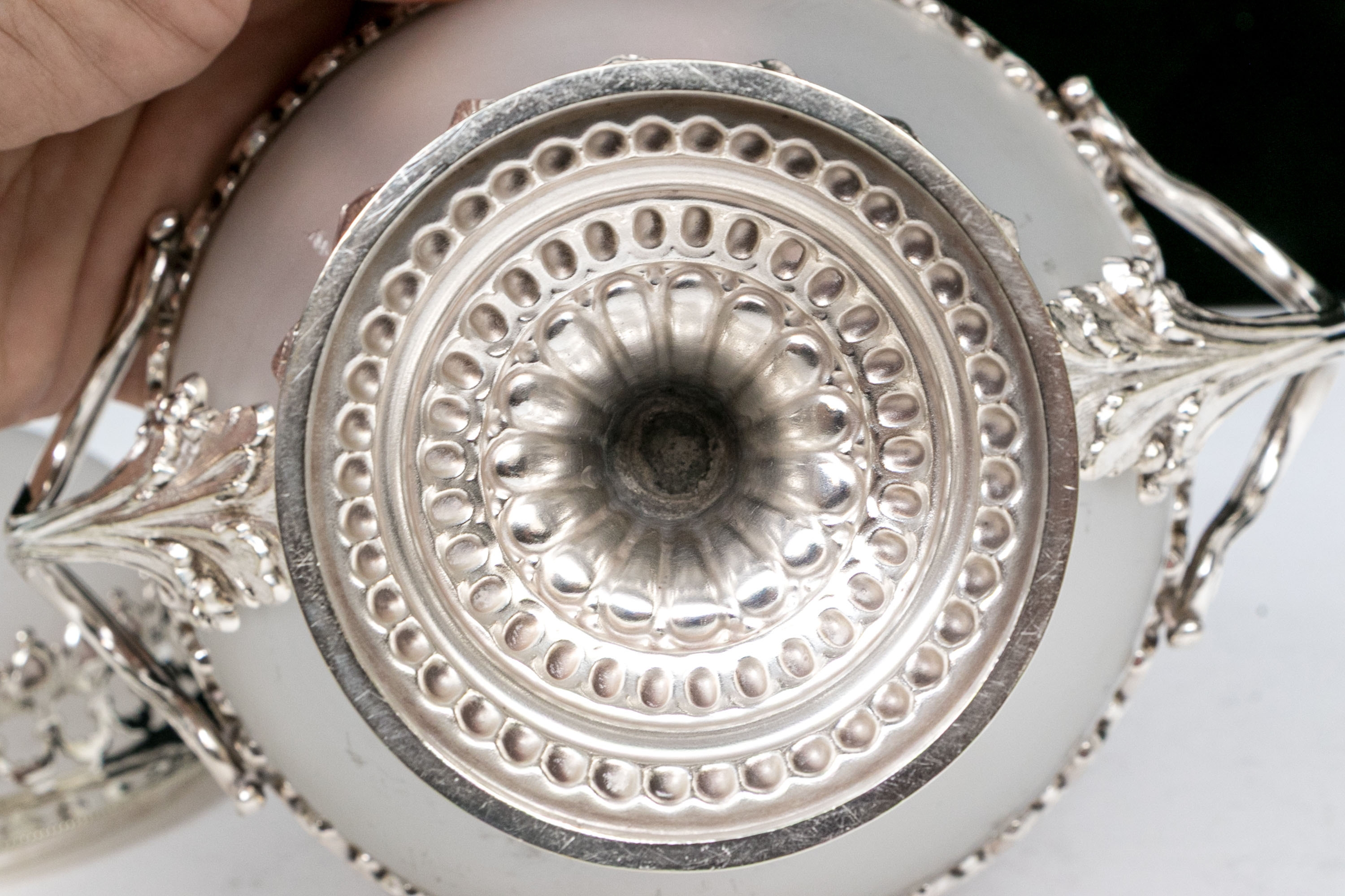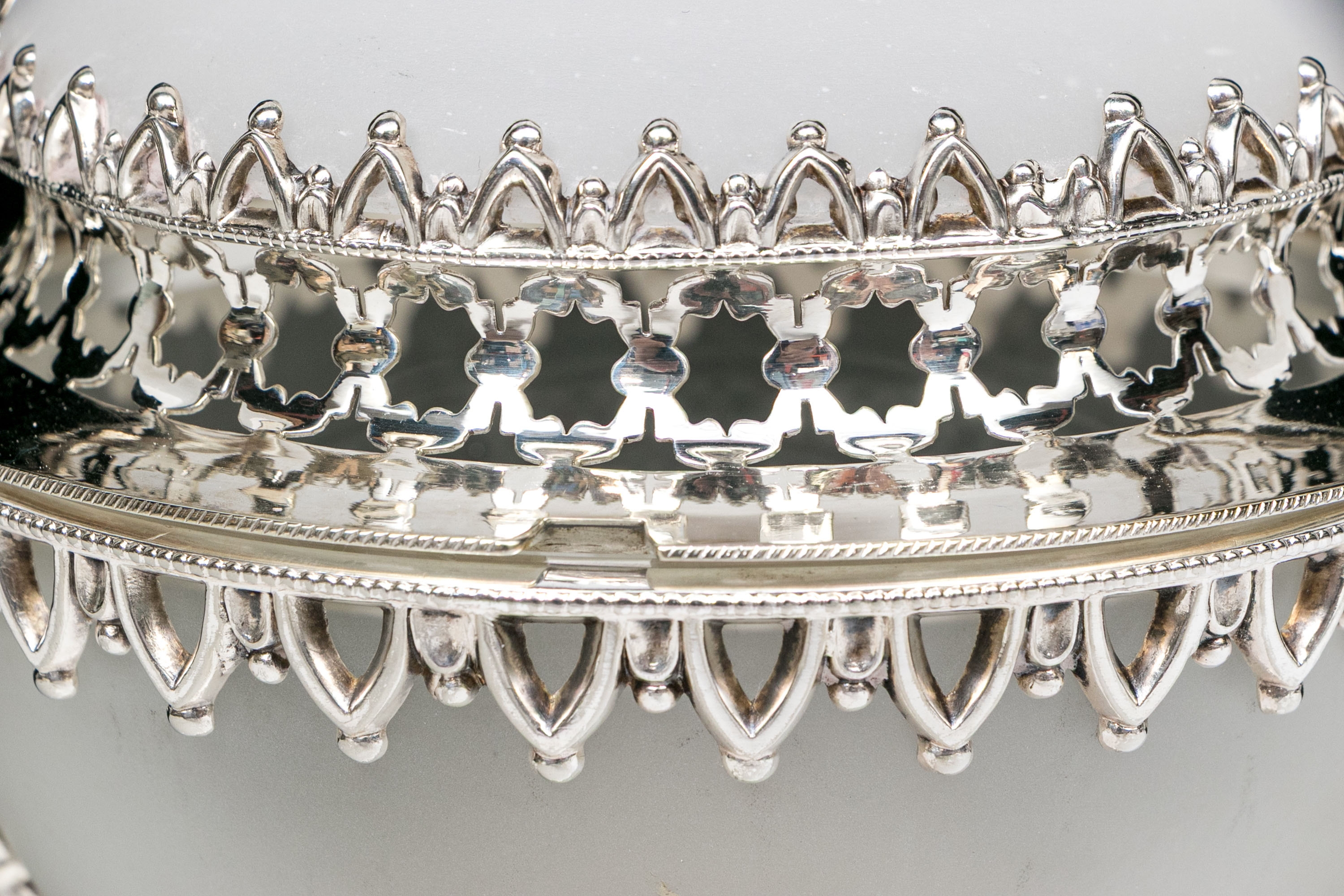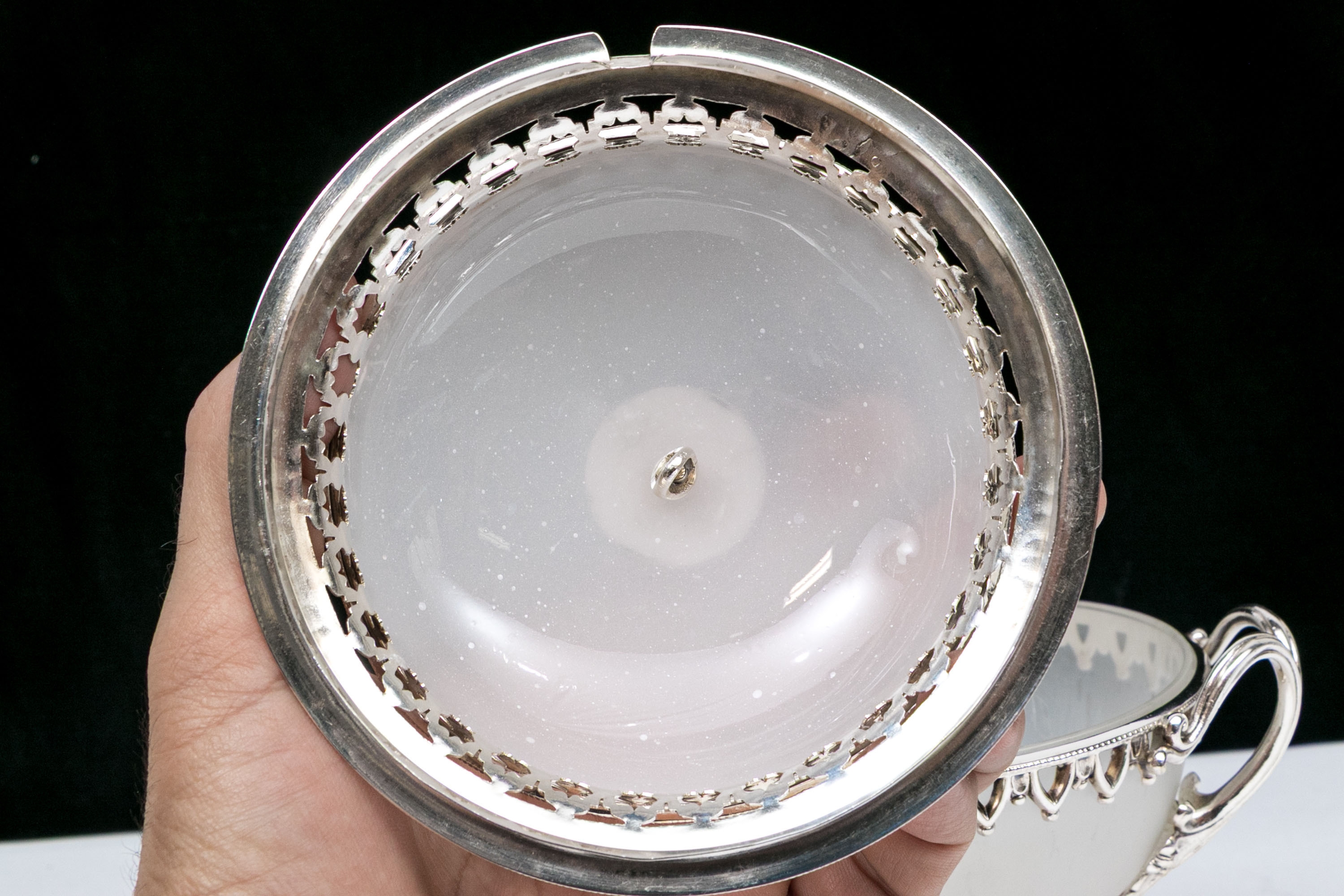 A fine footed silverplate twin leaf and berry handled bowl and acanthus leafy base. The lid with attached frosted glass insert and scrolled finial and an opening for a utensil. Along with a frosted glass removable bowl.