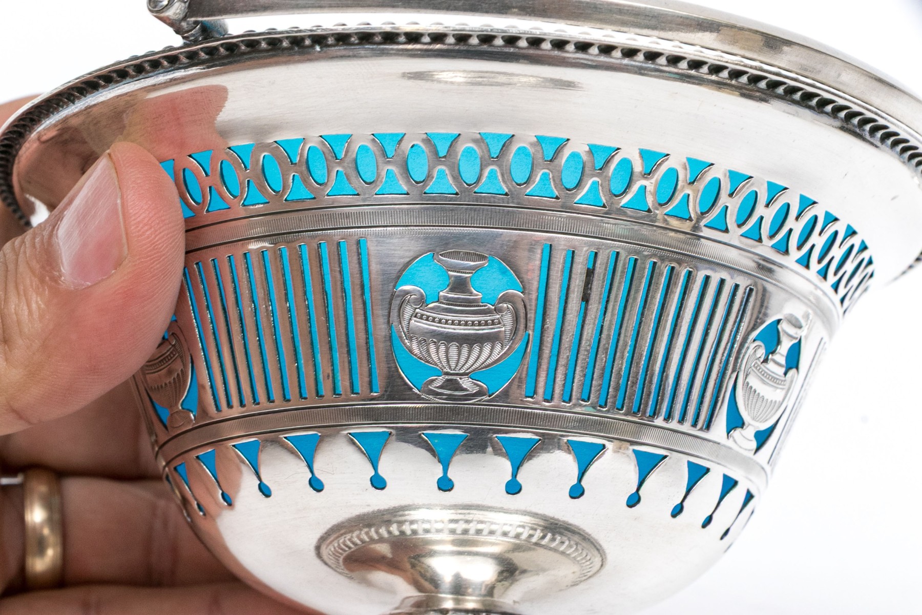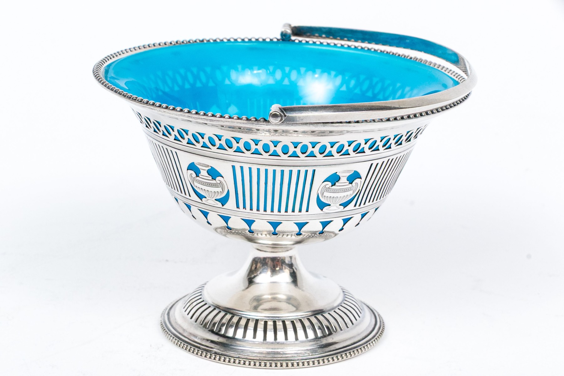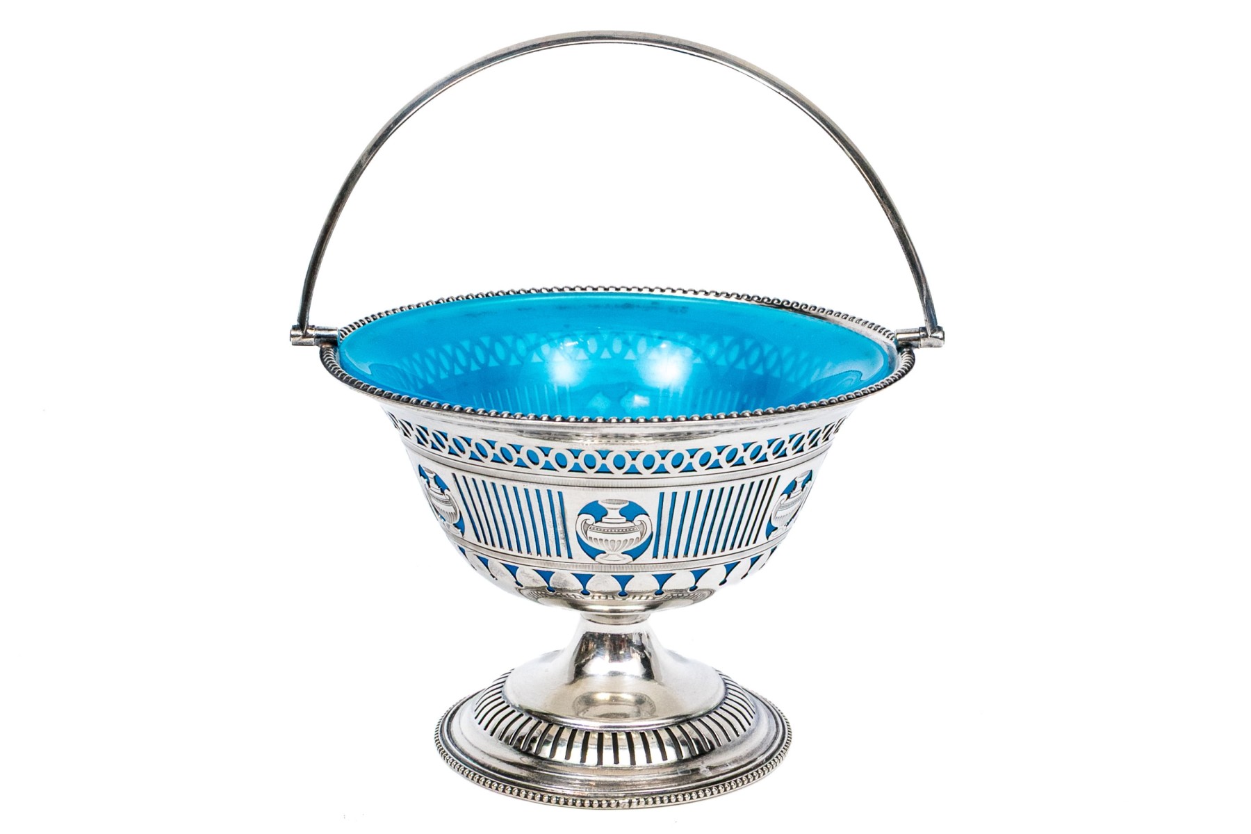 A footed silverplate basket with openwork sides with urn motifs and a swivel handle. With a removable blue opaline glass bowl.