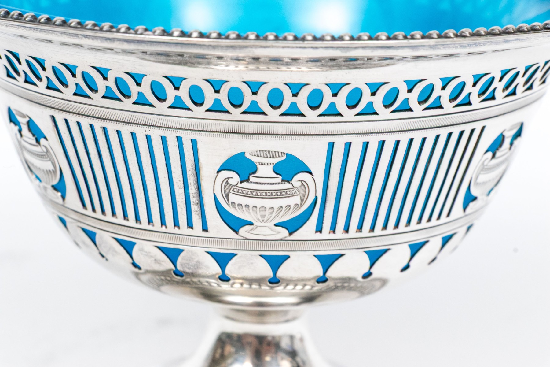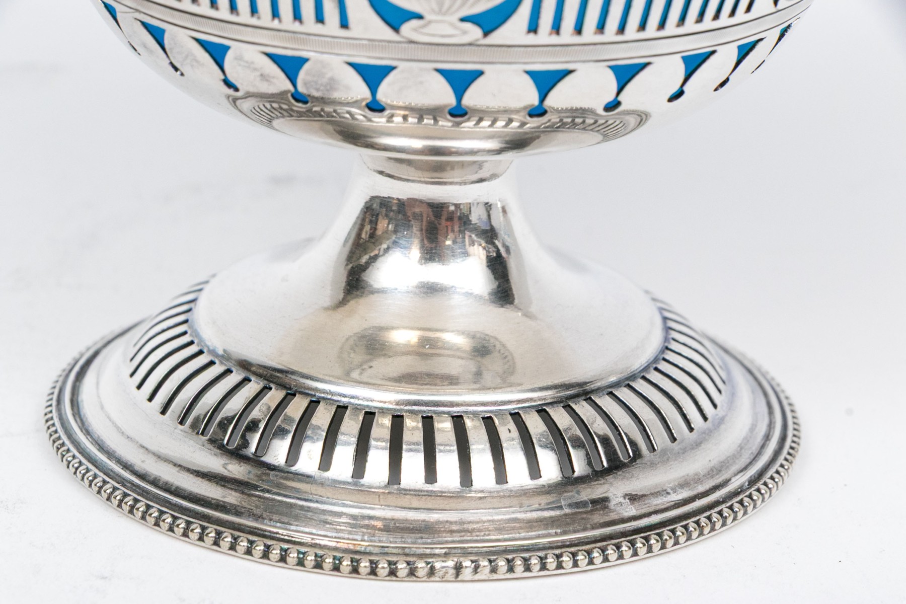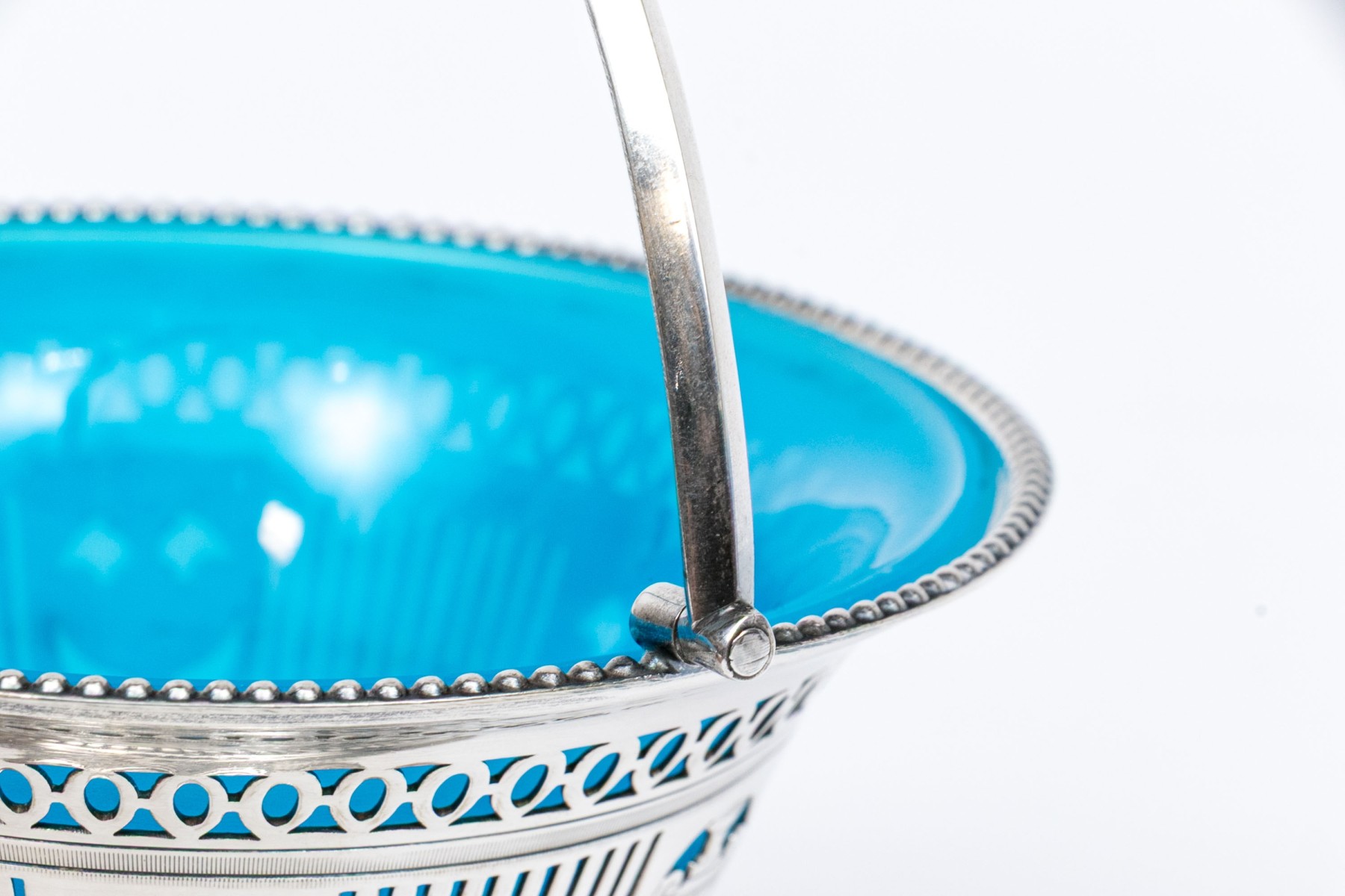 A footed silverplate basket with openwork sides with urn motifs and a swivel handle. With a removable blue opaline glass bowl.