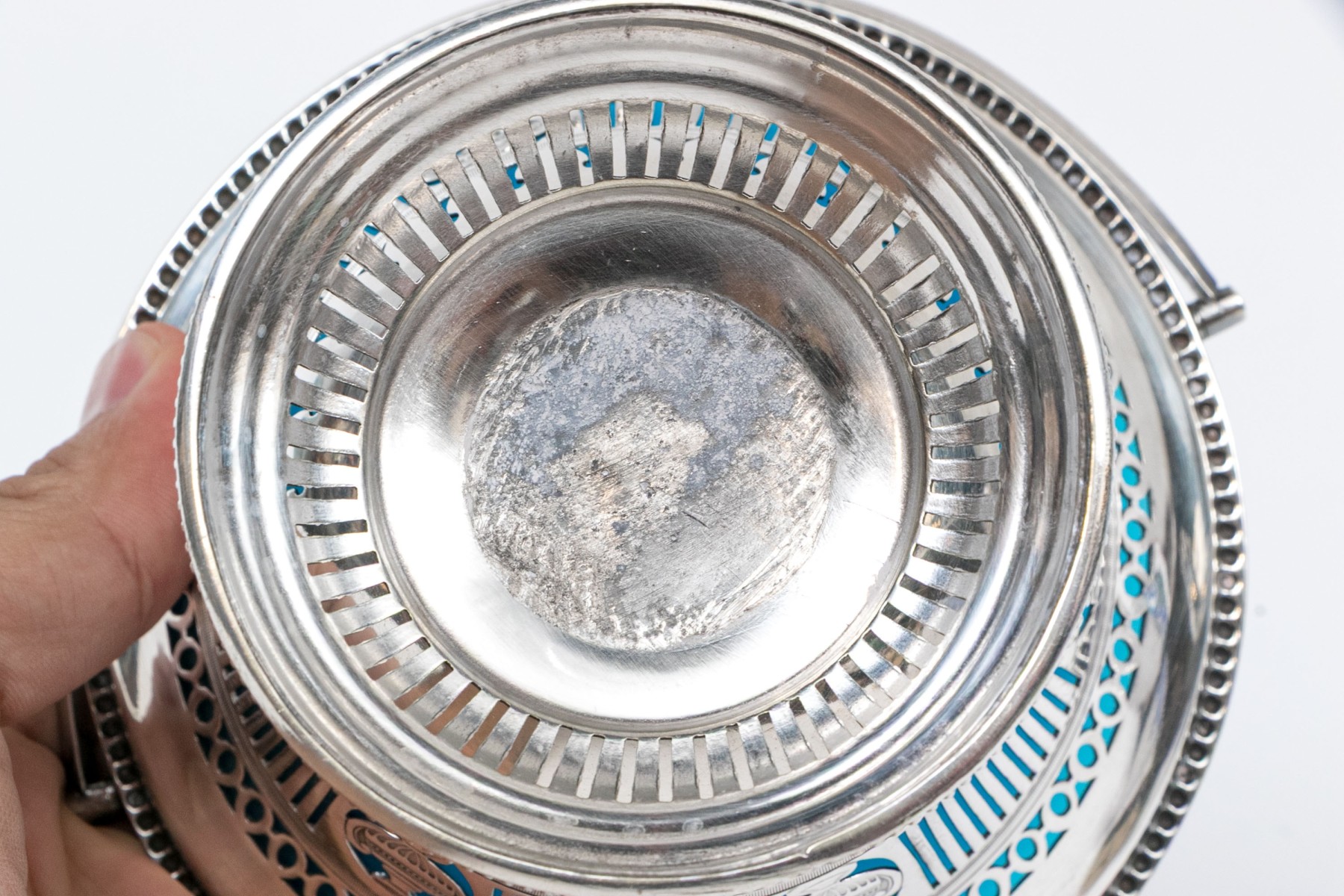 Condition: There is some wear around the inner silverplate rim and on the base. There are some scratches on the bowl underneath. Good shiny surfaces.