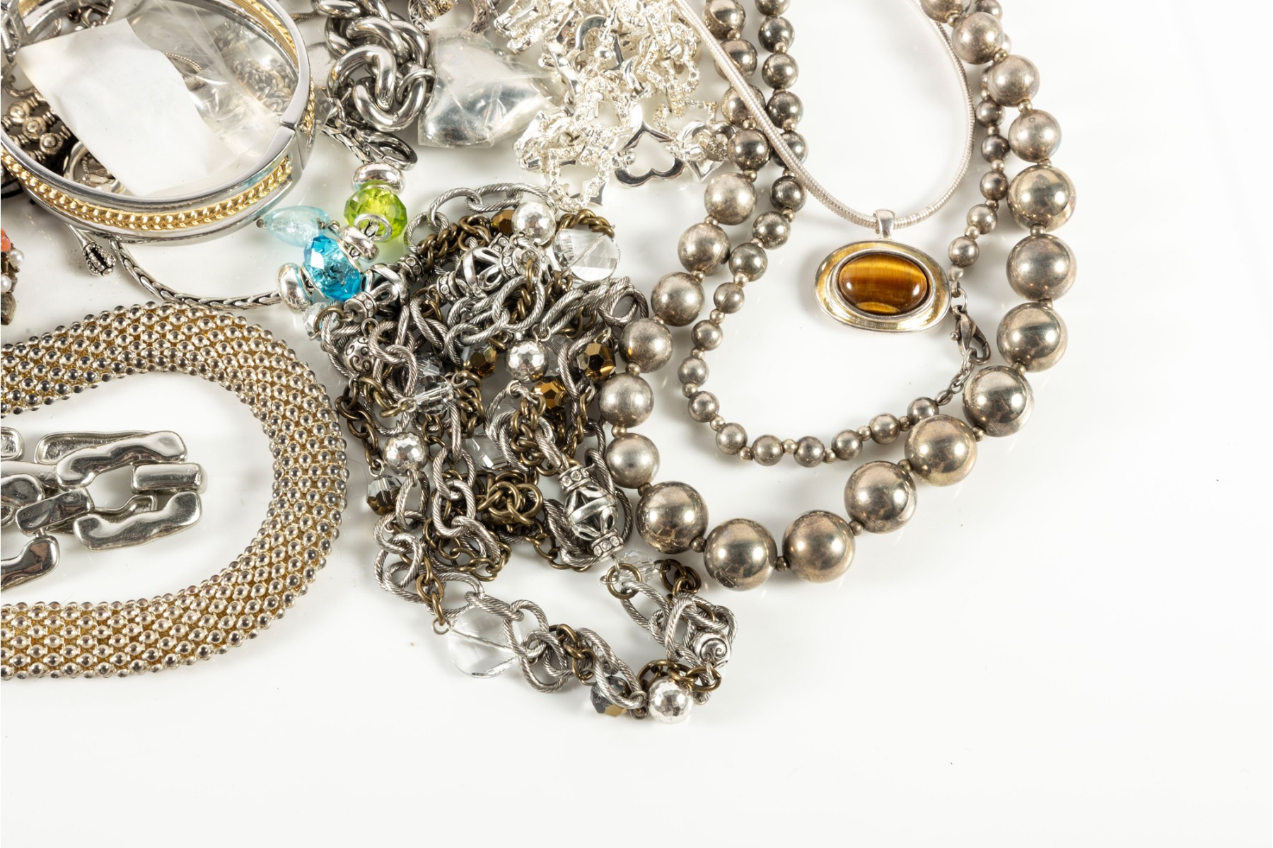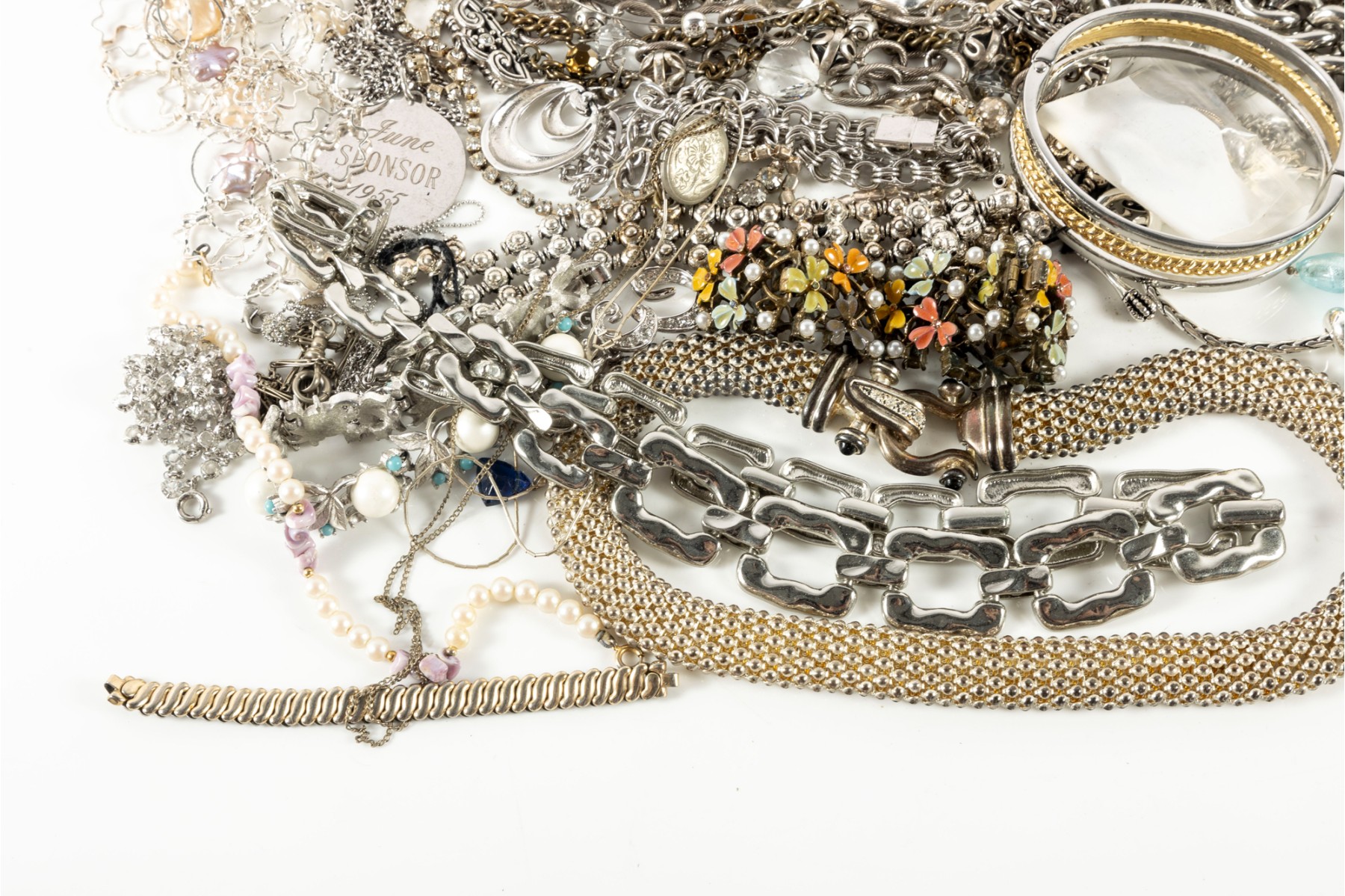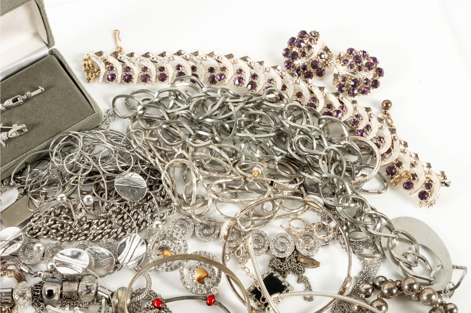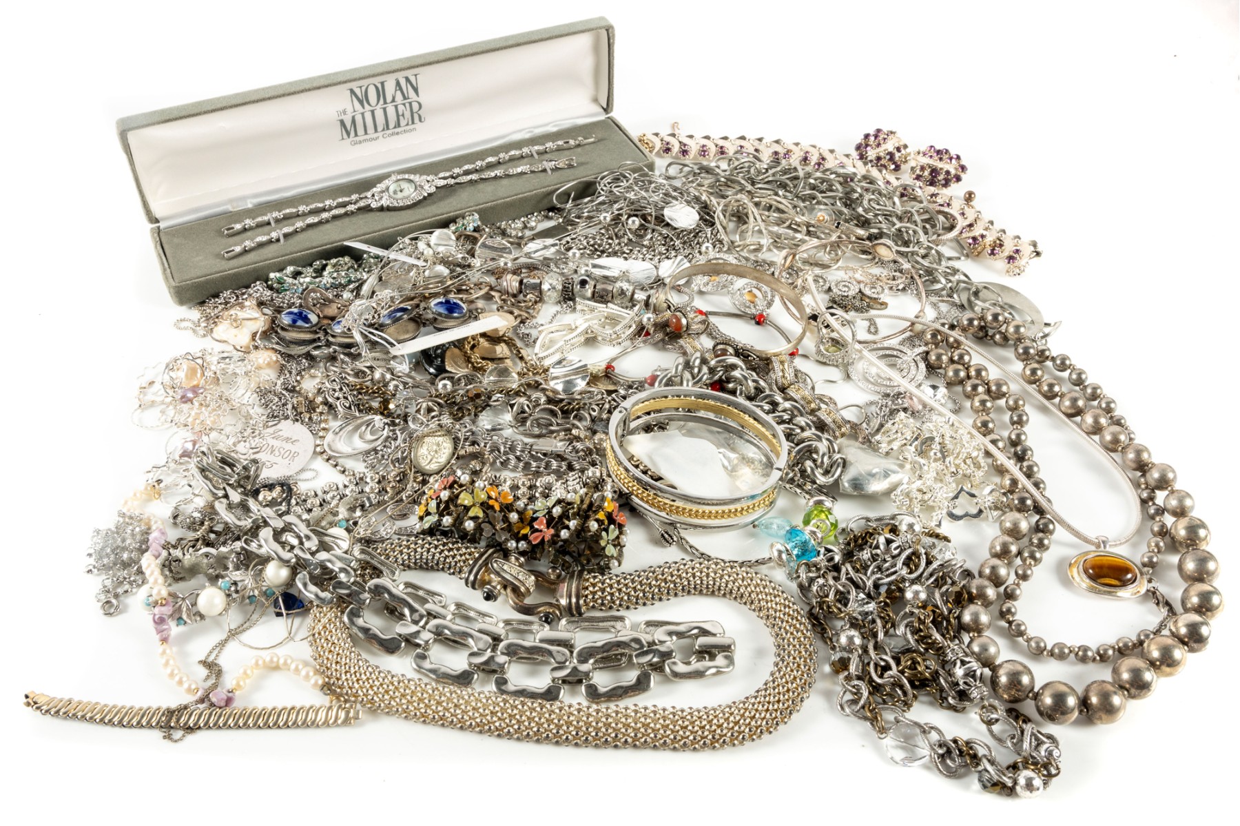 A substantial collection of silvertone fashion jewelry including faux pearls and rhinestone accents.