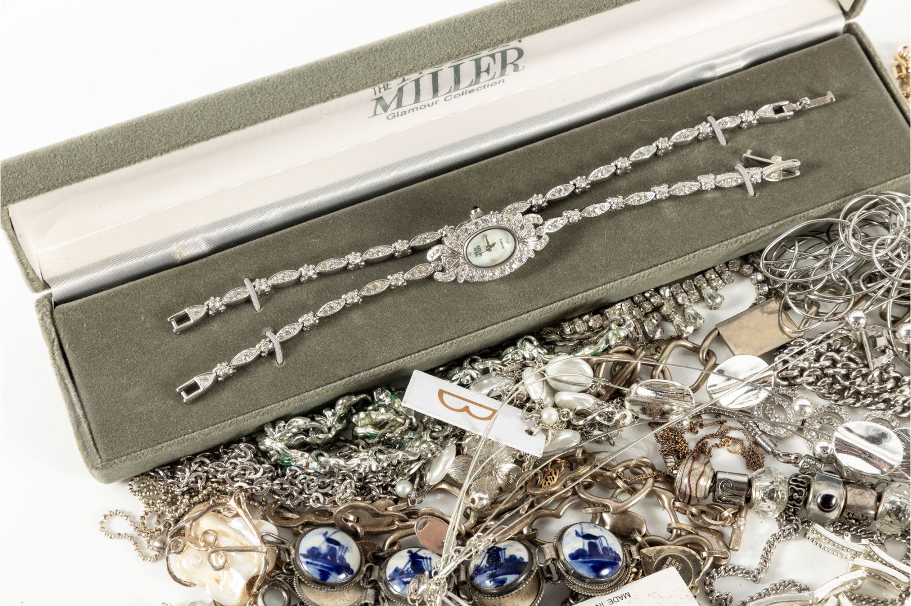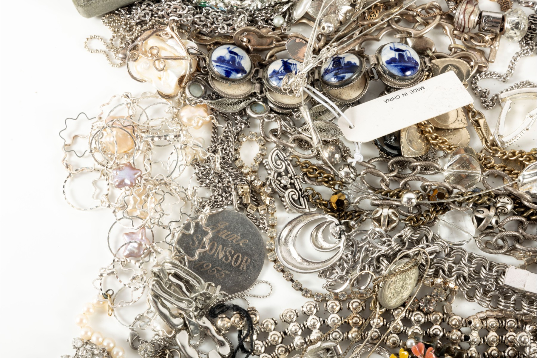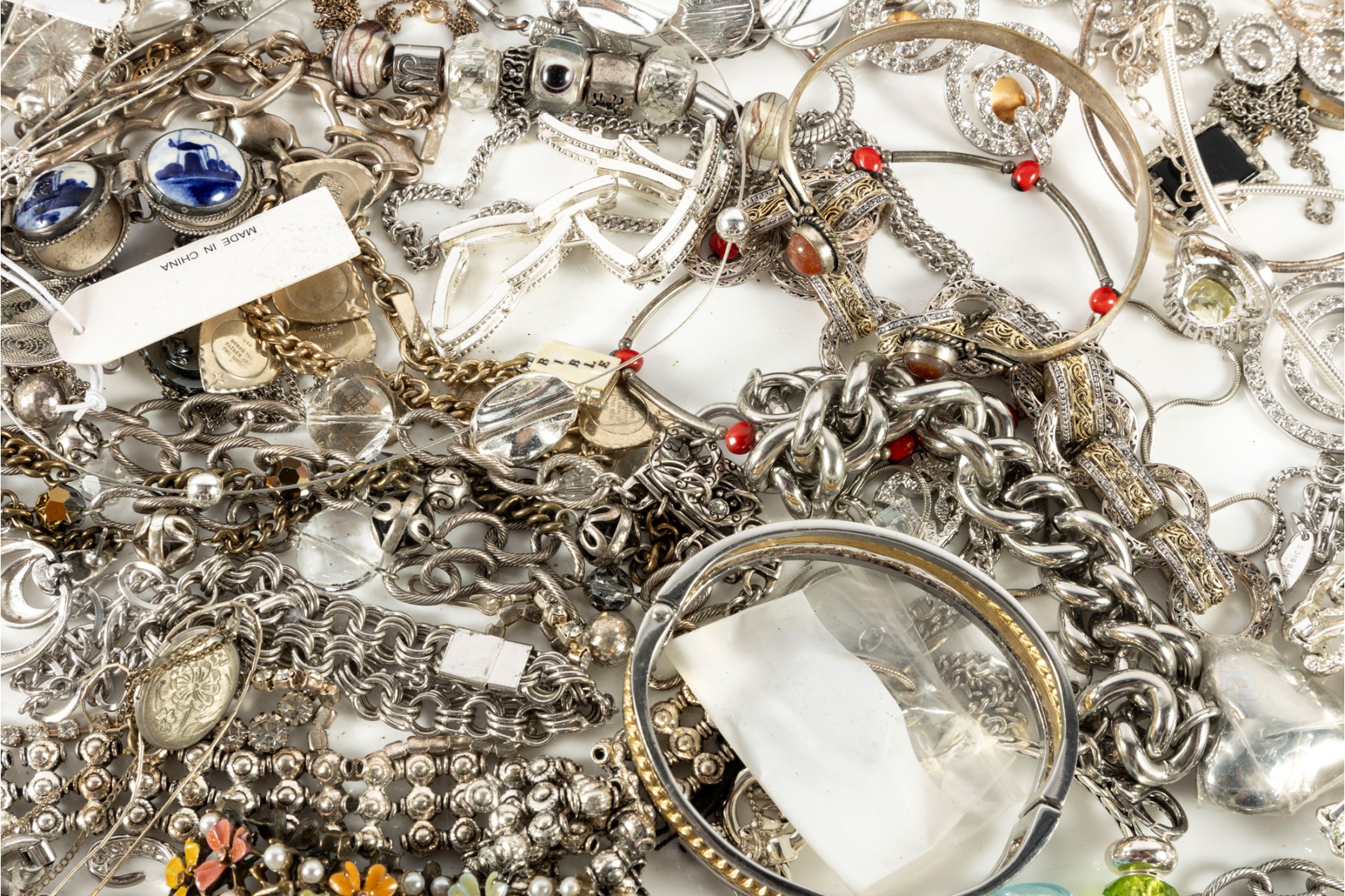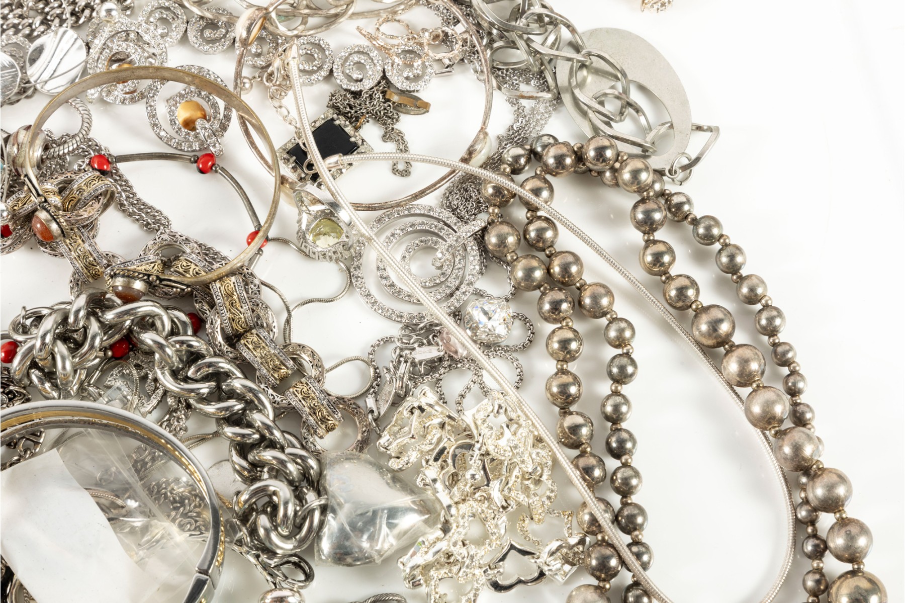 A substantial collection of silvertone fashion jewelry including faux pearls and rhinestone accents.
