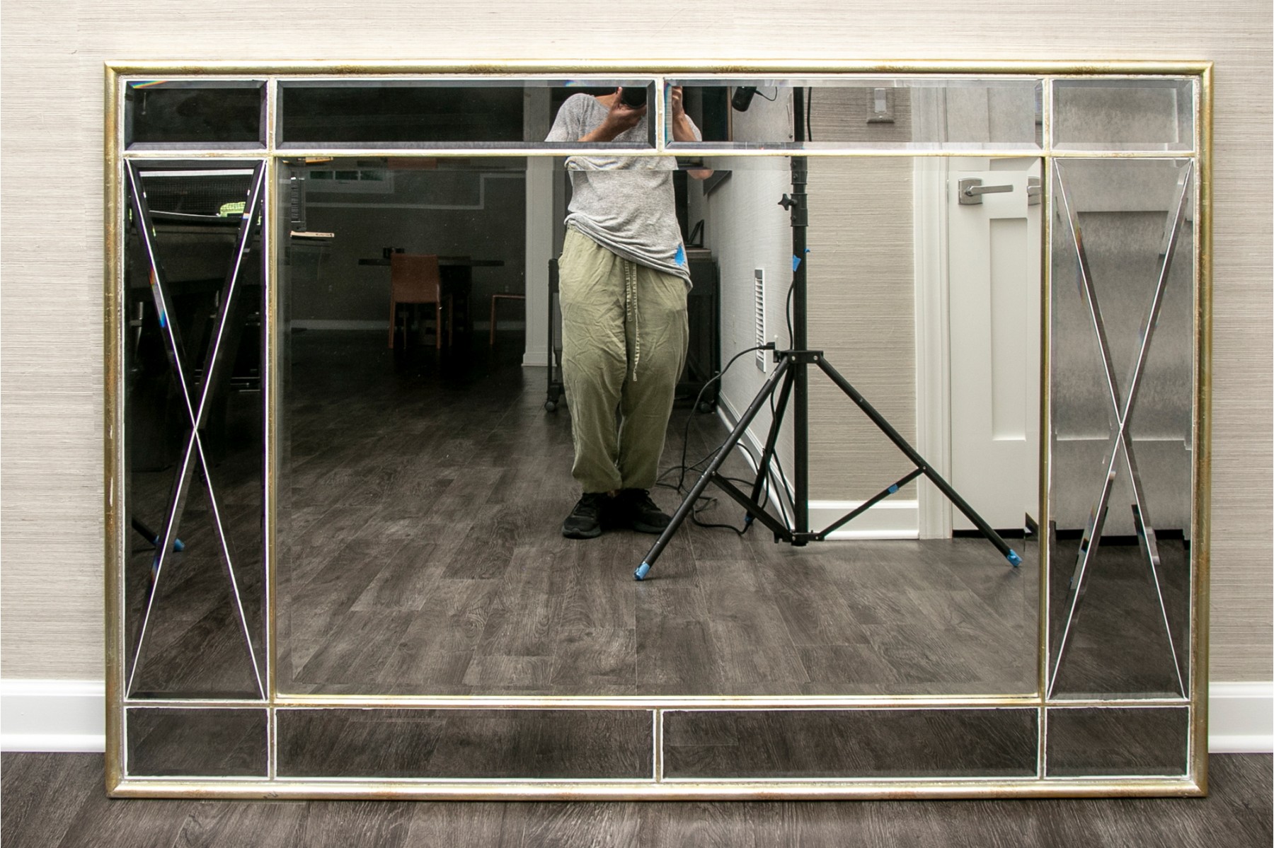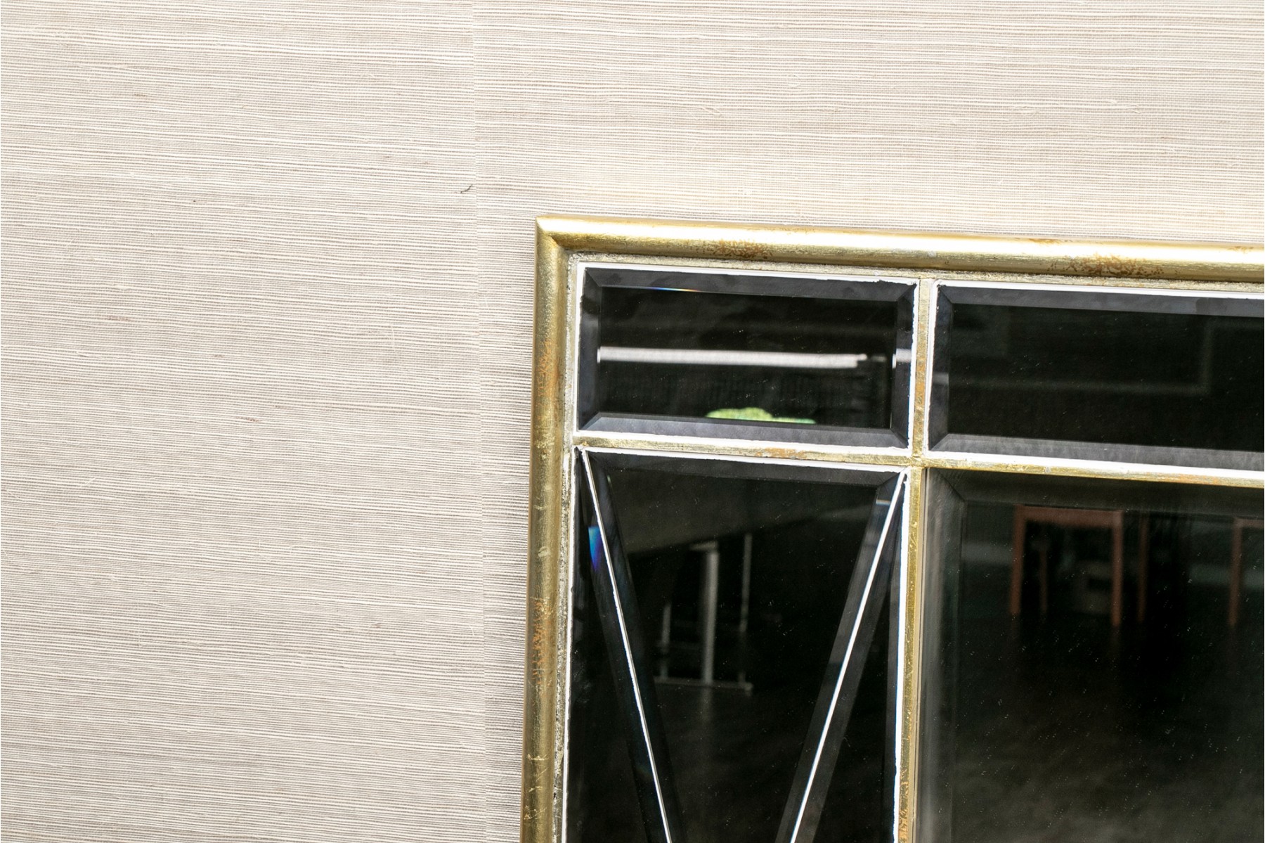 A large silvery gilt wall mirror with segmented design, each segment beveled. The side panels with X-form designs.
