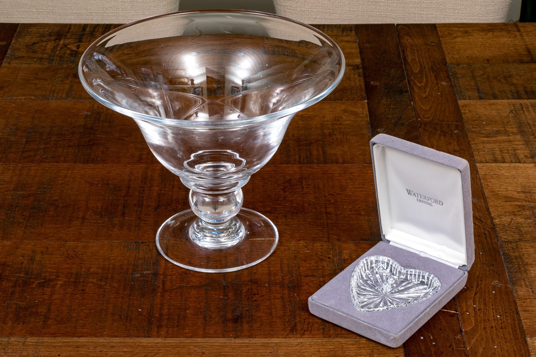 A Simon Pearce footed compote bowl, together with a Waterford crystal heart form ring dish in its original case.
